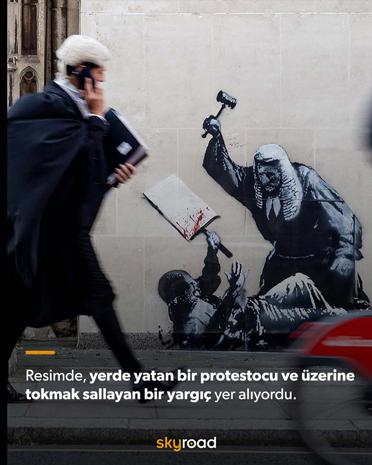 Dünyaca ünlü sokak sanatçısı Banksy'nin yargıcın protestocuyu darp ettiği anı anlattığı eseri silindi.