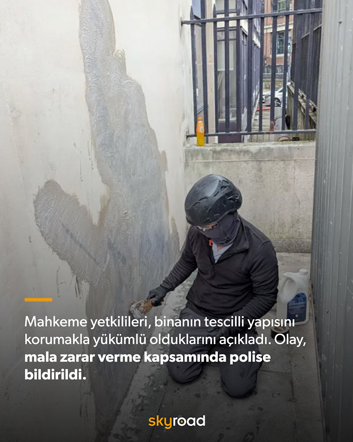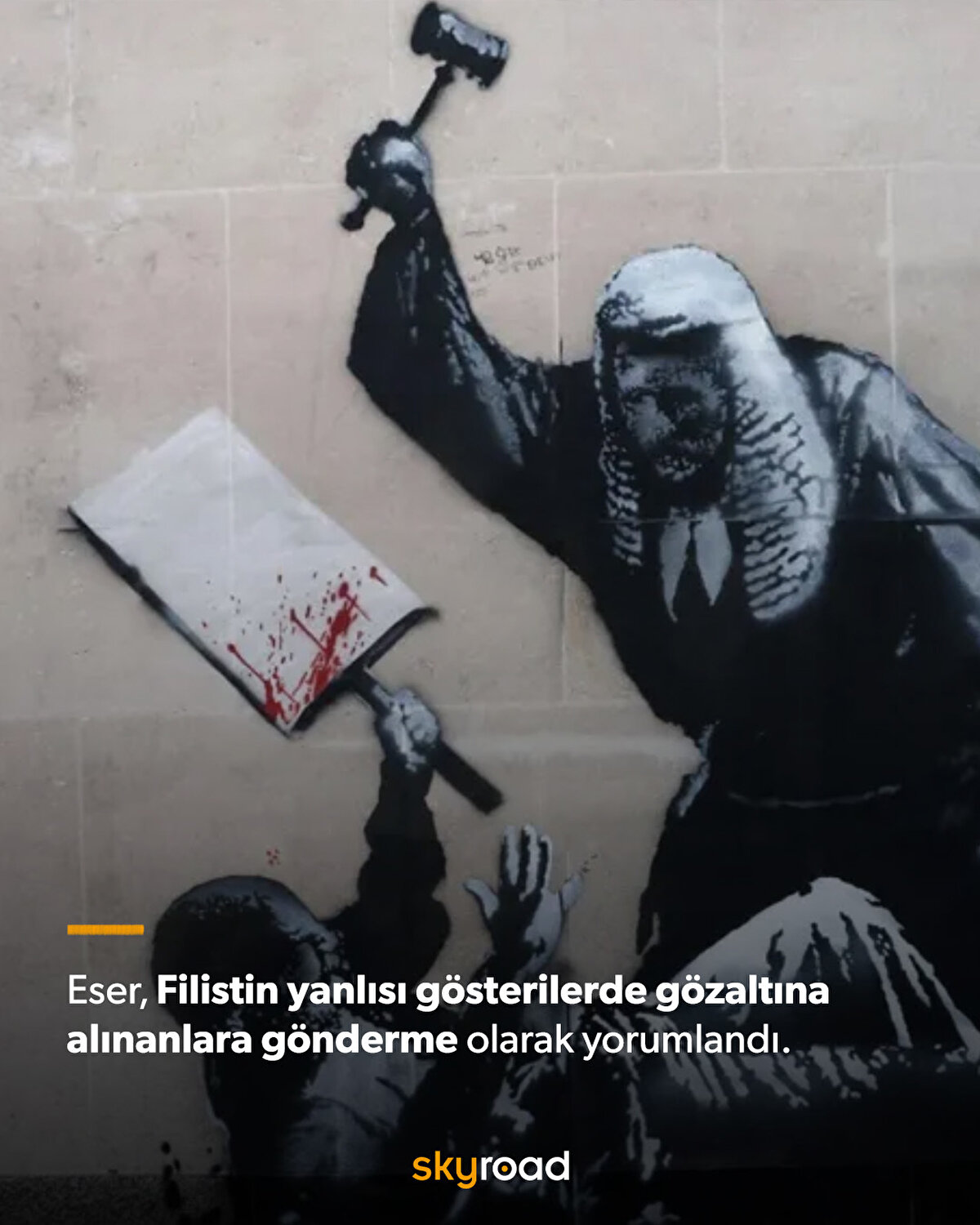 Eserde, yerde yatan bir protestocu ve üzerine tokmak sallayan bir yargıç tasvir edilmişti. Yapının “tarihi eser” statüsü nedeniyle kaldırılan çalışma, Filistin yanlısı gösterilere gönderme olarak yorumlandı.