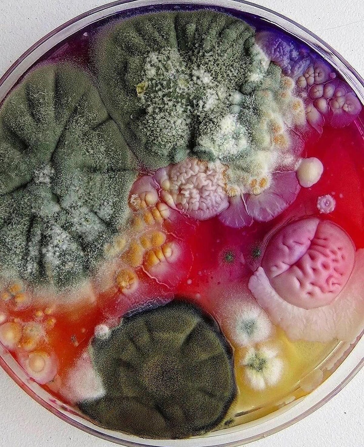 Çalışmalarıyla bilimin ve sanatın sınırlarını zorlayan @dashaplesen (Daria Fedorova), küfü benzersiz ve büyüleyici bakteri kompozisyonlarına dönüştürüyor. Dasha Plesen olarak bilinen sanatçı, petri kaplarını çeşitli bakteri ve diğer organizmalarla dolduruyor ve sonrasında peluş toplar, şekerler ve serpintiler gibi birbirinden farklı materyalleri kaba yerleştiriyor. Bu yapay eklemeler, çeşitli renk tonları ve yapılar üretmek için bakterilerin büyümelerini engelliyor ve tek bir kap içinde doygun renkler, tüy toplulukları ve tabii ki bolca bakterinin bulunduğu bu olağandışı kompozisyonlar ortaya çıkıyor.