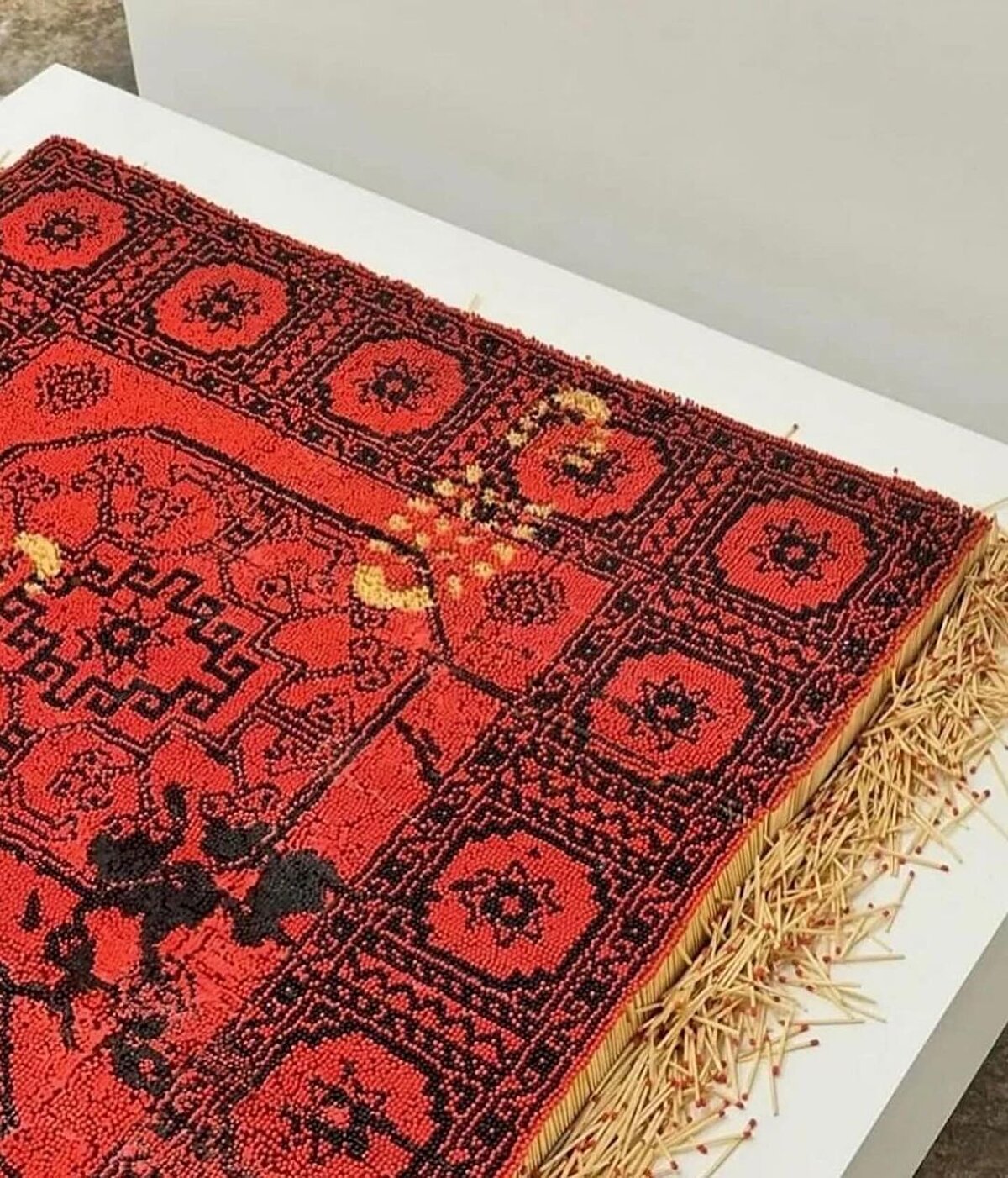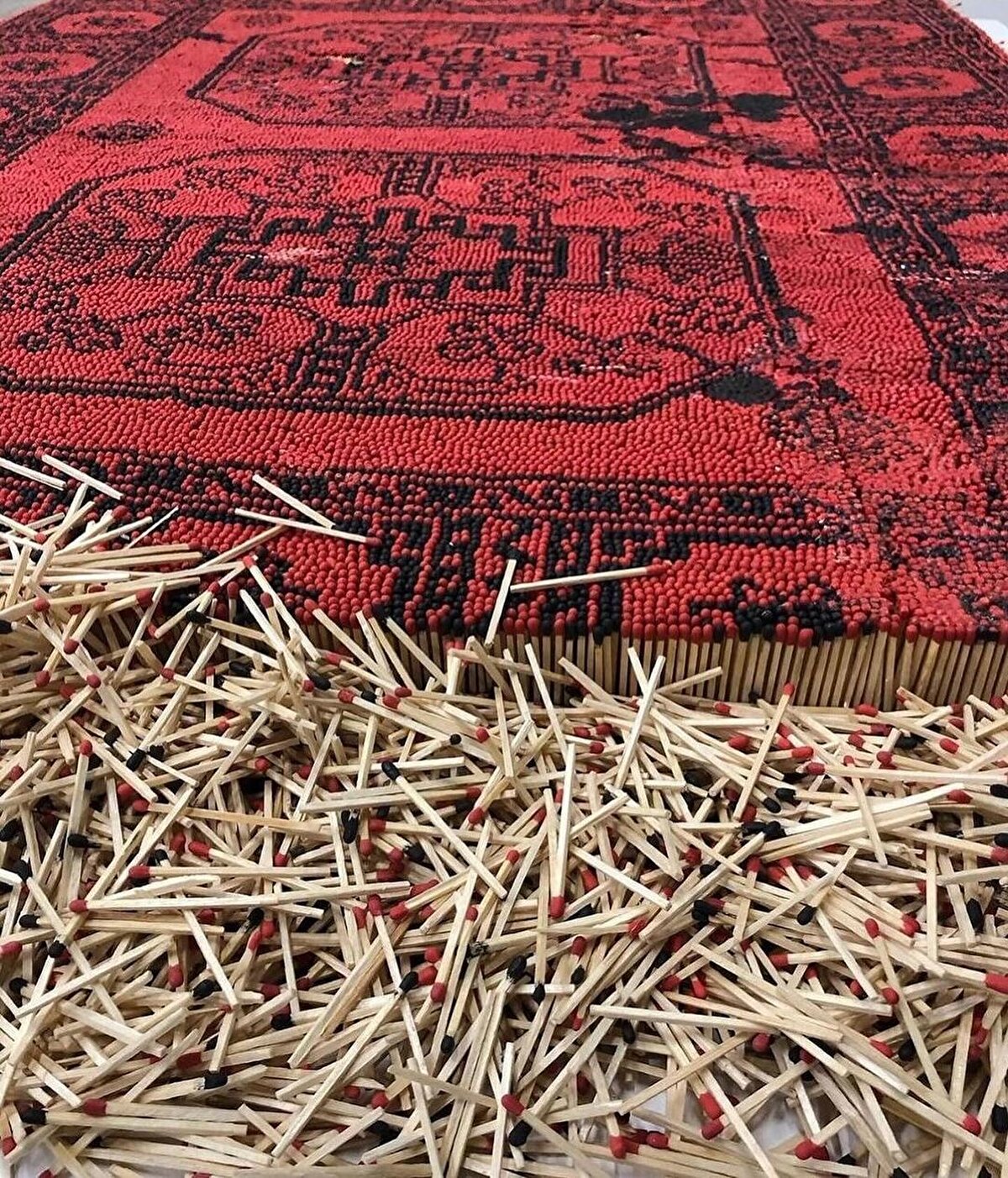 Sanatçı @rahnawardhadi, alt tabakasını bir kalıba sabitlediği kırmızı ve siyah kibritleri bir öncekinin düzeni bozmayacak şekilde dizmiş ve dış çevresine de halının püsküllerini simgeleyen, yere yıkılmış kibritler sabitlemiş. Esere yukarıdan bakıldığında halının üzerine basılmış bir ayak izi olduğunu da görebilirsiniz. Titizlikle yapılmış bu sanat eseri, hayal gücünün yönelttiği farklı bir sanat üslübuna dönüşmenin harika örneklerinden biri diyebiliriz.