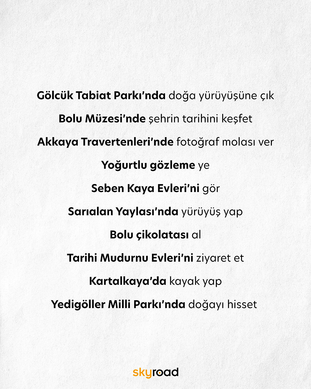 Yılın her mevsimi ayrı bir güzellik sunan Bolu, muhteşem doğası, enfes yemekleri ve büyüleyici tabiat parkları ile her yıl binlerce kişiye ev sahipliği yapıyor. El değmemiş doğal güzellikleri ile tüm dünyadan fotoğrafçıları ve kampçıları kendine çekiyor. Sizin için hazırladığımız listeyle şehrin gürültüsünden ve tüm haftanın yoğunluğundan uzakta size huzur verecek bir hafta sonu deneyimi yaşayabilirsiniz.