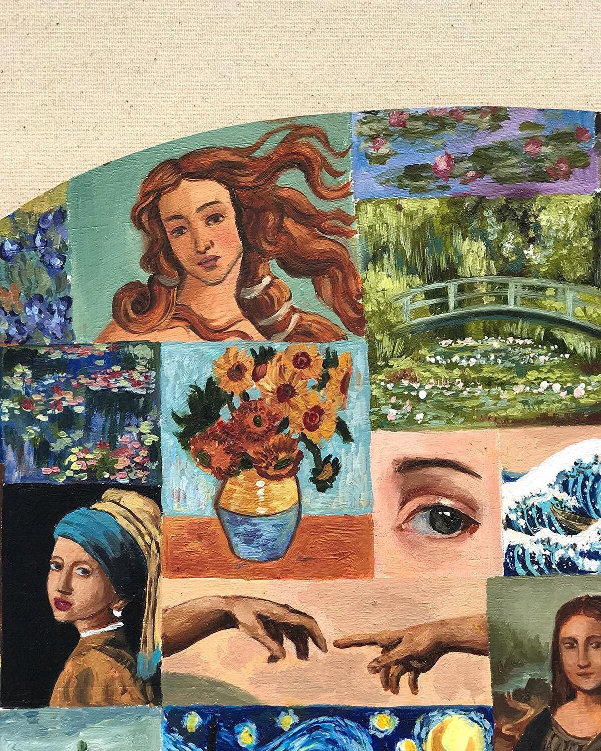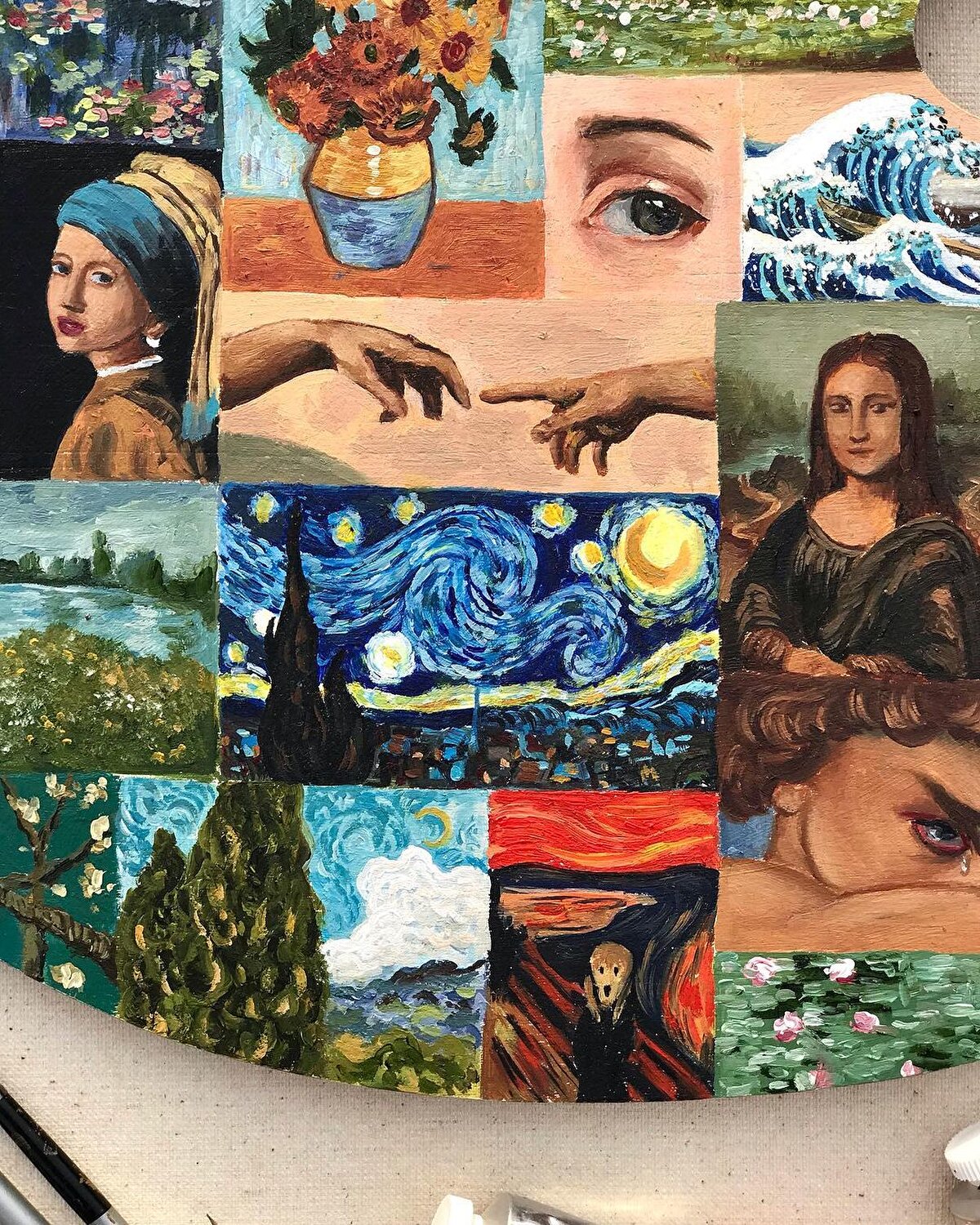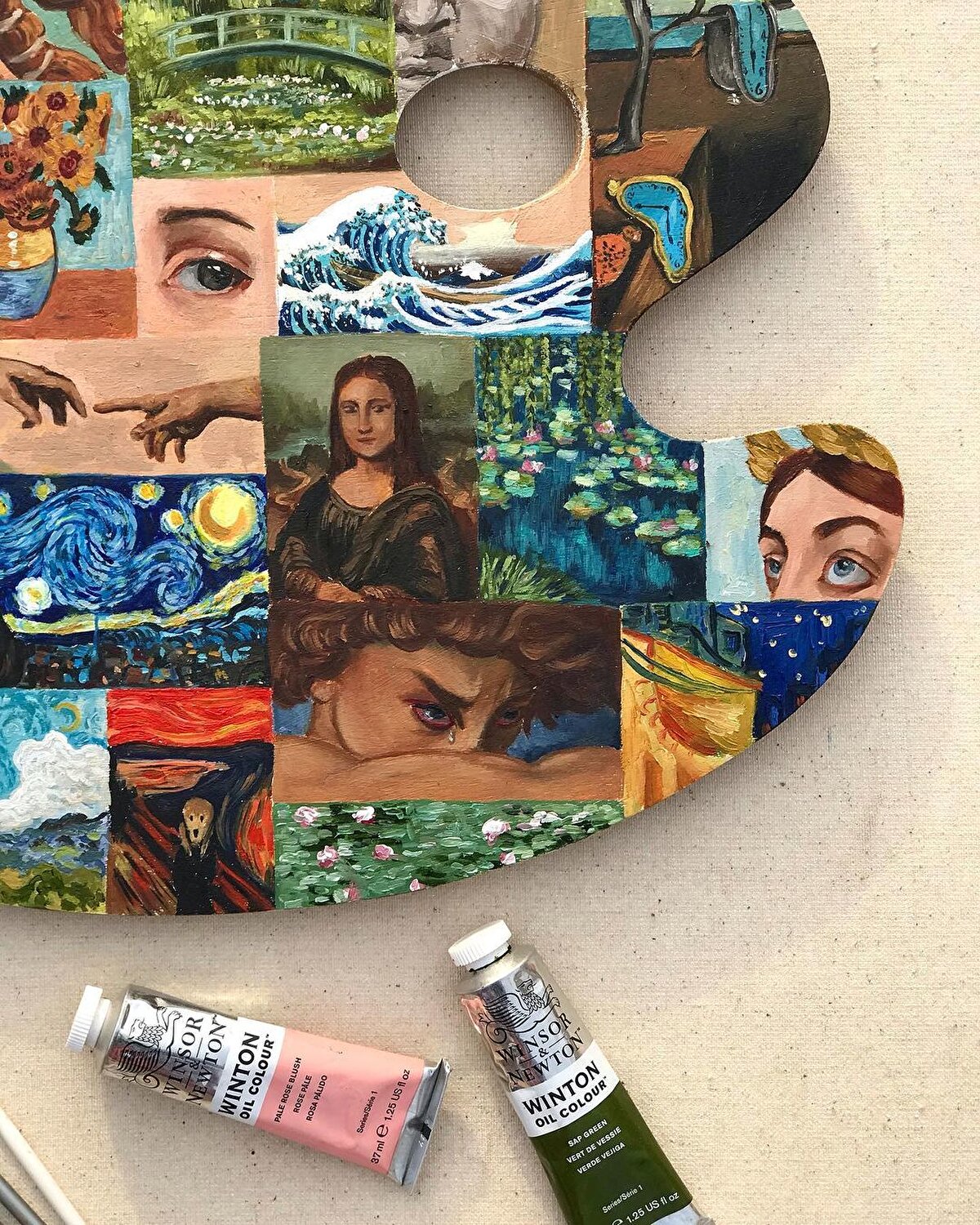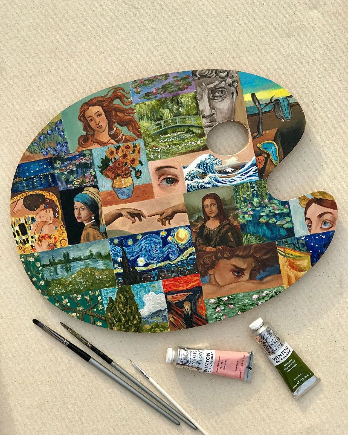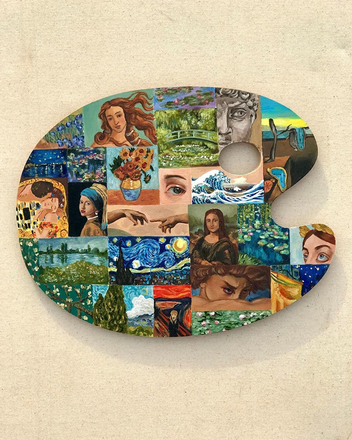 Tek kelimeyle muhteşem bi' eser ortaya çıkaran Pakistanlı sanatçı Rimsha Atif Gondal, Leonardo da Vinci'den Van Gogh'a kadar birçok ünlü sanatçının eserlerini tek bir palette topladı. @the__palette__ 'Şaheser Koleksiyonu' adını verdiği bu muhteşem çalışmada, Eriyen Saatler, Yıldızlı Gece, İnci Küpeli Kız, Mona Lisa, Adem'in Yaratılışı, Çığlık, Venüs'ün Doğuşu ve daha birçok eseri tek bir paletin içerisine sığdırarak sanat içinde sanat olarak isimlendirebileceğimiz bir çalışma yaptı. Akrilik ve yağlı boya üzerine çalışmalar yapan Rimsha Atif Gondal, ahşap palet üzerine yaptığı eserinin her noktasına kalbini ve ruhunu katarak çizdiğini ifade ediyor. Şaheser Koleksiyonu olarak adını tam anlamıyla hak eden bu orijinal çalışmanın her bloğu ve her noktası sanatseverleri büyülemeye yetiyor.