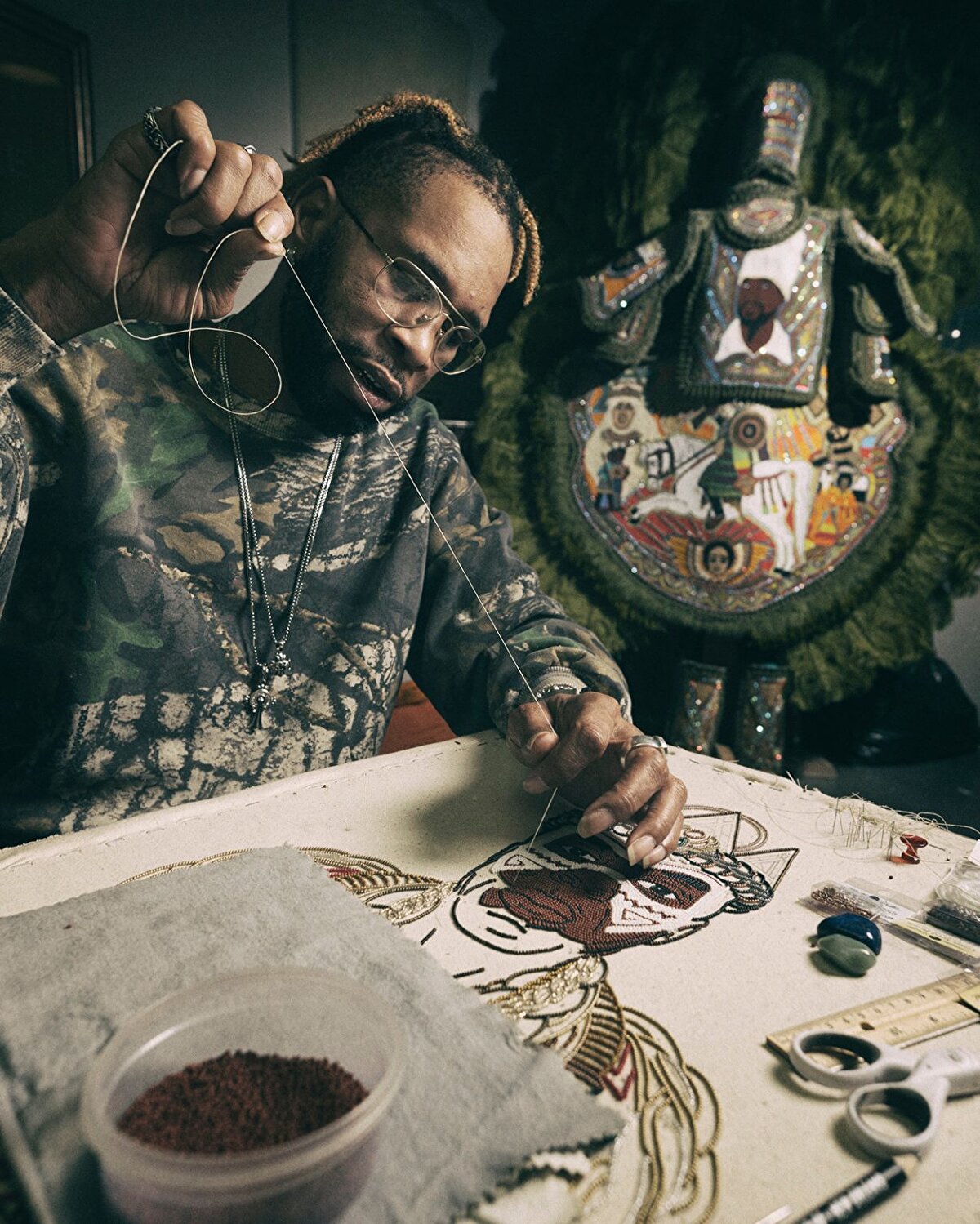 Bir iğne ve iplik, cam boncuklar, tuval ve çokça zaman. Bunlar, New Orleans merkezli sanatçı Demond Melacon'un Black Masking takımları ve çağdaş sanat portre serilerini üretmek için kullandığı malzemeler. Son beş yıldır bu işi yapsa da Melancon'un hikayesi çok daha erken tam 20 yıl öncesine dayanıyor.
