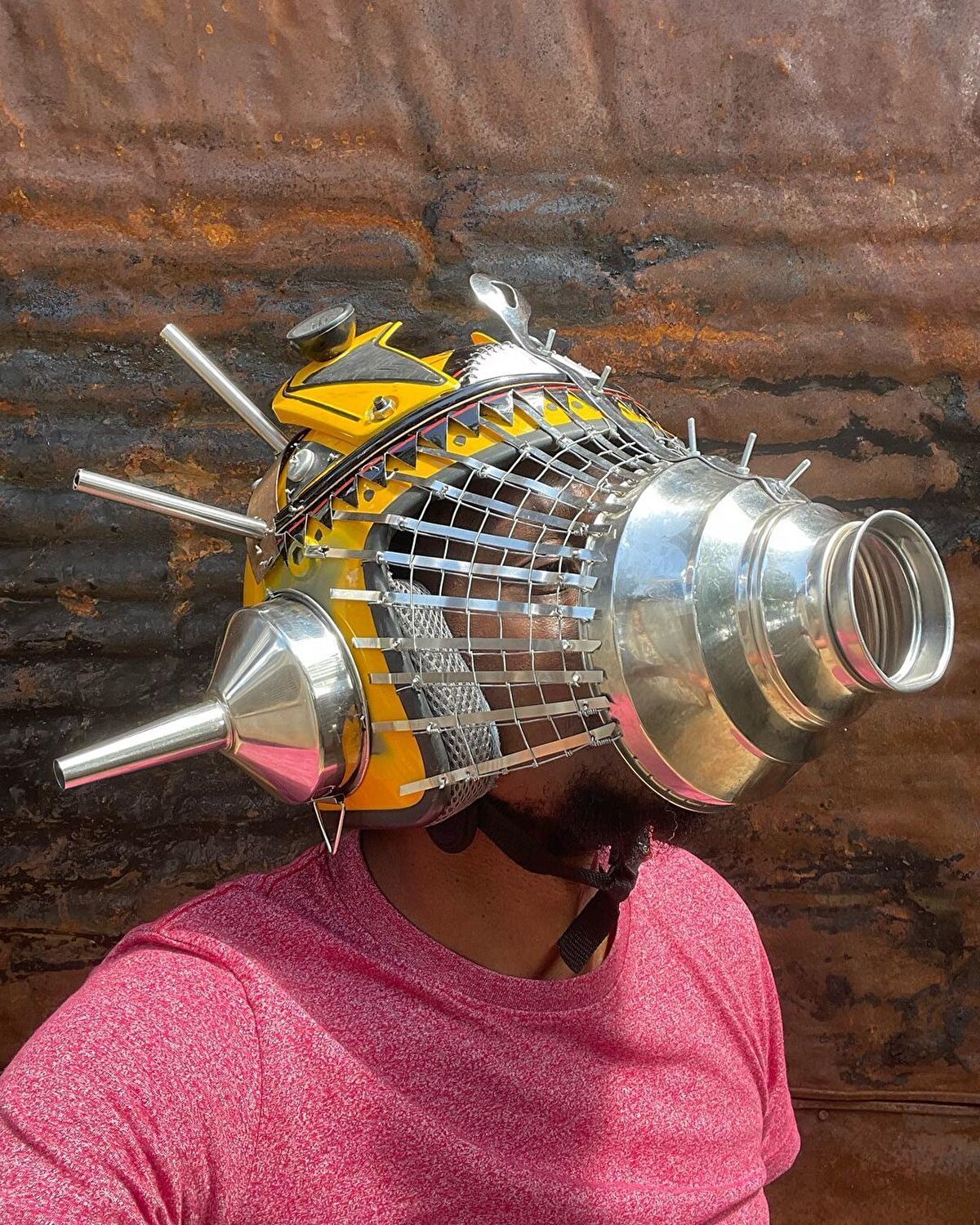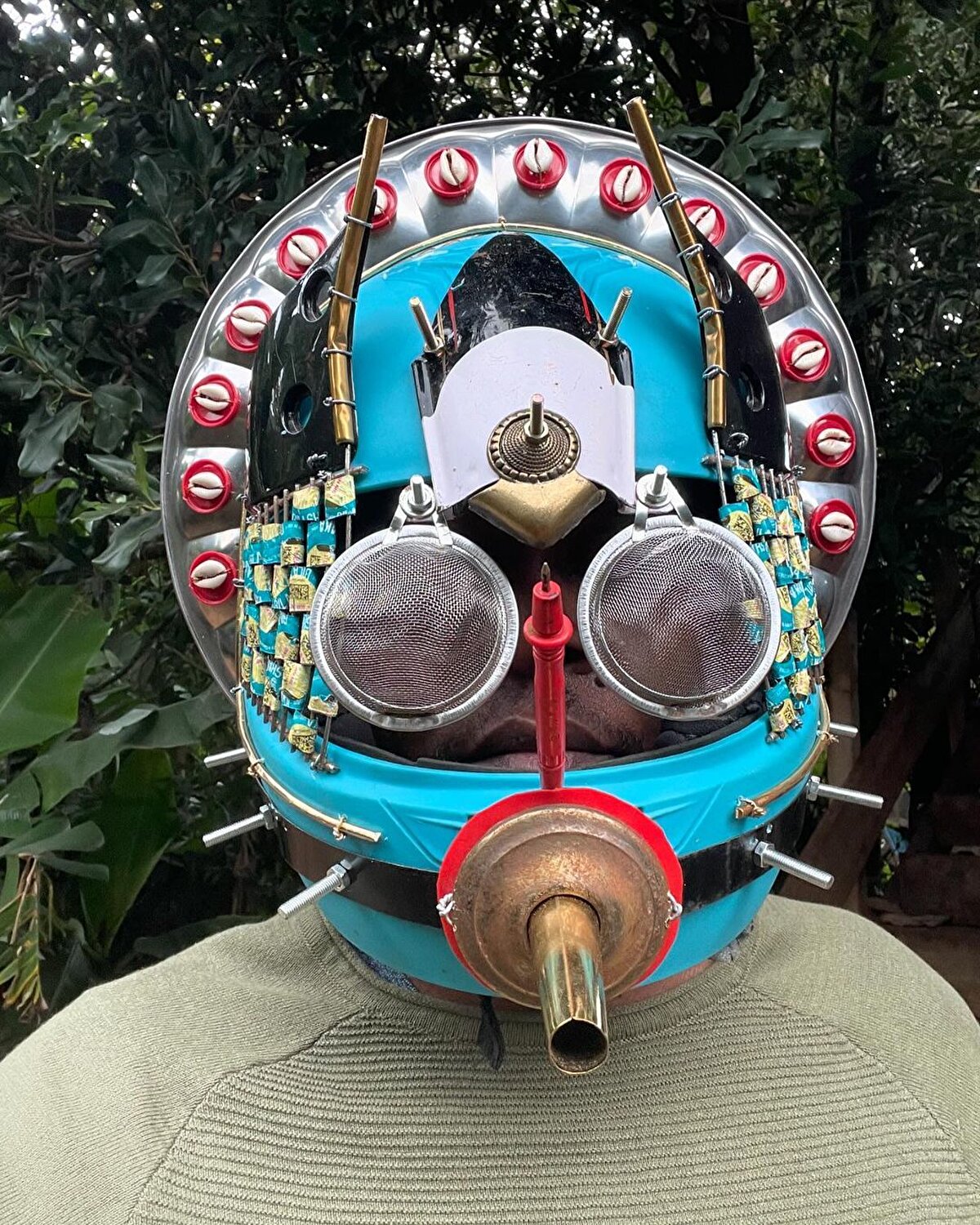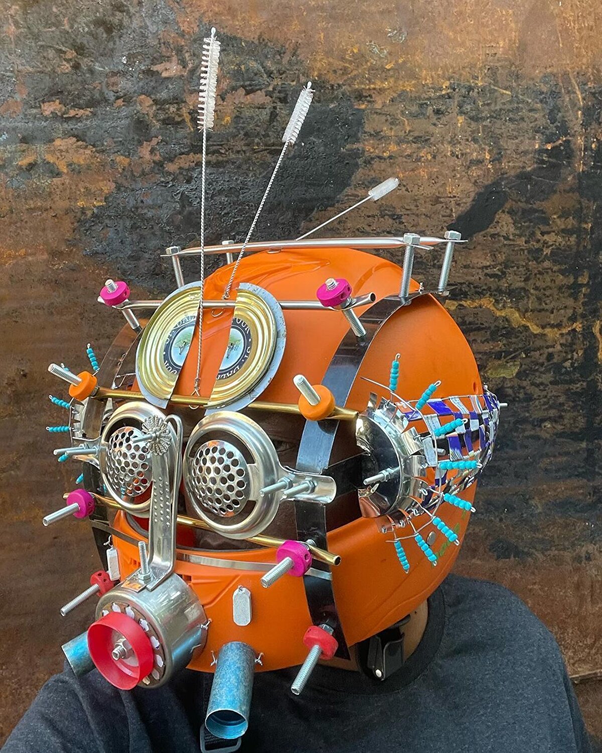 Hayal gücü ve dönüşümün birleşiminden faydalanan @ckabiru, plastik ve metal gibi malzemeleri kullanarak oksijen maskesini andıran ilginç maskeler tasarlıyor. Gözleri süzgeçlerden, kafa üstündeki korumalık ve süslemeleri ise boncuklar ve farklı materyallerden oluşturarak, her ülkeye özgü modellerle maskeler üretiyor. Bazı çalışmaları dekoratif eşyalar gibi görünse de, her açıdan farklı bir ruh hali yansıtan ve binlerce parçadan oluşan bu maskeler, kimine motorcu kaskını kimine ise maskeyi anımsatıyor. Renkli dokunuşlarıyla eserlerine özgünlük katan sanatçı, günlük hayatta kullandığımız nesneleri alışılmadık formlarda sunuyor.