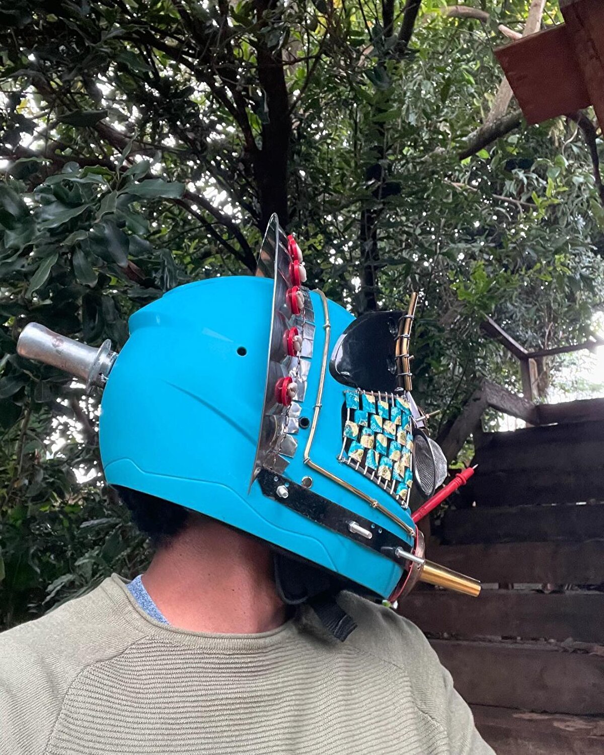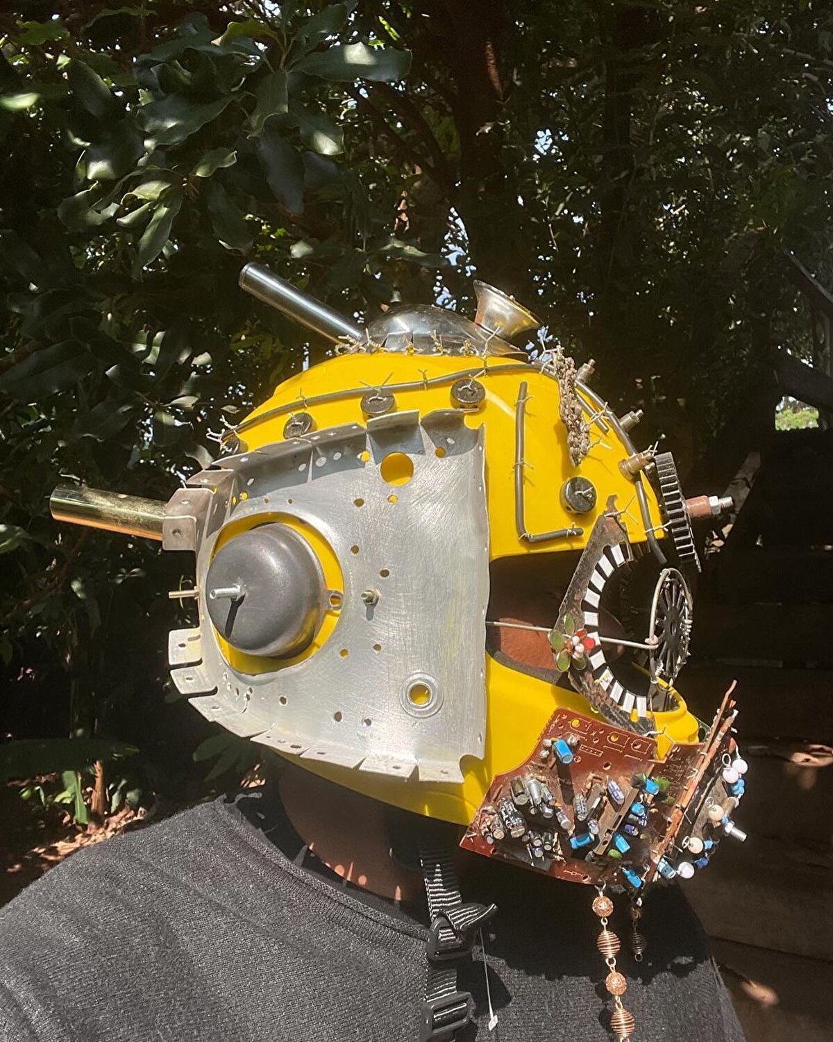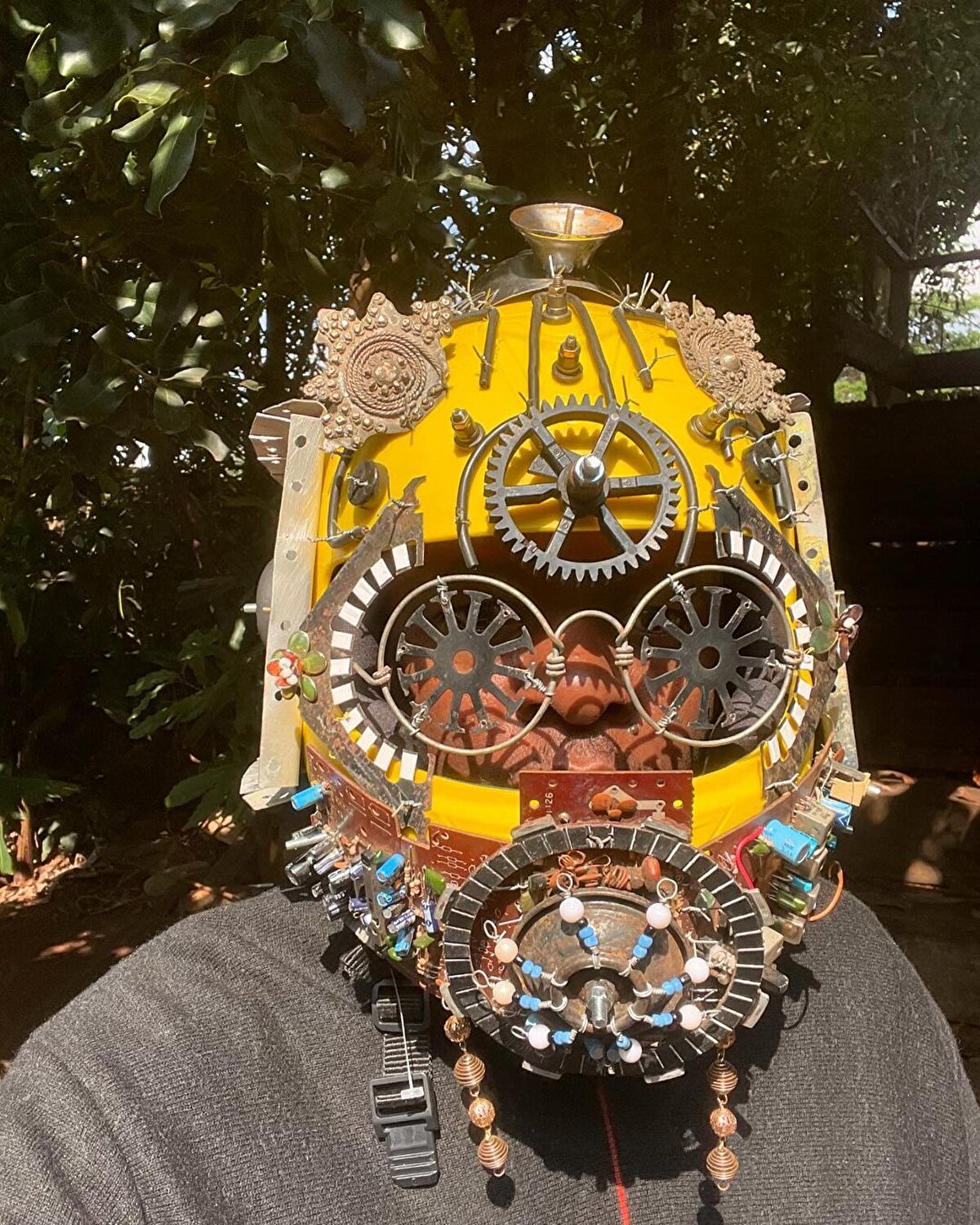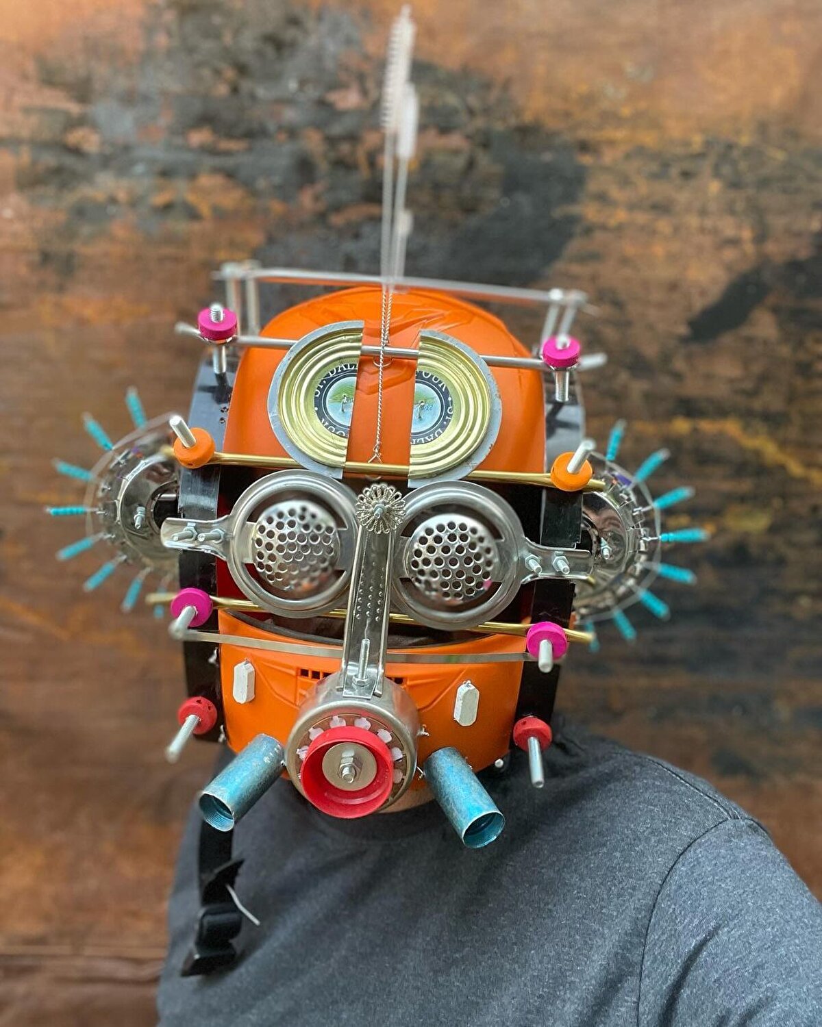 Hayal gücü ve dönüşümün birleşiminden faydalanan @ckabiru, plastik ve metal gibi malzemeleri kullanarak oksijen maskesini andıran ilginç maskeler tasarlıyor. Gözleri süzgeçlerden, kafa üstündeki korumalık ve süslemeleri ise boncuklar ve farklı materyallerden oluşturarak, her ülkeye özgü modellerle maskeler üretiyor. Bazı çalışmaları dekoratif eşyalar gibi görünse de, her açıdan farklı bir ruh hali yansıtan ve binlerce parçadan oluşan bu maskeler, kimine motorcu kaskını kimine ise maskeyi anımsatıyor. Renkli dokunuşlarıyla eserlerine özgünlük katan sanatçı, günlük hayatta kullandığımız nesneleri alışılmadık formlarda sunuyor.