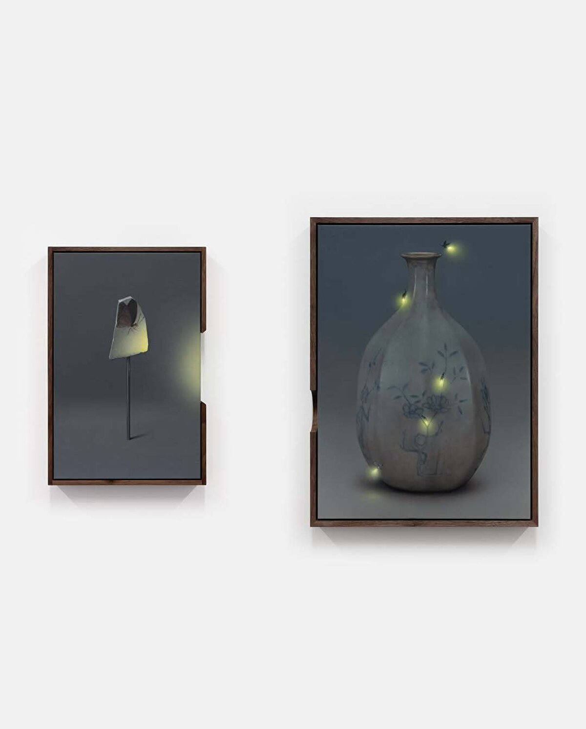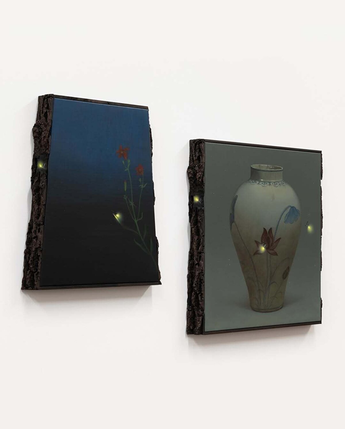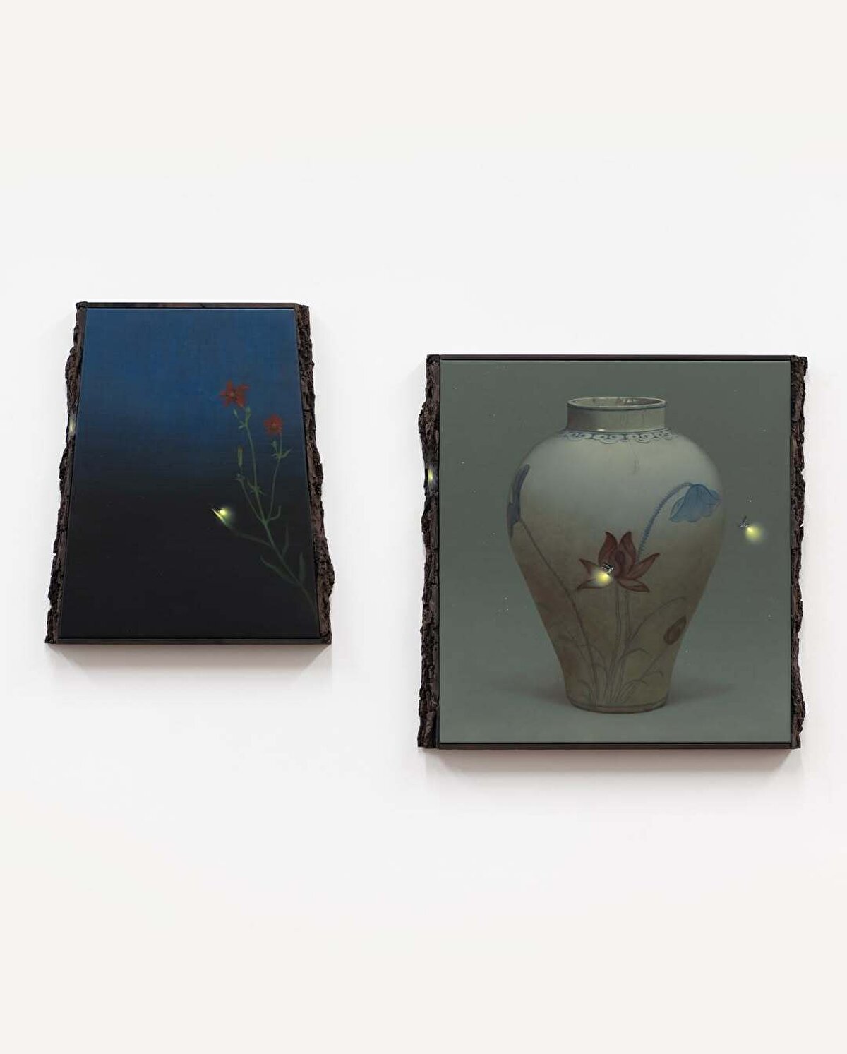 Keten üzerine birkaç çanak-çömlek parçası konumlandırıp ateş böceği ve kelebek gibi çeşitli kanatlı, narin hayvan figürleri çizen @dabinahn, kurduğu bu somut senaryoları ceviz ağacından yapılmış çerçevelerin içine yerleştiriyor.