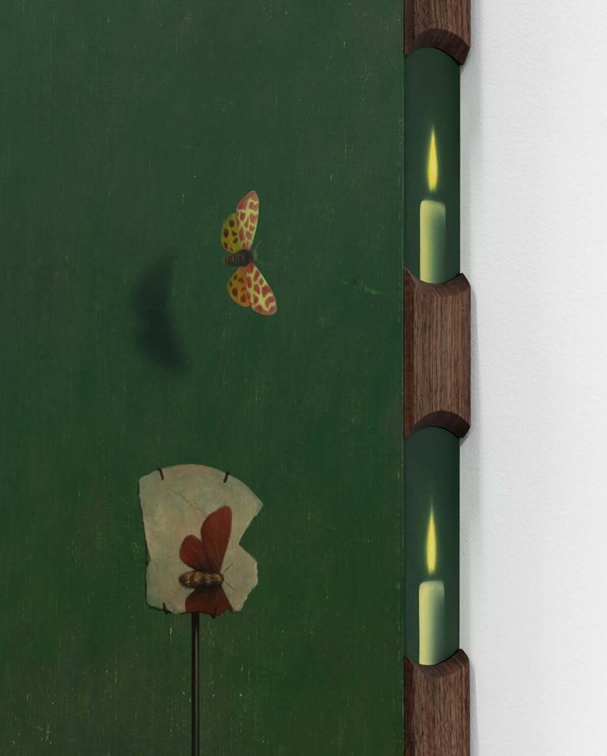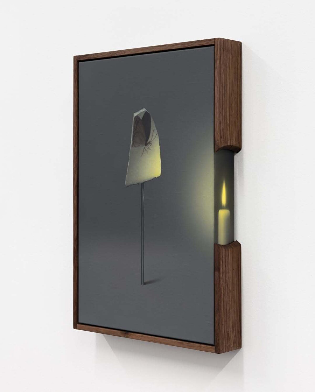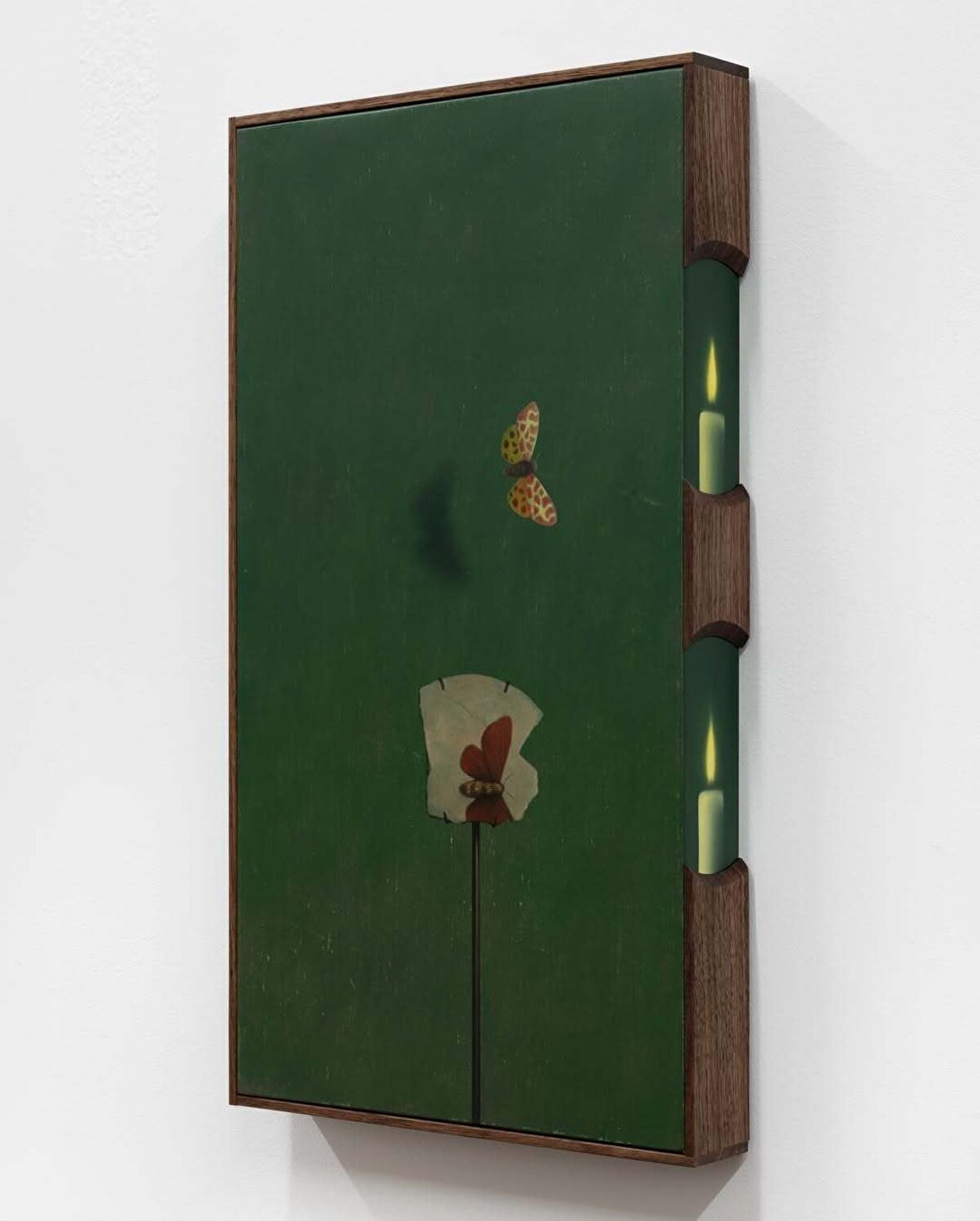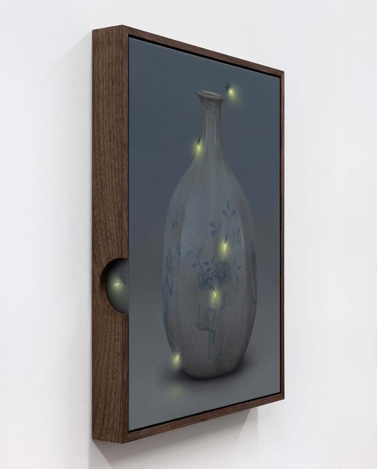 Keten üzerine birkaç çanak-çömlek parçası konumlandırıp ateş böceği ve kelebek gibi çeşitli kanatlı, narin hayvan figürleri çizen @dabinahn, kurduğu bu somut senaryoları ceviz ağacından yapılmış çerçevelerin içine yerleştiriyor.