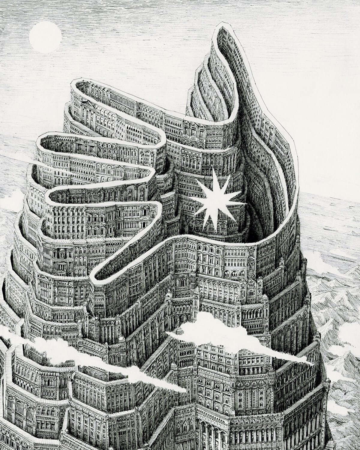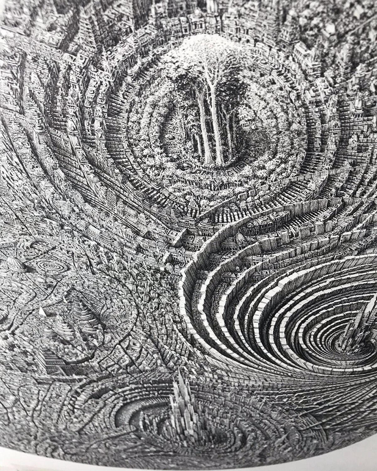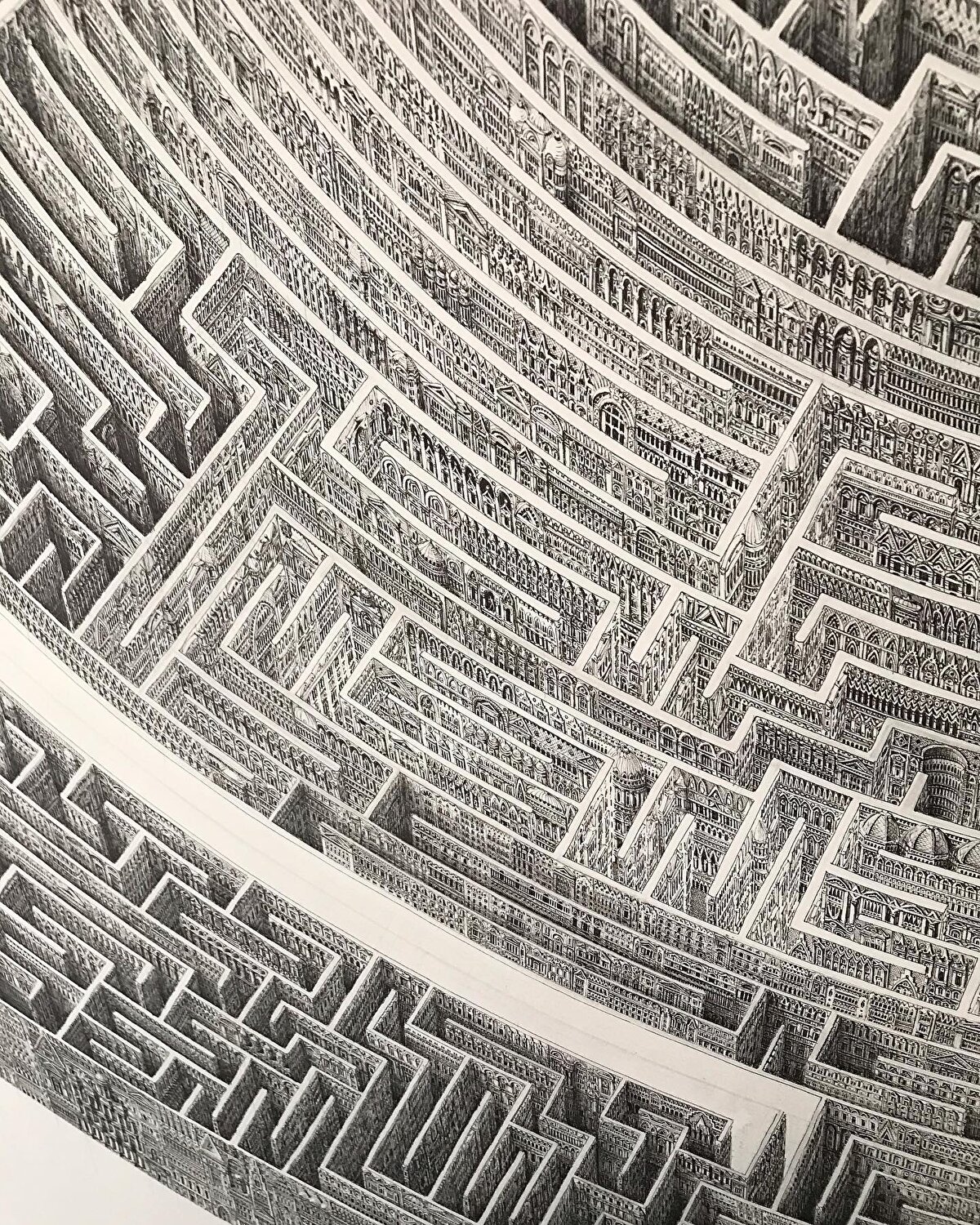 Düzen ve kaos bir arada görmeye alışık olmadığımız iki kavram. Fakat Benjamin Sack'in hayali ortamlarında, distopik yapılara benzeyen köşeli labirentler, birini diğerinden ayırt etmenin zor olduğu birbirine çok yakın binalar ve spiral çizen labirent yürüyüş yolları bulmak alışılmadık bir şey değil. Kalem ve mürekkeple çalışan sanatçı, düzen ve kaos arasında bocalayan girift siyah-beyaz metropoller çiziyor. Hem geleneksel mimari hem de gerçeküstü eklemelerle dolu kafa karıştırıcı haritalar oluşturmak için geometri, açılar ve boyutla oynuyor. Nota anahtarı, şekiller ve baş döndürücü çizgi ve nokta çalışması bu eserlerin ortak noktaları.