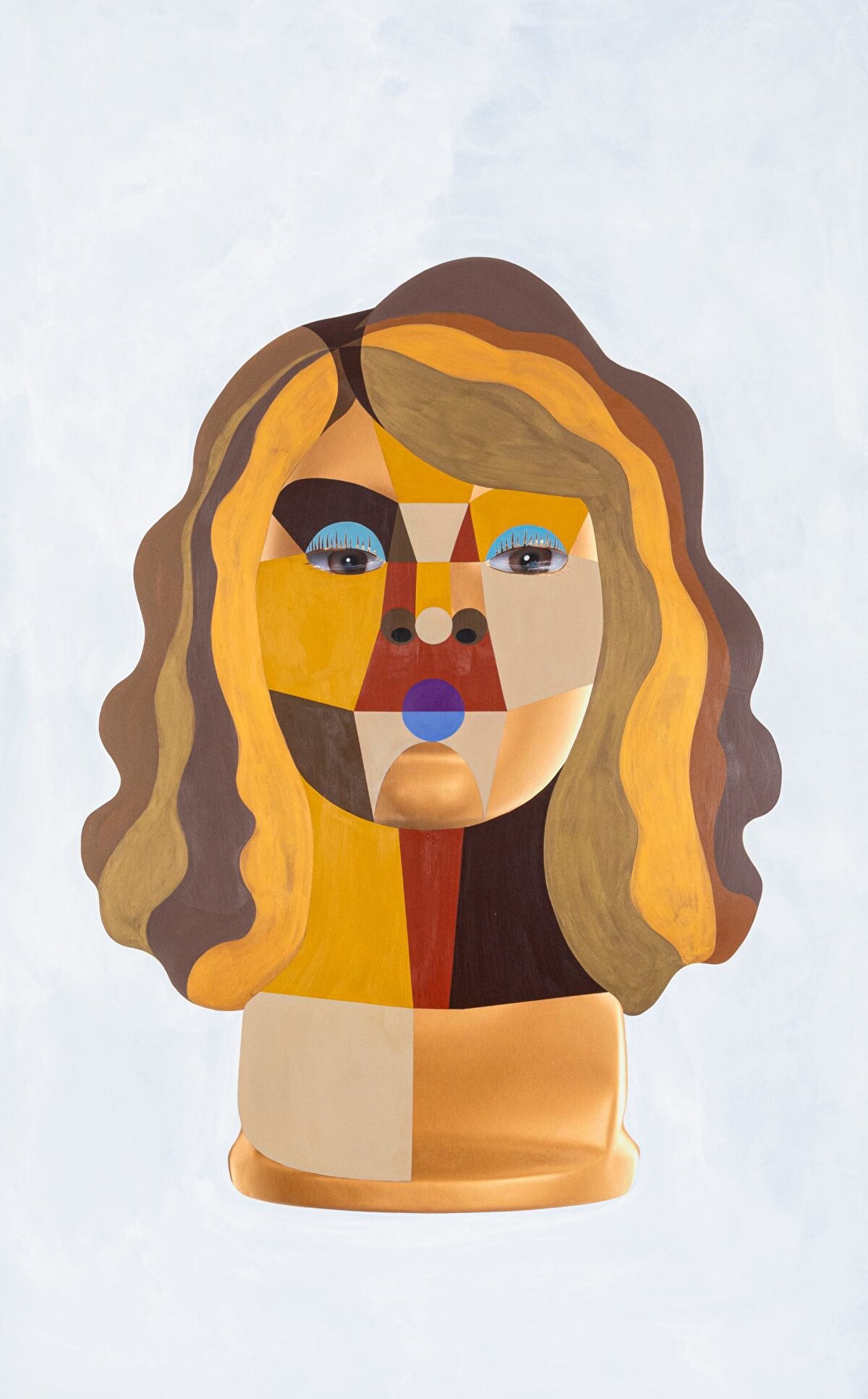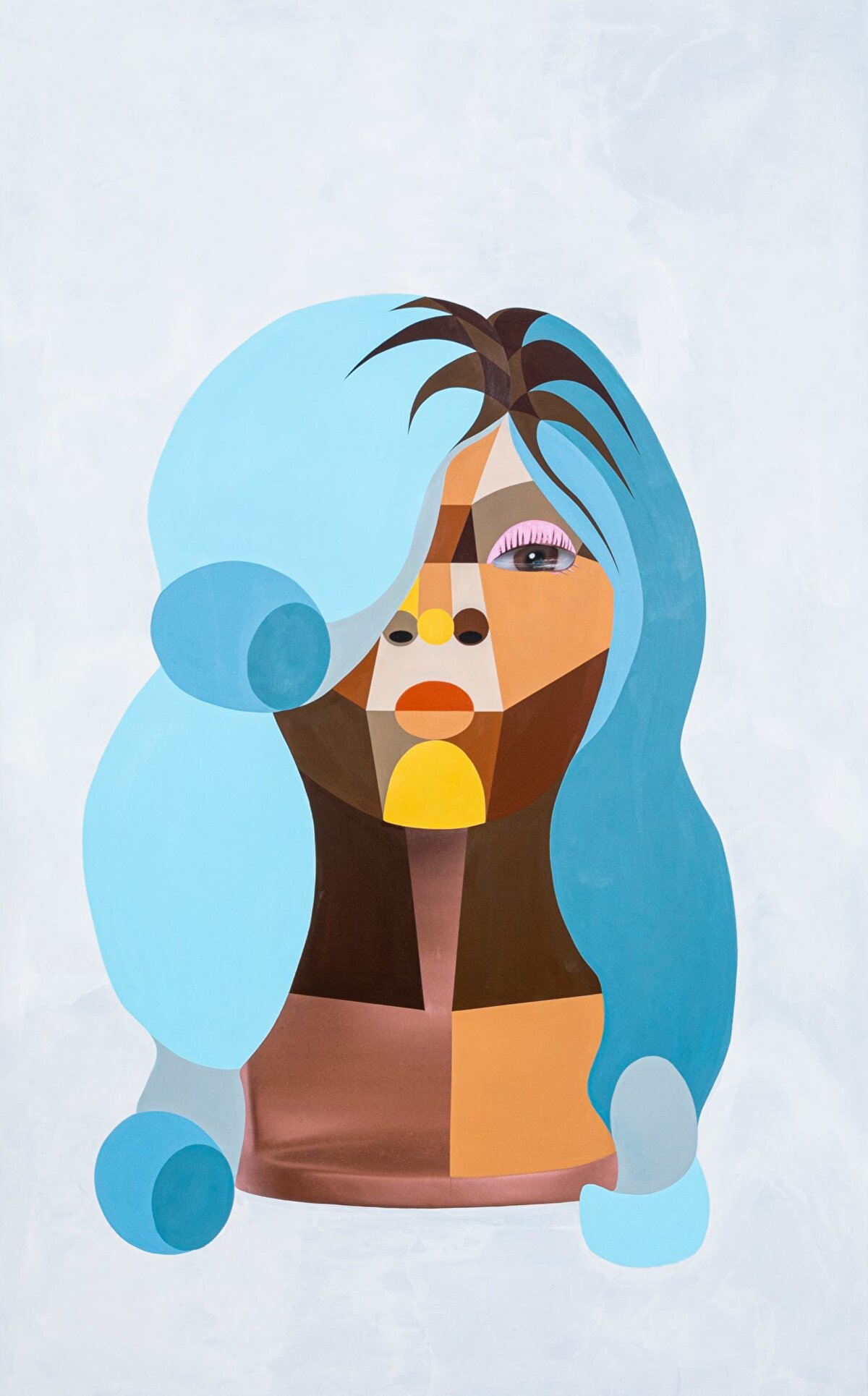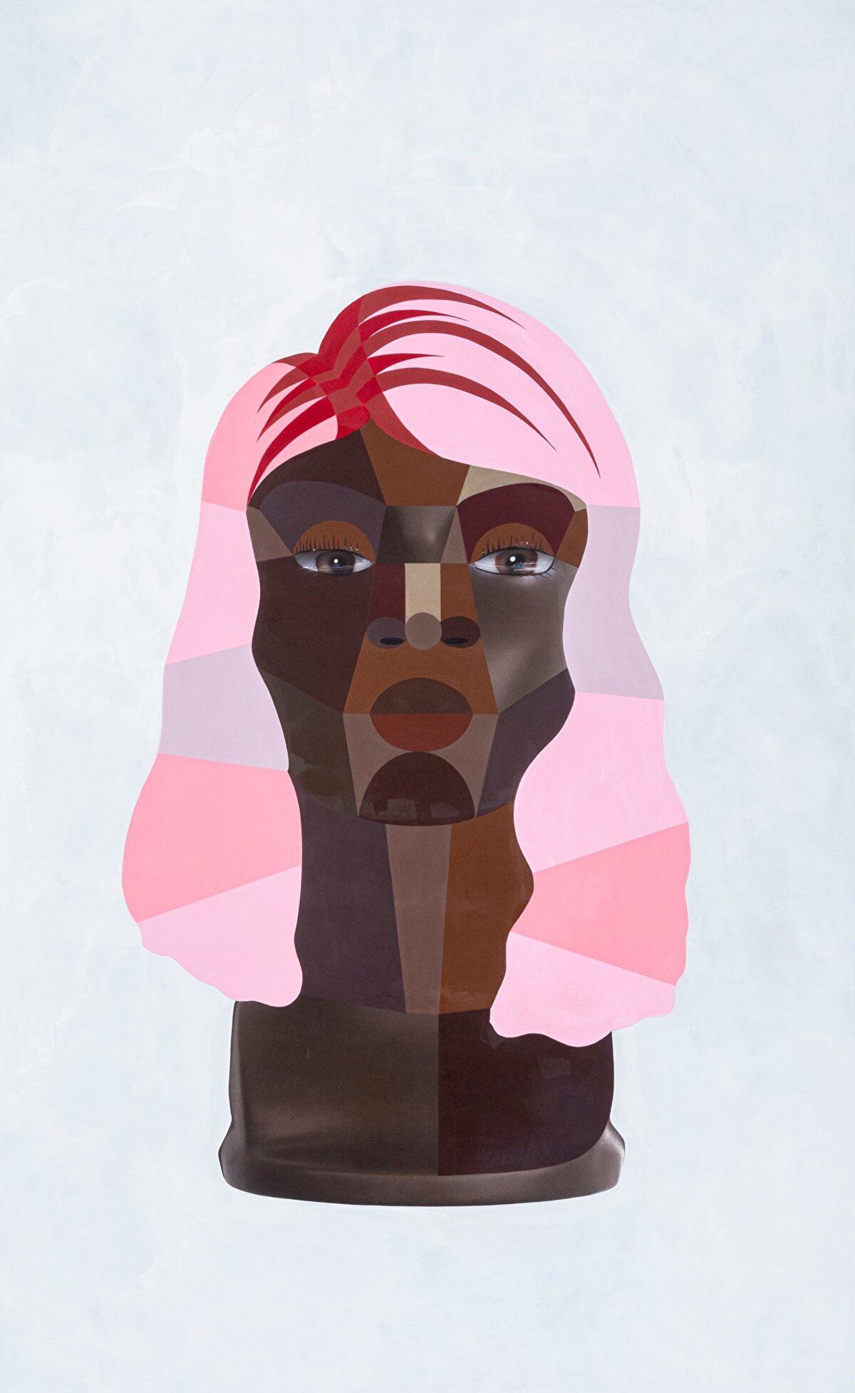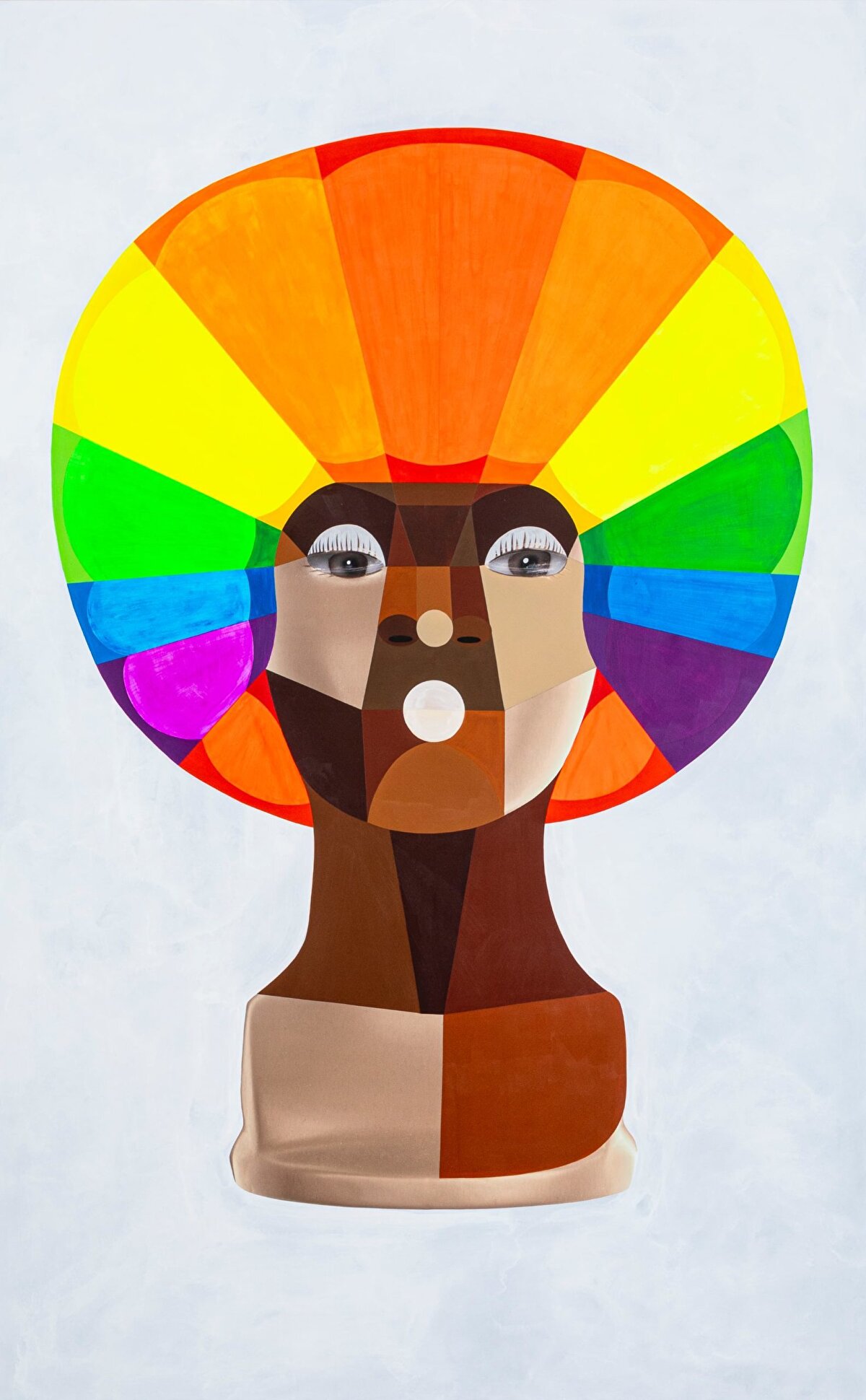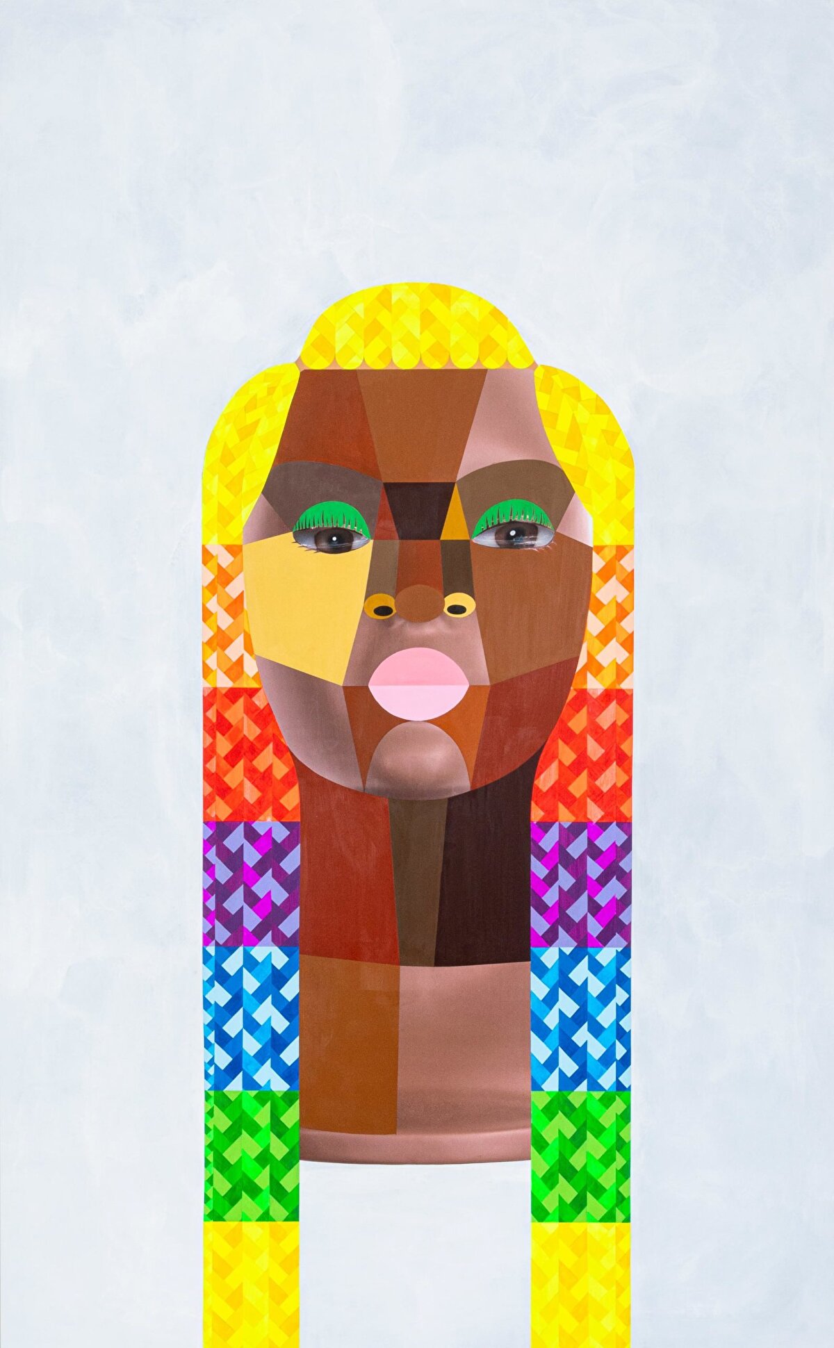 🌈2.44 metreden daha uzun olan akrilik ve grafit eserler, doğrudan bakışlarla, yüzleri farklı cilt tonlarıyla haritalanmış, yuvarlak göz kapakları ve dudaklarla makyaj astarlı büstler üzerinde merkezleniyor. Gökkuşağı çizgili ayrıntılı peruklar ve soluk ombre, Adams'ın Brooklyn semtindeki salonlardan ve mağazalardan ilham aldığını gösteriyor.