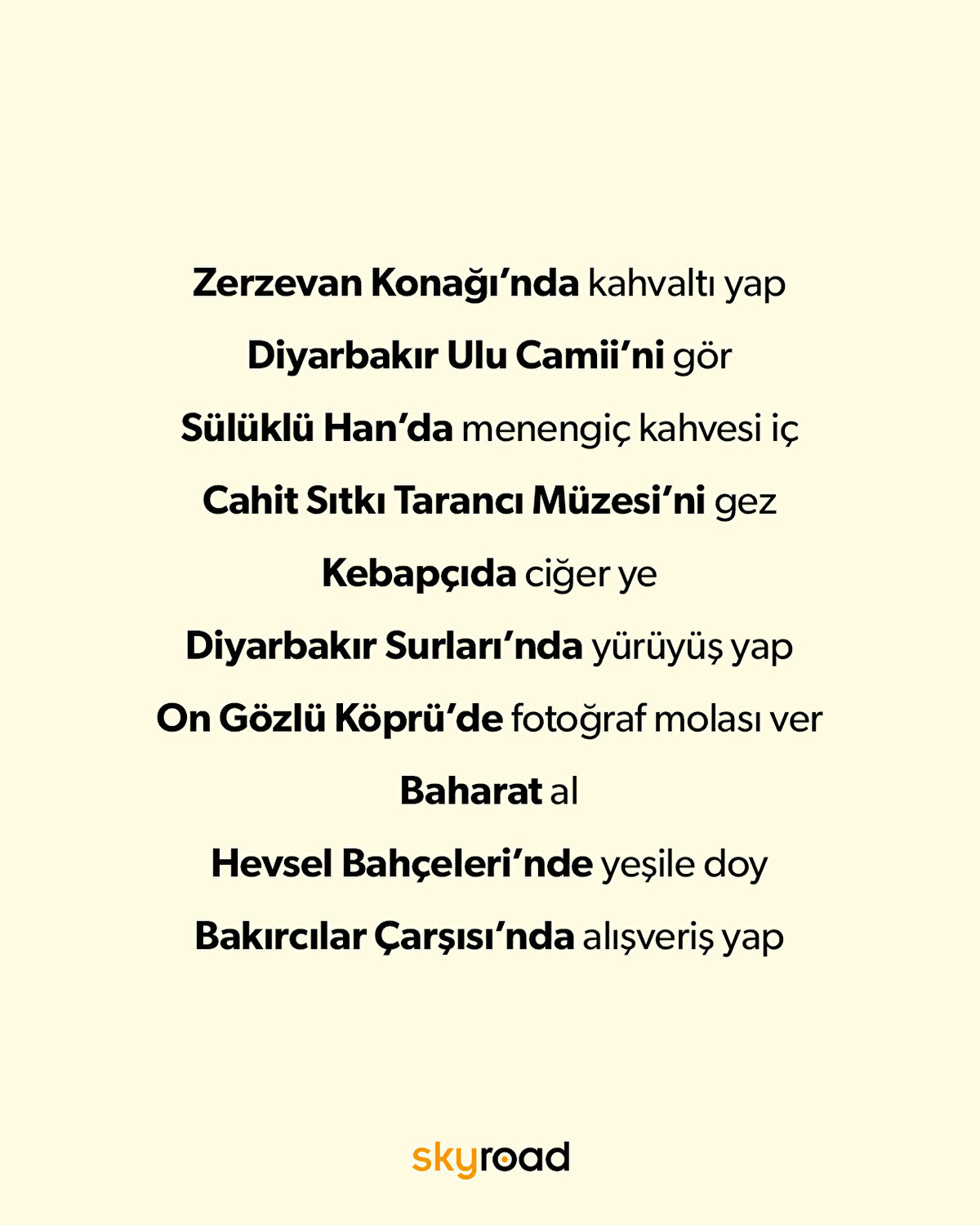 Birçok medeniyete ev sahipliği yapan Diyarbakır, tarihi mekanları, hanları, müzeleri ve doğal güzellikleriyle nefes kesen bir şehir. Diyarbakır'da gezilecek yerler say say bitmez ama biz bugün size harika bir listeyle geldik! Sence listeye neler eklenmeli? 💭