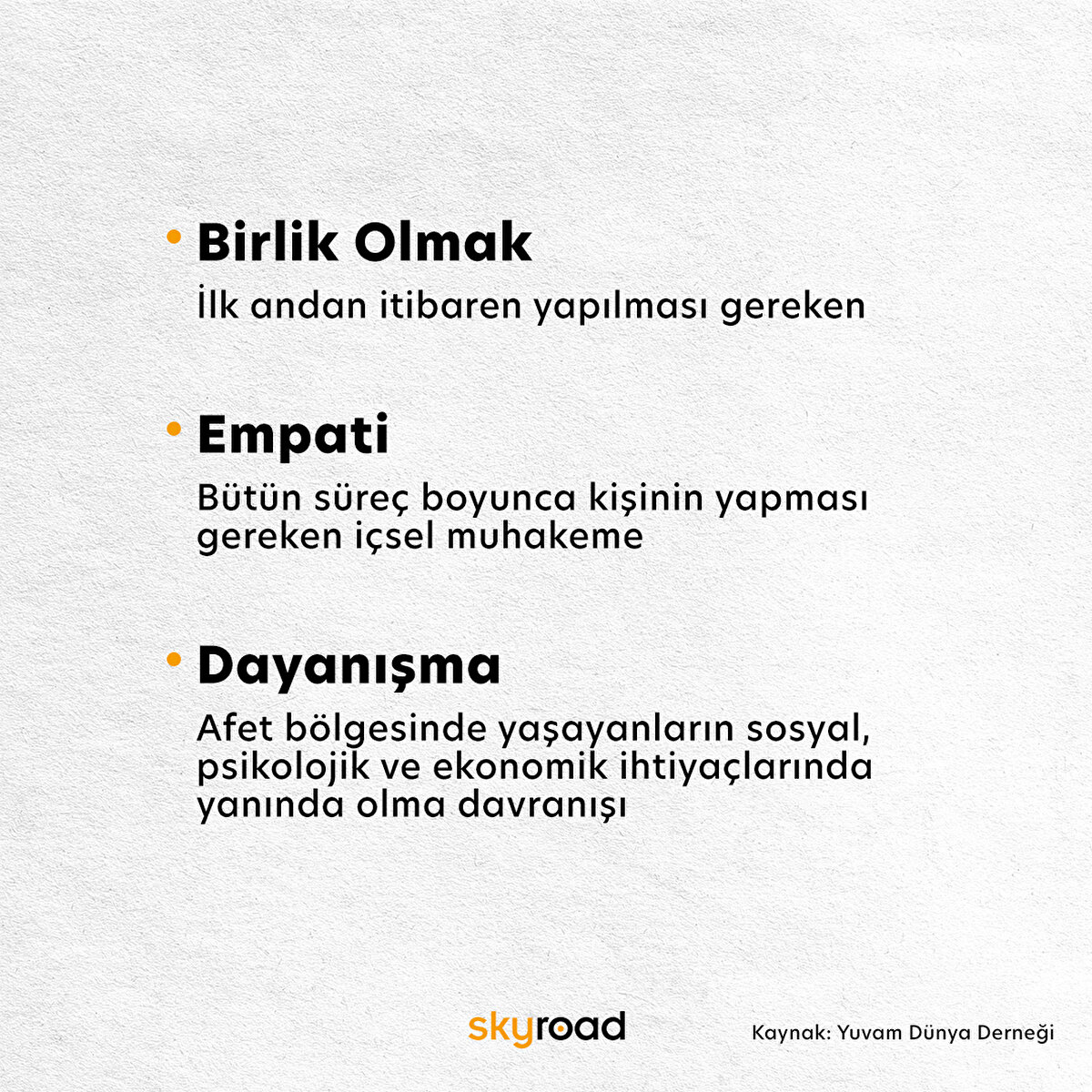 Afetlerle etkin şekilde mücadele etmek için 3 insani kural bulunuyor. Bu zor zamanlarda birlik olmalı, empati yapmalı ve dayanışma içinde olmalıyız.