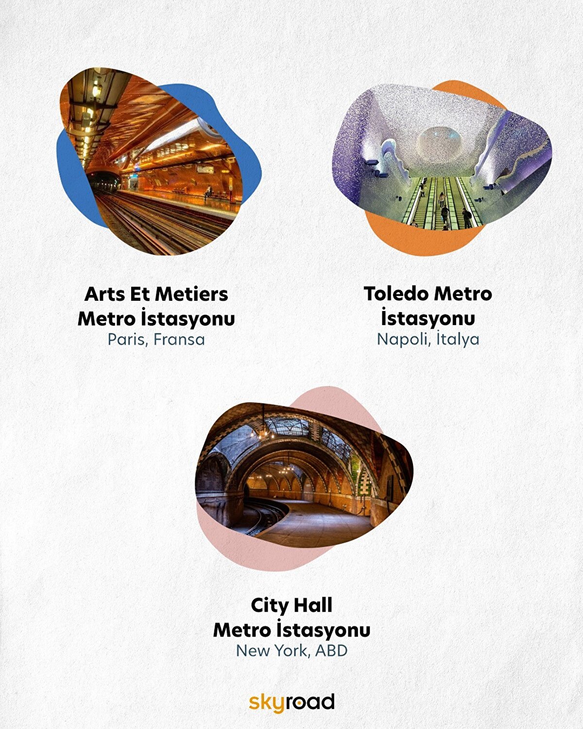 Toplu taşıma araçları birçoğumuzun gündelik hayatının bir parçası ve çoğumuz için kritik bir öneme sahip. Özellikle İstanbul gibi metropollerde raylı ulaşım sistemleri hayatlarımızın olmazsa olmazı. Skyroad ekibi olarak biz de oturduk ve dünyanın en güzel metro istasyonlarını listeledik. İşte 6 farklı şehirden 6 farklı metro istasyonu!