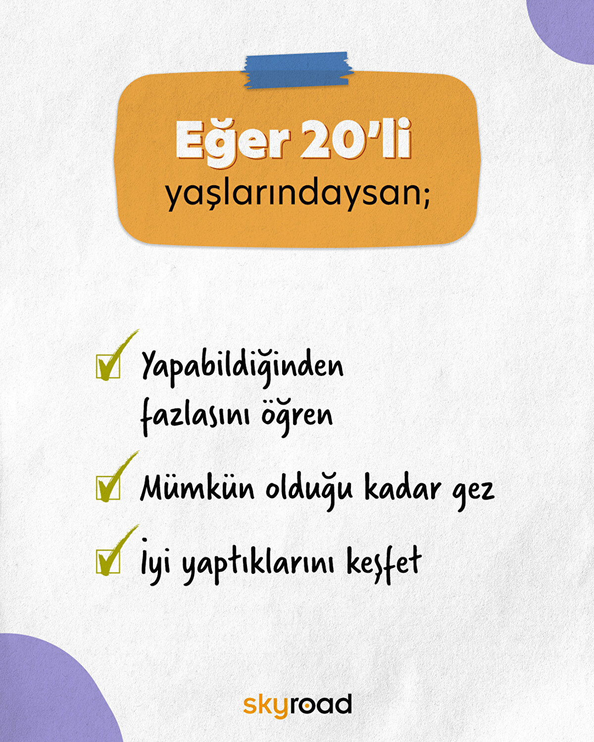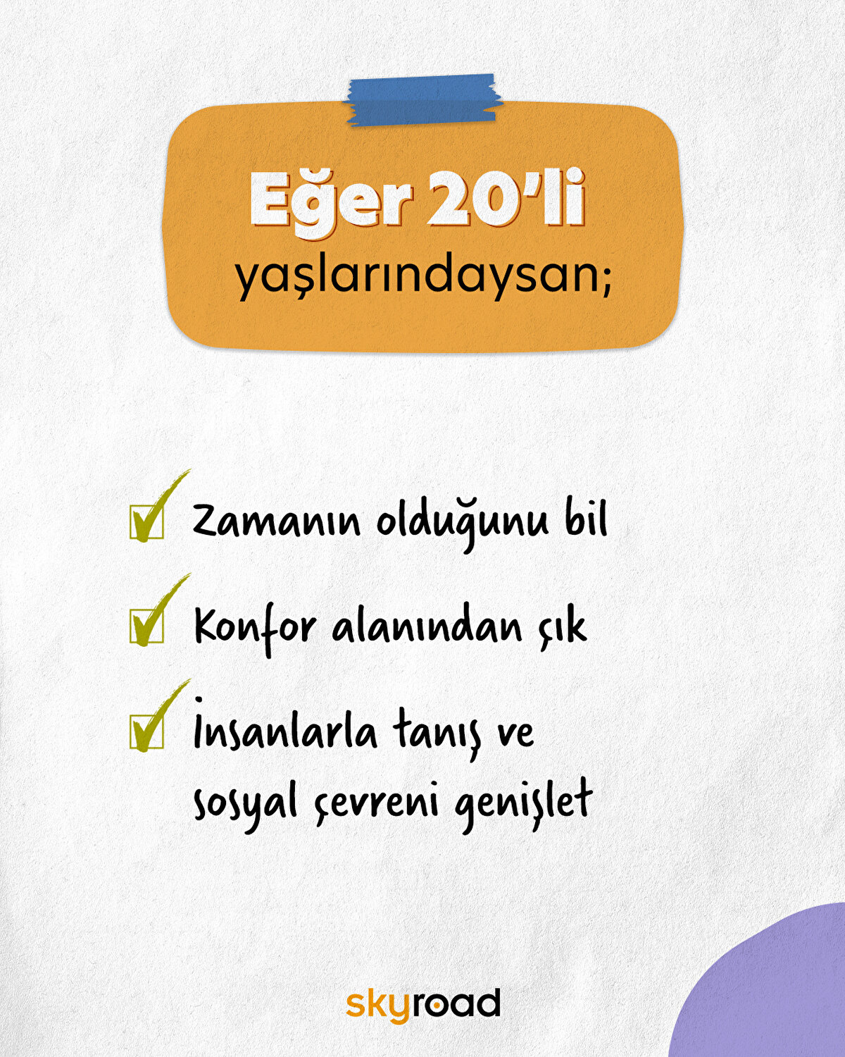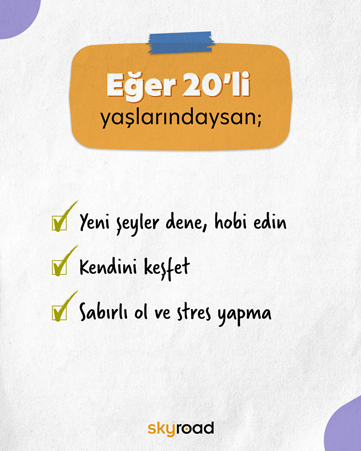 ¨20 ile 30 yaş aralığının nasıl geçtiğini anlamıyorsun!¨ Yetişkinliğin ilk yılları olan bu dönemde üniversitede okuma, kariyer planlaması yapma, sosyal hayatta daha fazla var olma, bağımsızlaşma, planları hayata geçirme gibi önemli süreçler kişinin hayatında yer almakta. Doğal olarak, bu yaş aralığında kendine has duygu durumu ve düşünceler oluyor. Mesleğe ve geleceğe dair planların yanı sıra ihtiyaçların ve isteklerin de keşfedildiği bu dönem beraberinde yeni sorumluluklar ve heyecanlar getiriyor. Bireysel ve bilinçli olarak kendini inşa ettiğin bu evrede kendini keşfet ve yeni adımlar at! Hayattan keyif aldığın, kaygıdan olabildiğince uzak bir on yıl diliyoruz!