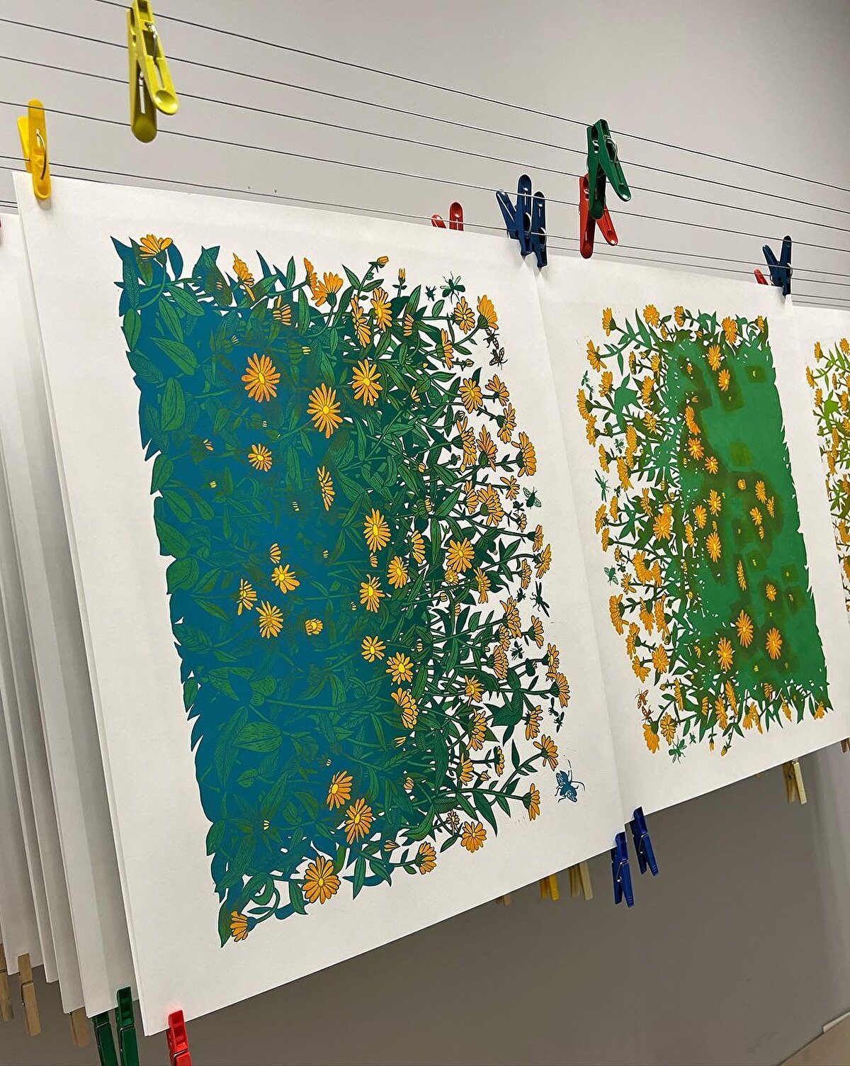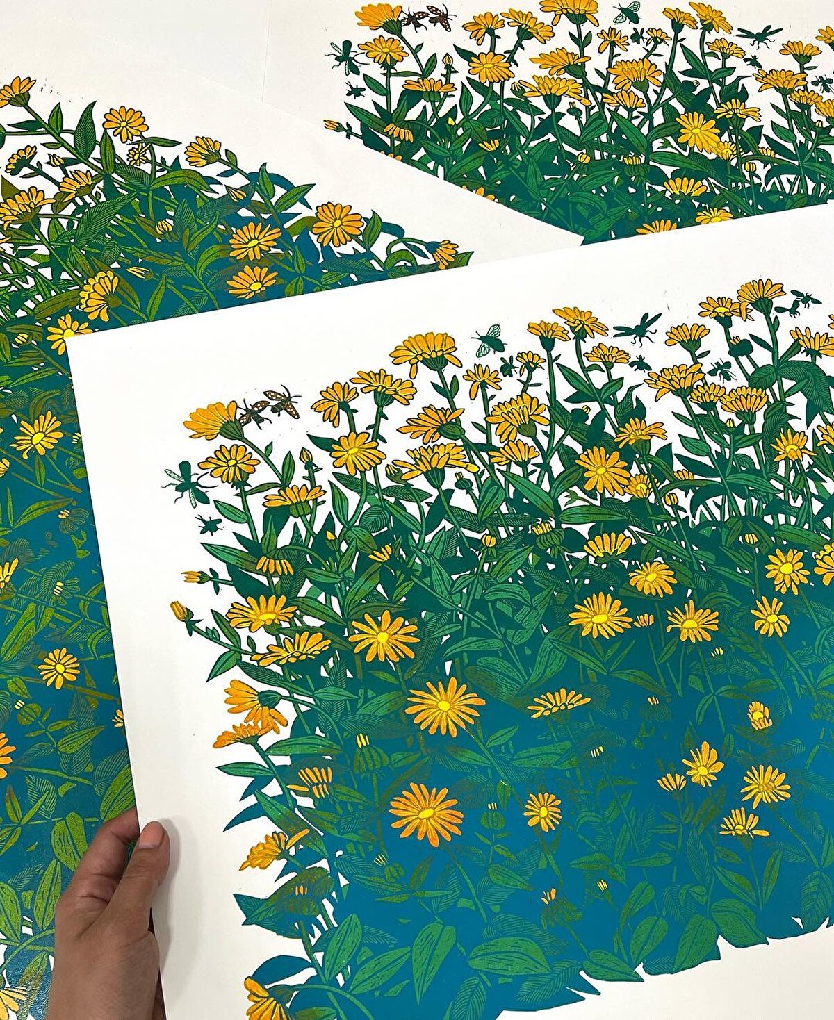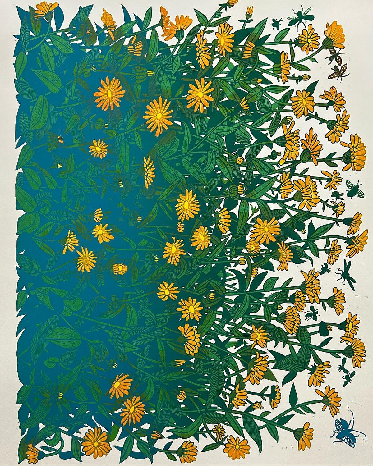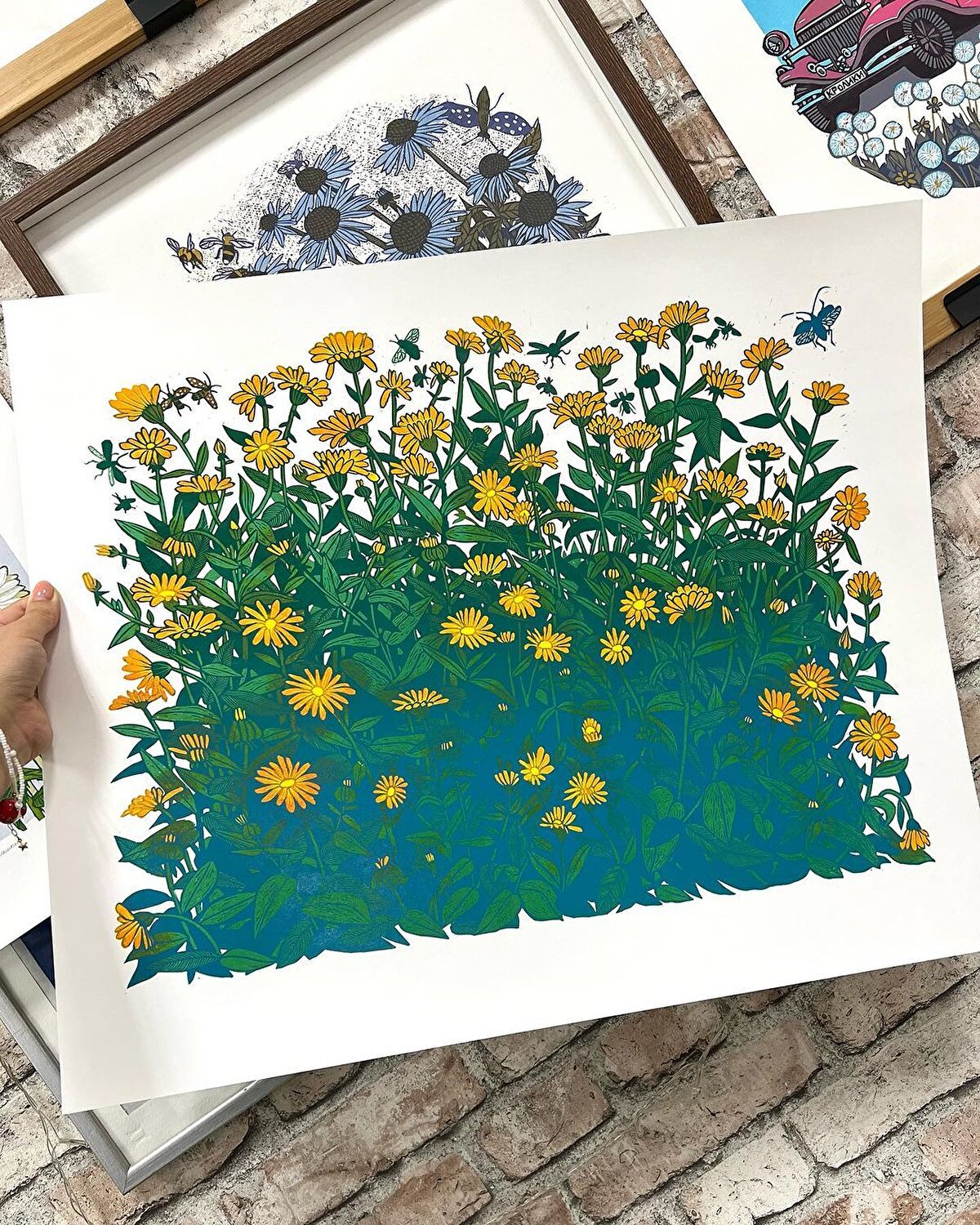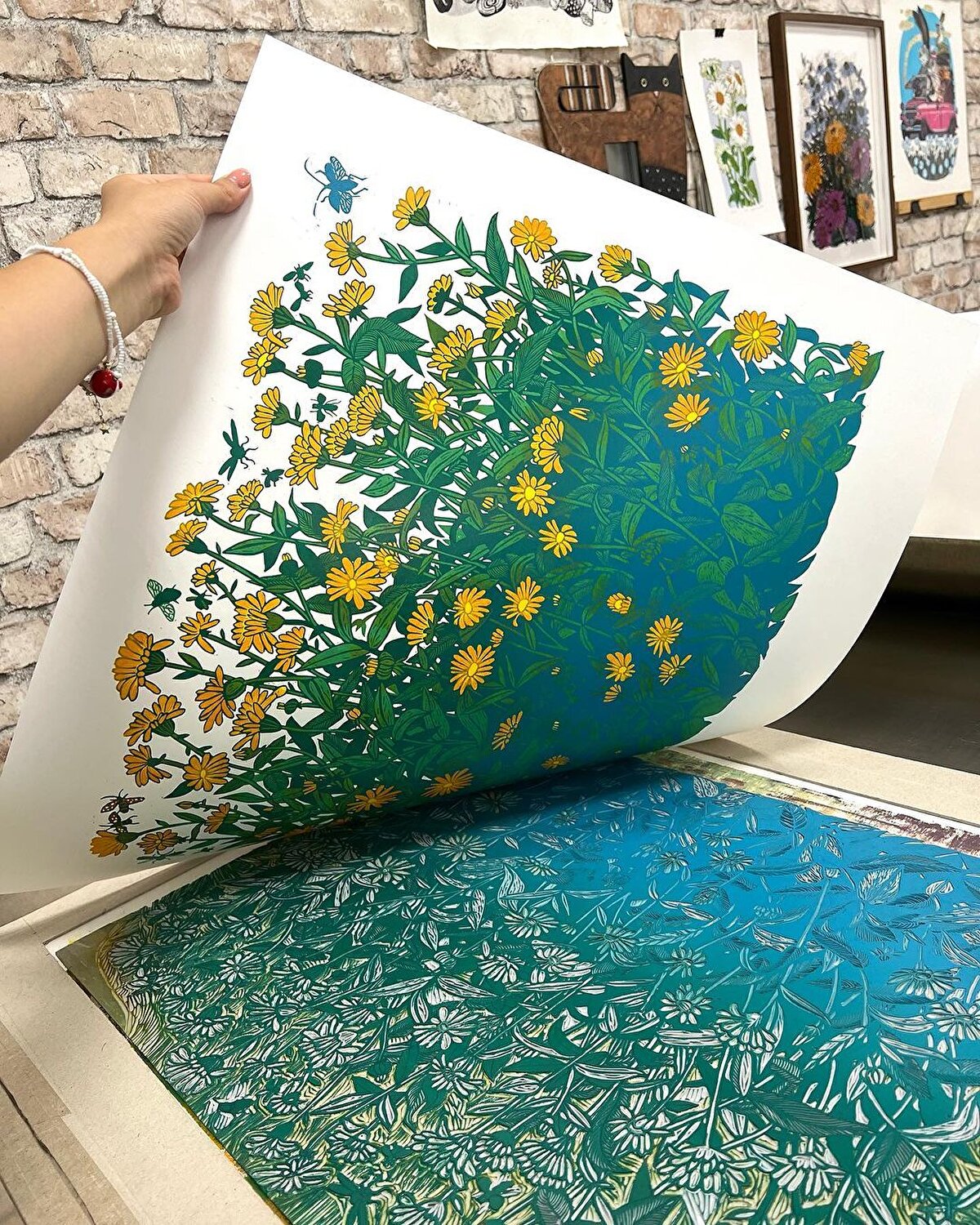 St. Petersburg, Rusya'da yaşayan, sanatçı ve grafiker Elina Adrshina linol baskı tekniği ile el yapımı eserler üretiyor. Bitkilerden, mantarlardan ve doğanın esrarengiz yapısından ilham alan sanatçı eserlerinde aynısefa, papatya ve ayçiçeği gibi motiflere oldukça sık yer veriyor. Sadece çiçek ve bitki değil kendine özgü tarzıyla gerçek üstü eserler de üreten sanatçı eserlerini @elina.artist adlı Instagram hesabından paylaşıyor.
