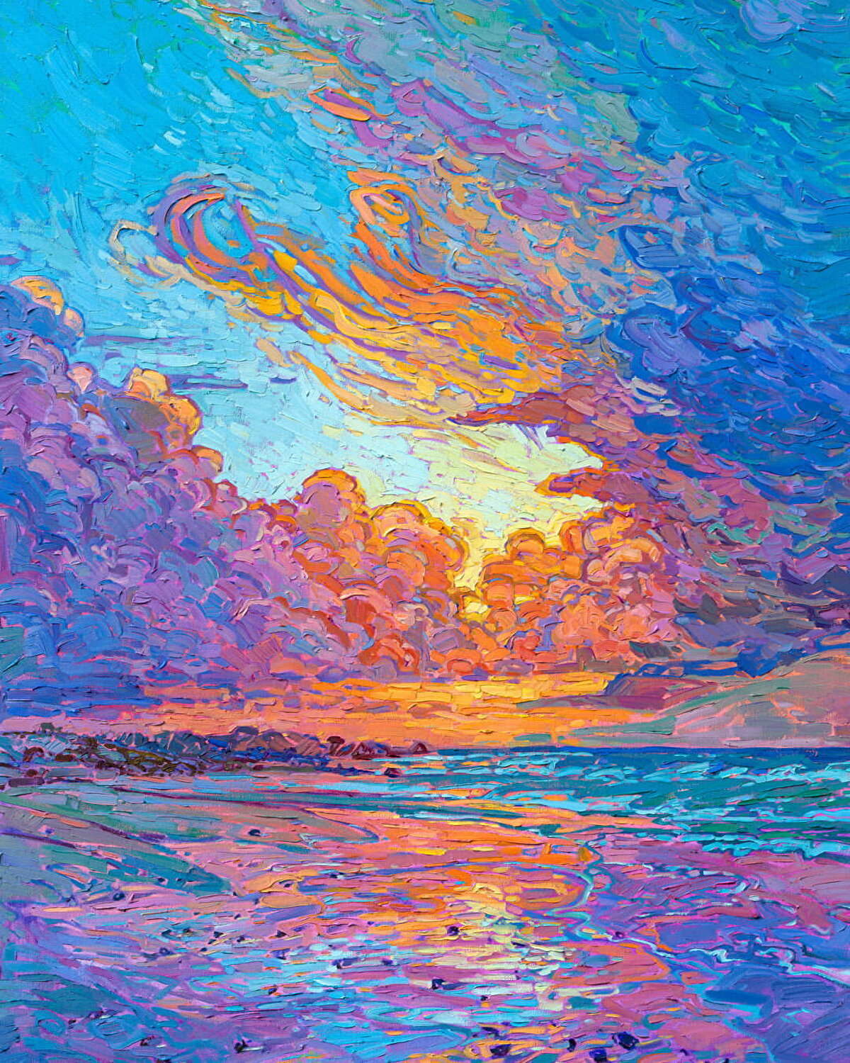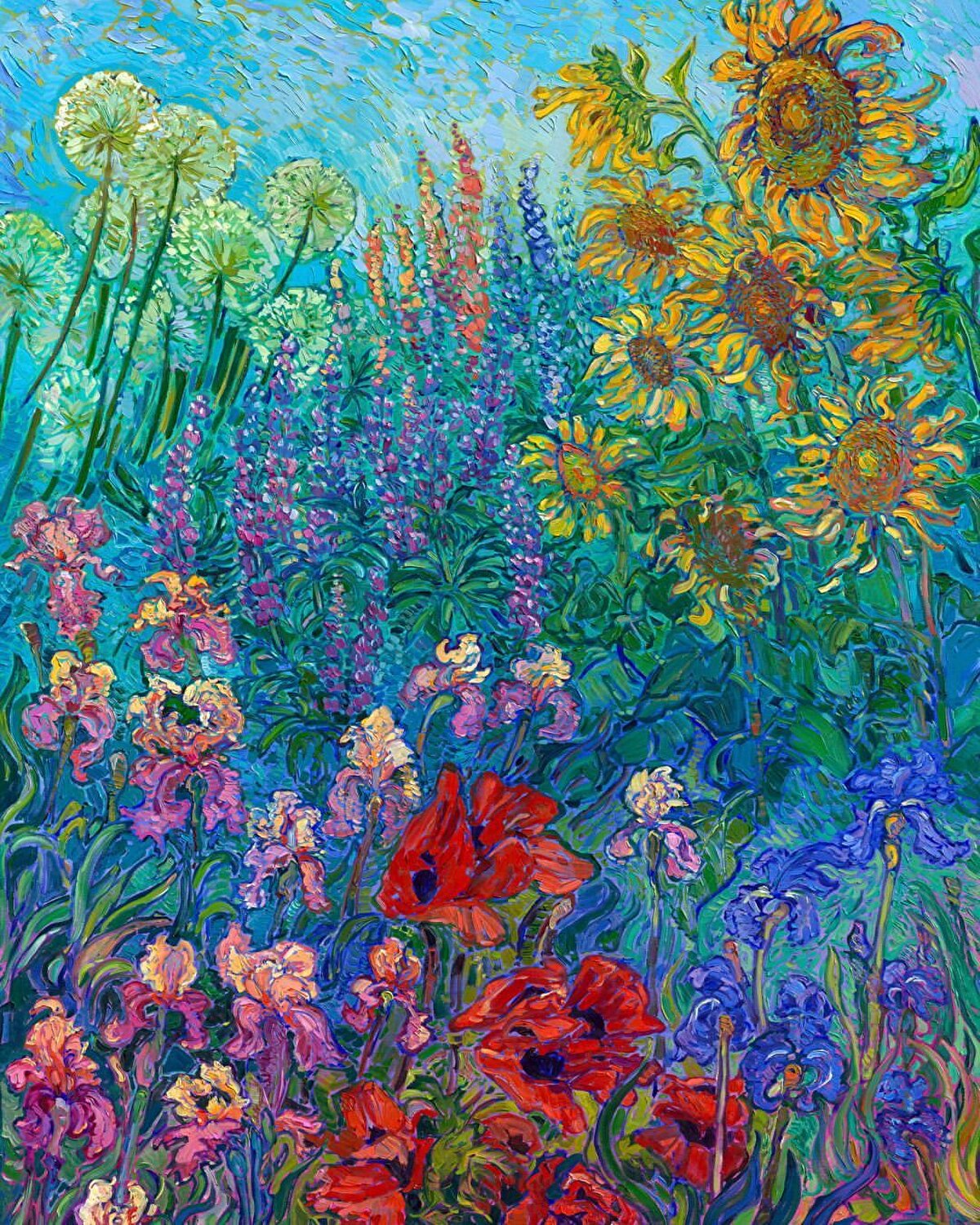 Kırk üç yaşındaki sanatçı Erin Hanson (@erichansonartist), sekiz yaşından beri yağlıboya resim yapıyor. Gençliğinde bir mural stüdyosunda çalışan sanatçı, 12 metre yükseklikteki duvarlara eserler çizmiş. Daha sonra kaya tırmanıcılığına merak salan sanatçı, tırmanırken gördüğü rengarenk manzaralardan aldığı ilhamla resim sanatına geri dönmüş. O zaman kendine verdiği her hafta bir resim yapma sözüne sadık kalan Hanson, hala üretmeye devam ediyor. Tarzı ''Açık izlenimcilik'' olarak bilinen sanatçı, vermek istediği duyguyu ortaya koymak için kalın yağlıboya vuruşları, vitray efekti oluşturmak için ise ayrı bir fırça tekniği kullanıyor. Oregon'un Willamette Vadisi'nde yaşayan sanatçı, doğada vakit geçirerek, seyahat ederek ve ışığın peşinden giderek doğanın dramatik renklerini tuvaline yansıtıyor. Sanatçı bu tutkusunu, ''Amacım, altın saatte ışığın güzelliğini yakalamak ve sıradan manzaraları olağanüstü renk ve doku mozaiklerine dönüştürmek.'' diyerek açıklıyor ve ekliyor; ''Her resimde amacım, zamanda nefesinizi kesecek kadar güzel bir anı yakalamak.''