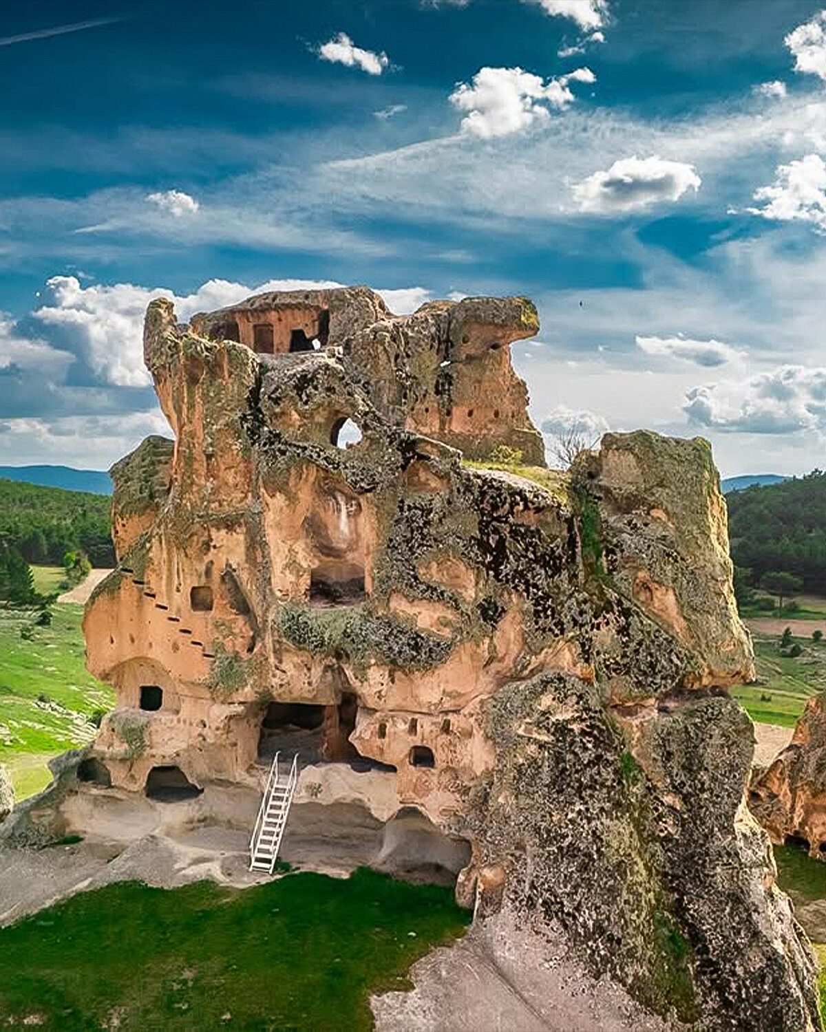 Tarihte ilk Frigler tarafından kullanıldığı düşünülen kale, Roma ve Bizans dönemlerinde genişletilmiş ve yeraltı geçitleri eklenmiş, yedi kattan oluşan kalenin her katı ayrı merdivenlerle birbirine bağlanıyor. Kalenin iç mekanlarında ise mezar şapelleri, depo alanları ve geçiş koridorları bulunuyor. Yapının içinde kaya oyma teknikleri gibi daha çok Bizans dönemine ait mimari izler yer alıyor.