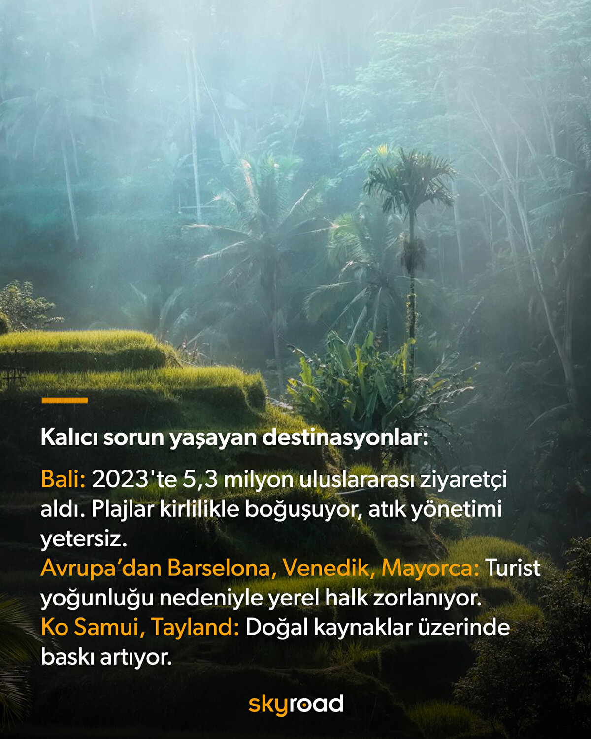 Fodor's Travel, her yıl yayımladığı "No List" ile aşırı turizmin çevre ve yerel topluluklar üzerindeki olumsuz etkilerine dikkat çekiyor. 2025 listesinde, Bali, Barcelona, Mallorca, Venedik ve Lizbon gibi destinasyonlar, sürdürülemez turizm baskıları nedeniyle ziyaretçilere yeniden değerlendirilmesi önerilen yerler arasında yer alıyor. Fodor's, bu listeyle seyahatseverleri daha sürdürülebilir ve sorumlu turizm uygulamalarına teşvik etmeyi amaçlıyor.