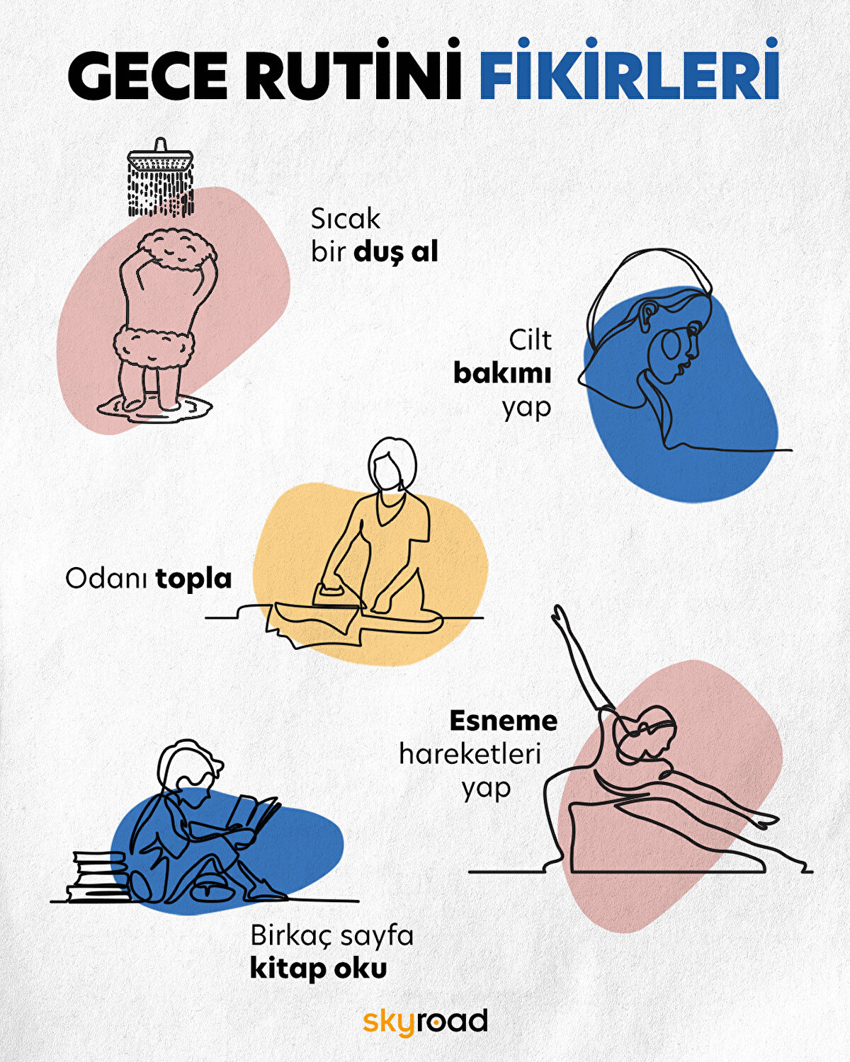 📌 Bir rutine sahip olman sağlıklı alışkanlıklar edinmeni sağlar ve endişelerini azaltır. Uykudan önce kendine kısa da olsa vakit ayırıp günün tüm stresini atabilirsin. Biz senin için minik bir rutin oluşturduk, gerisi sende!