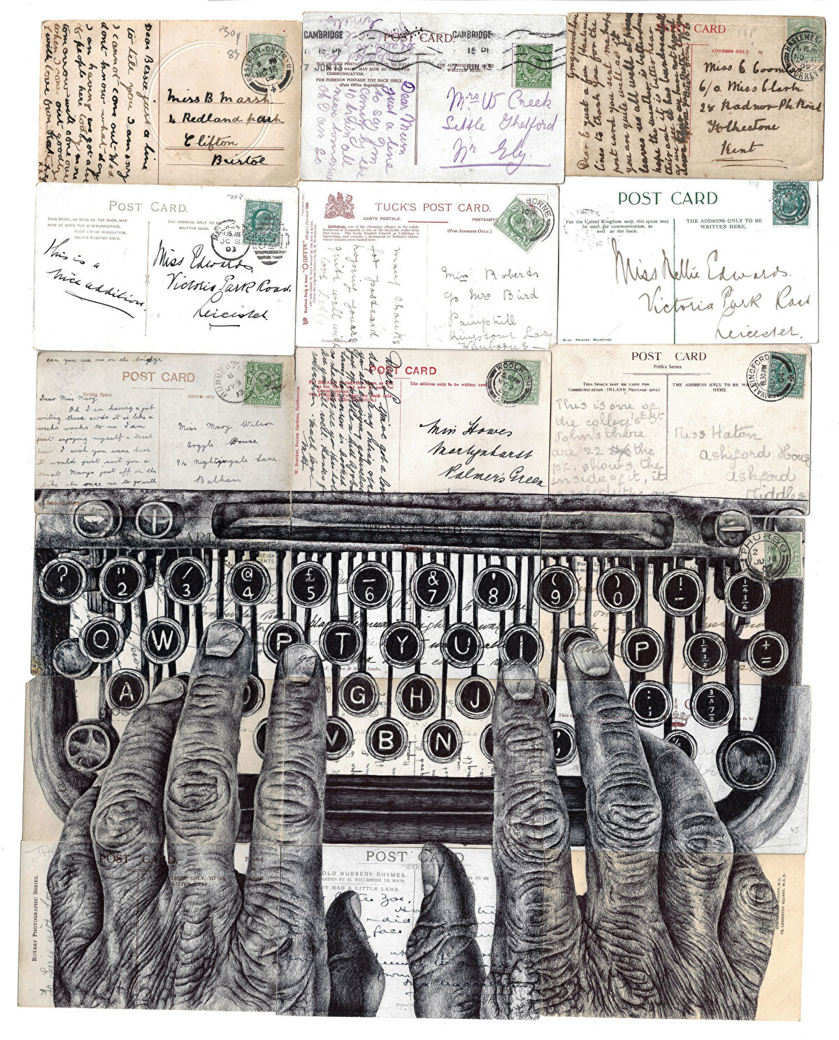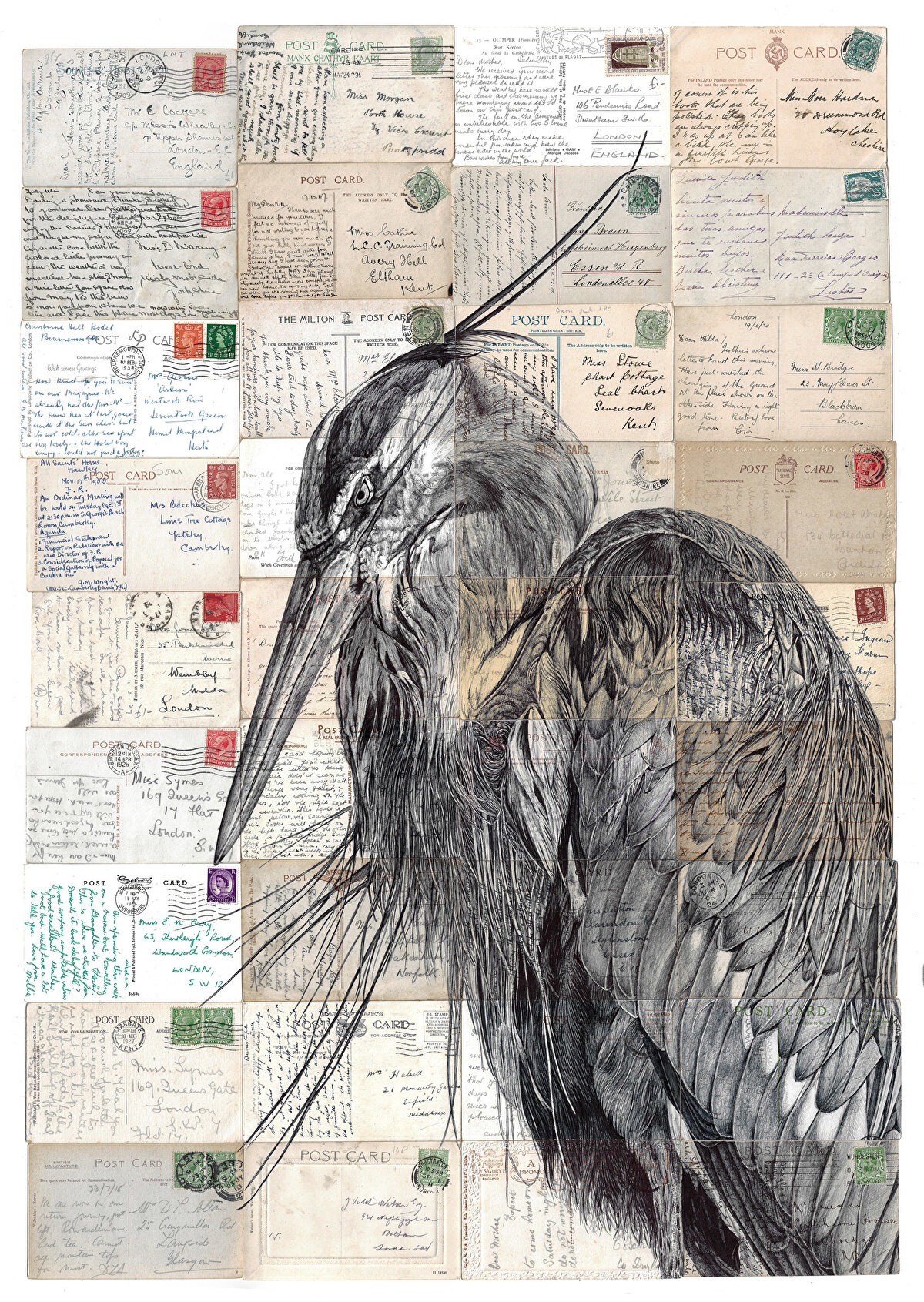 Eski ve kullanılmış kartpostallar, mektuplar, haritalar, kitap sayfaları, iskambil kartları vb. şeyleri yeniden dönüştürüp tuvali haline getiren @mark_powell_art, bu vintage ürünleri sanatının bir parçası haline getiriyor. İngiltere'de doğan ve hayatına burada devam eden sanatçı tuval olarak kullandığı bu ürünlerin sanatıyla bütünleşmesi için ürünlerin doğasına uygun teknikler tercih ediyor. Eserlerini mürekkepli kalemler ile üreten sanatçı bu tarzına, 1. Dünya Savaşı'na ait bir mektup üzerine yaptığı çizimden sonra yöneldiğini söylüyor.