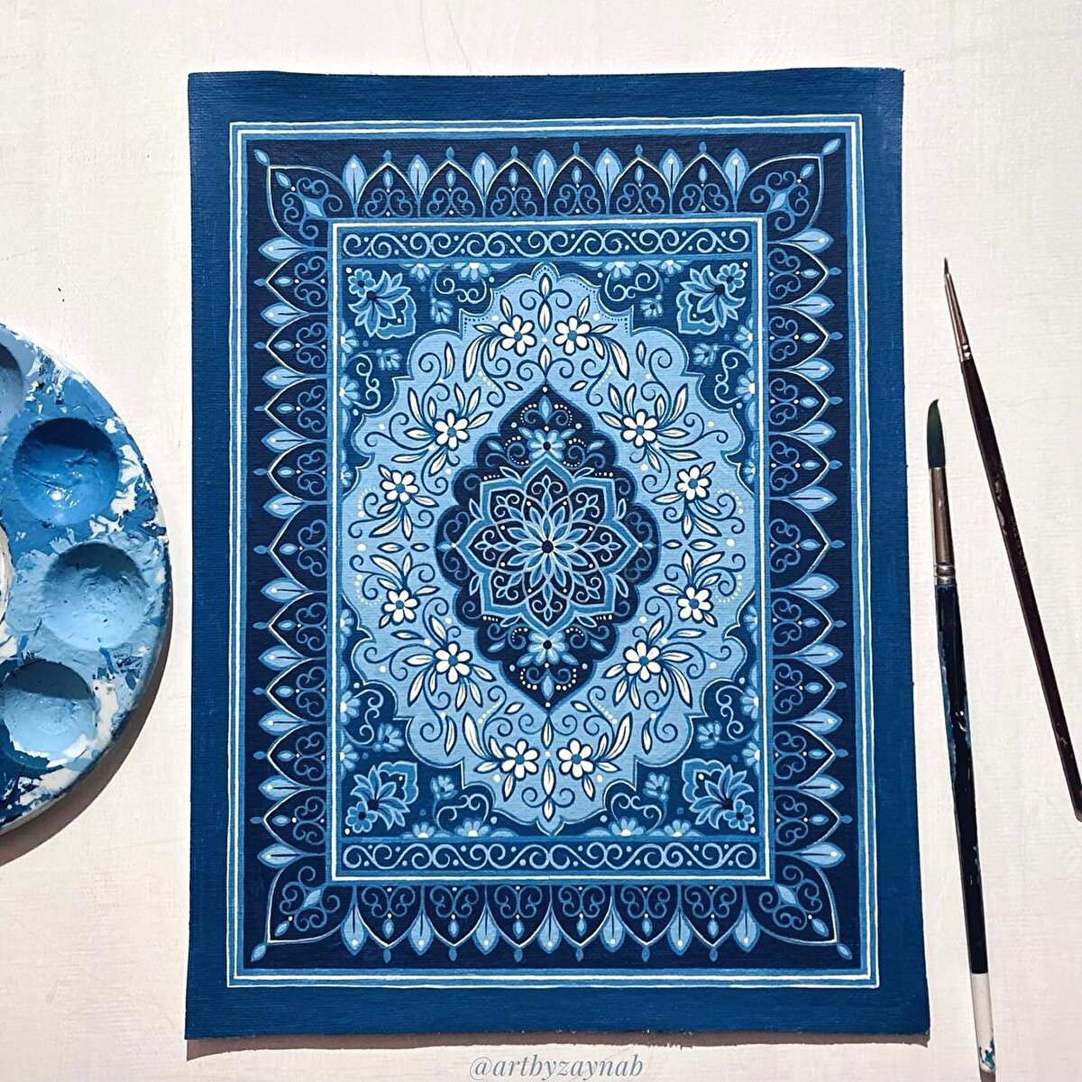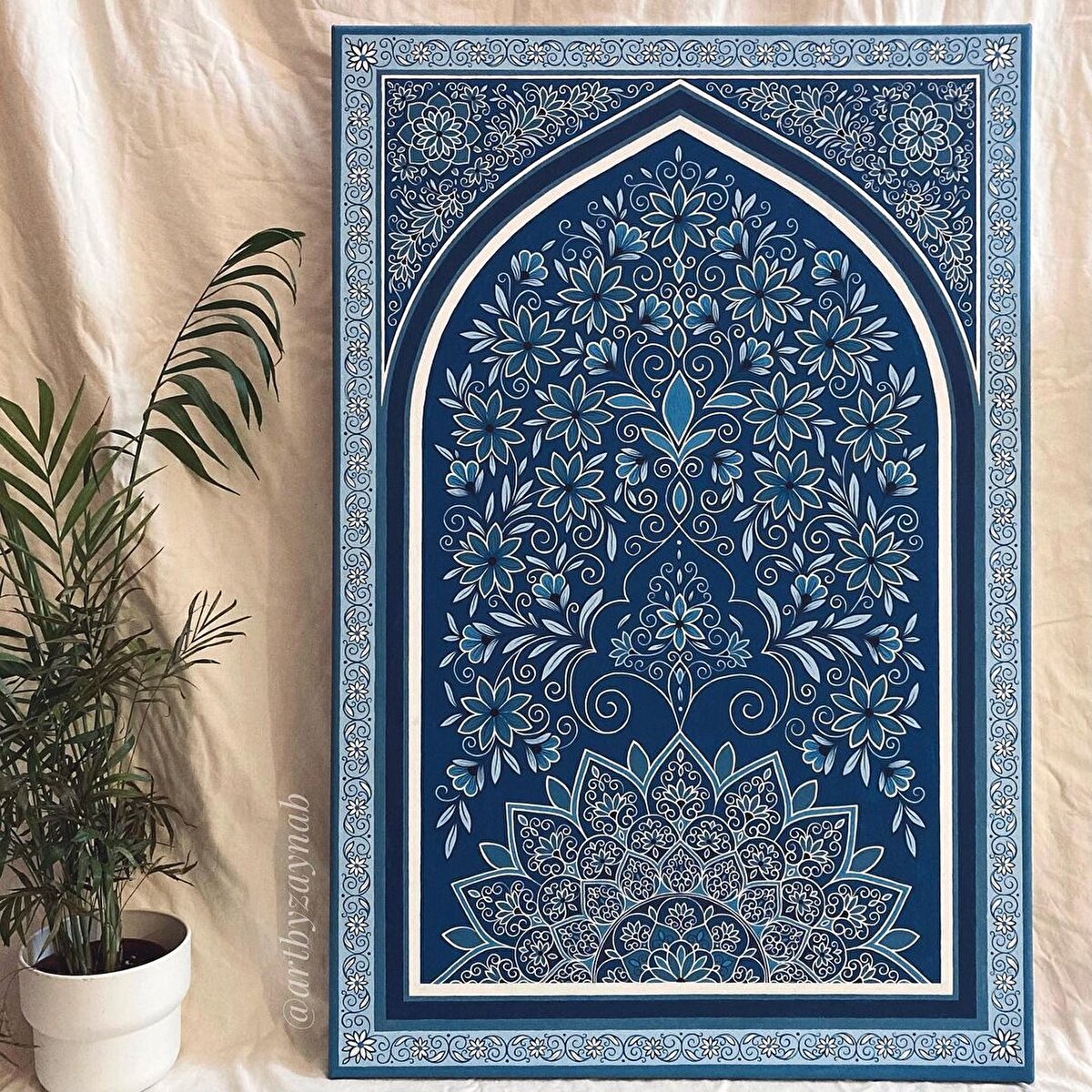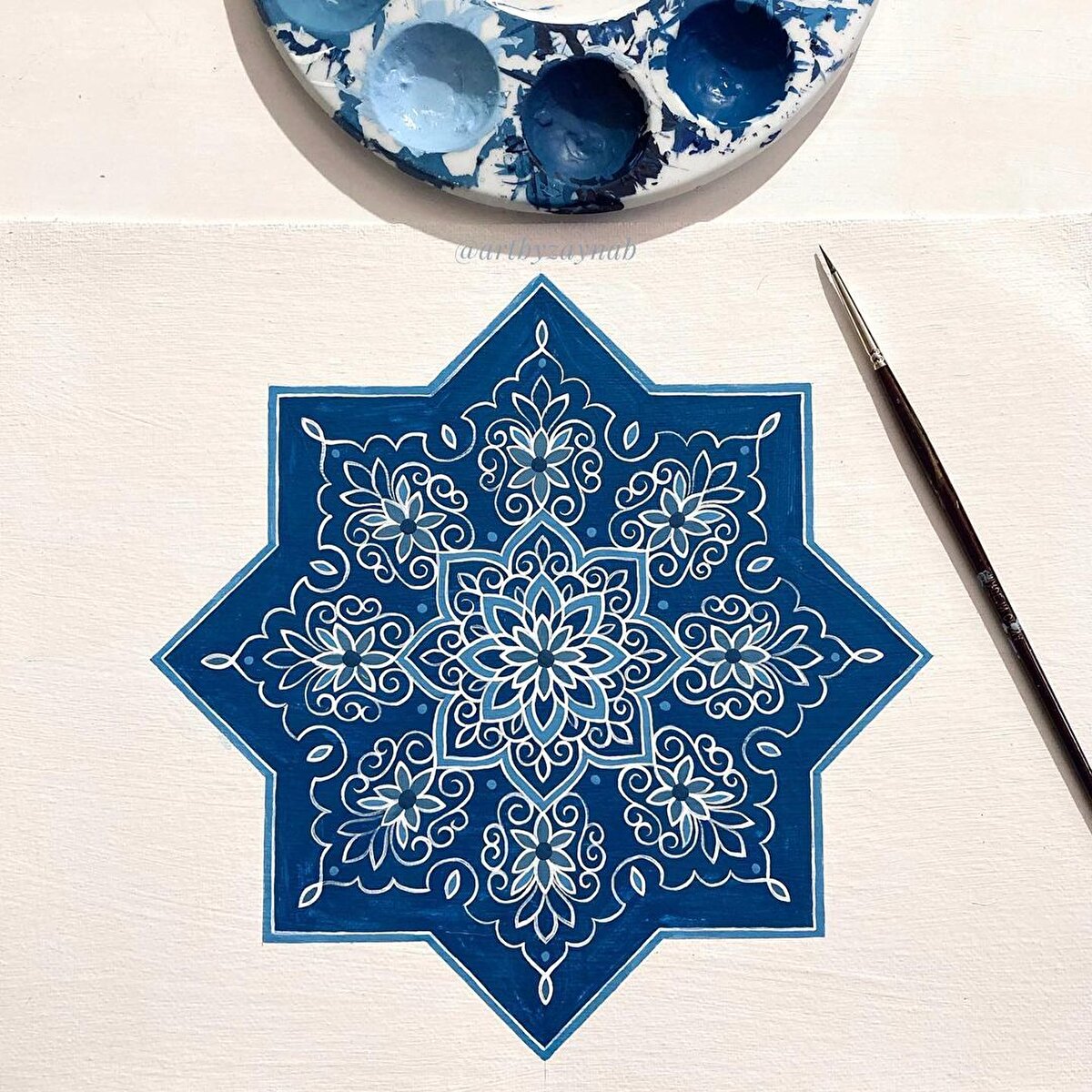 Sanatın modern anlayışı ve İslam sanatındaki geometri desenlerini birleştirerek sanat eserleri oluşturan Sudi Arabistanlı @artbyzaynab mavinin her tonunu kullanarak harika sanat eserleri yapıyor. Türk, Fars, Endülüs ve Özbekistan sanatından ilham alan Zaynab, mimariden geometriye kadar farklı alanlardaki desenleri kullanıyor. Ayrıca İran ve Fars halılarından ilham alarak özgün bir şekilde yaptığı tabloları ile geçmişi bugüne taşıyor. Geniş bir coğrafyadan ve zaman diliminden ayrıntılara yer veren sanatçı, boş alanları sanatın en güzel dalı ile güzelleştirerek geleceğe aktarıyor.