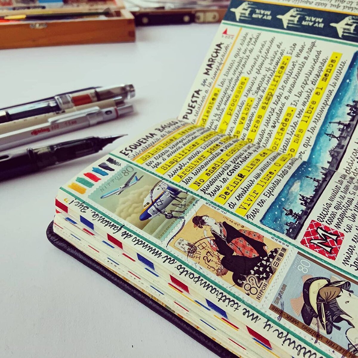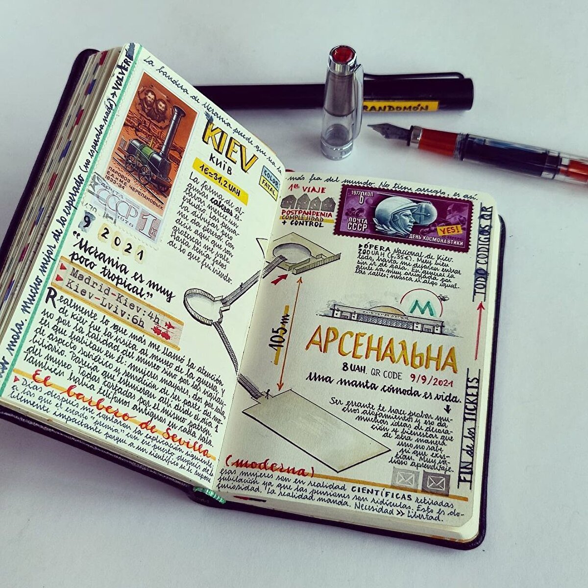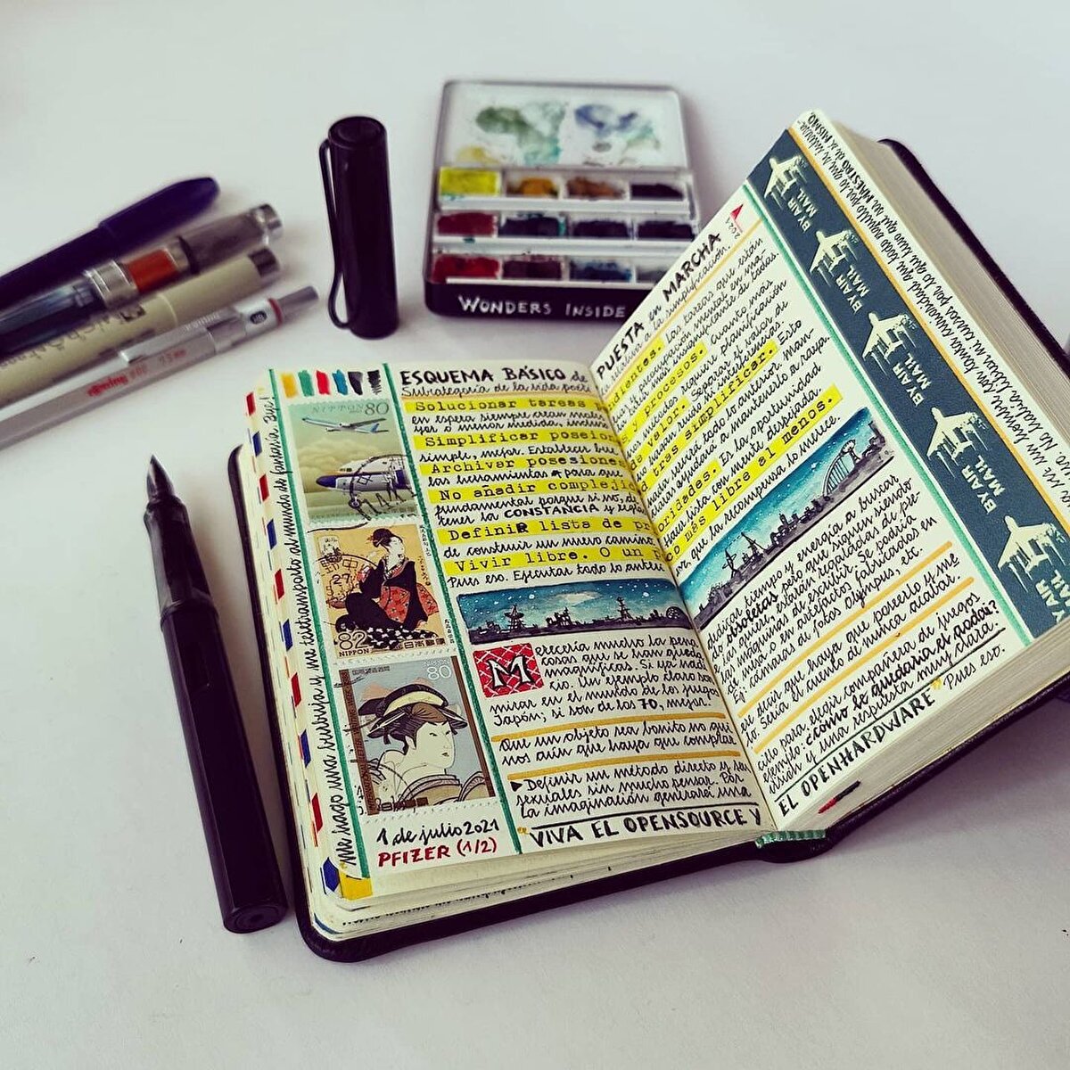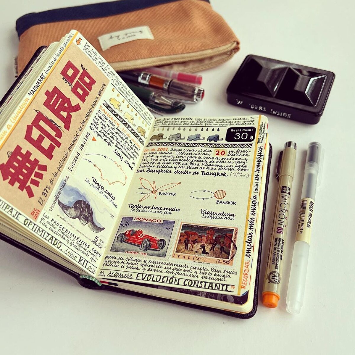 İspanyol sanatçı @jose_naranja, seyahat anılarını eskiz defterlerine çiziyor. 2005 yılından beri seyahat anılarını defterlerine aldığı notlarla arşivleyen sanatçı, yazılarına suluboya çizimler de ekliyor. Bu küçük ve kendine has günlükler, Naranja'nın yolculuklarını samimi bir şekilde yansıtıyor. Günlükleri, gezdiği yerlerin mimarisinden haritalarına kadar pek çok farklı detay barındırıyor. Özellikle Asya'yı ziyaret etmekten hoşlandığını belirten sanatçı, eskizlerine gezilerinden topladığı pulları ve kartpostalları da ekliyor. Tutkusunu, ''Fotoğraf çekmeyi ve seyahat etmeyi çok seviyorum. Özellikle de Asya'ya seyahat etmeyi, Asya harika.'' diyerek açıklayan sanatçı, çalışmalarını ise ''Rüyalar, fikirler ve deneyimler deposu'' olarak tanımlıyor. Naranjanın çalışmalarının her sayfası, nereye giderse gitsin adeta görsel bir şölen sunuyor.