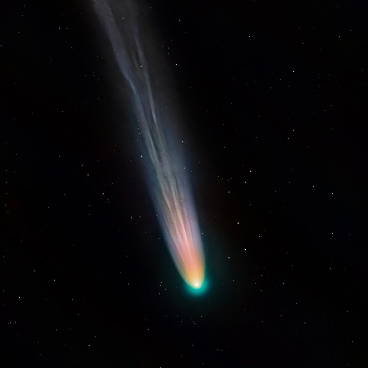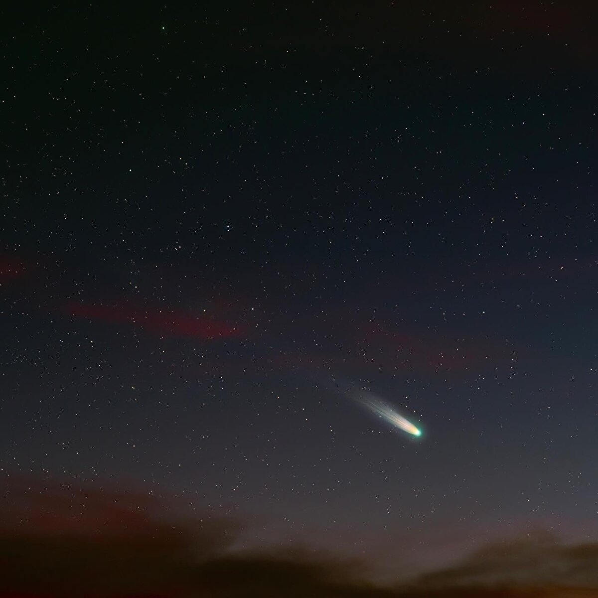 Kendisine “teleskoplu normal bir adam" diyen biri için fotoğrafçı Andrew McCarthy, gerçekten hayranlık uyandıran görüntüler yakalıyor. McCarthy, 26 Aralık 2021'de, Floransa'daki arka bahçesine gitti ve gökyüzünü delip geçen Leonard Kuyruklu Yıldızı -diğer adıyla Noel Kuyruklu Yıldızı- manzaralarını çekti. Ortaya çıkan fotoğraflardan biri, hafifçe parıldayan yıldızlarla kaplanmış simsiyah bir fonla çevrili parlak bir renk çizgisi sergileyen kuyruklu yıldıza yakından bir bakış.