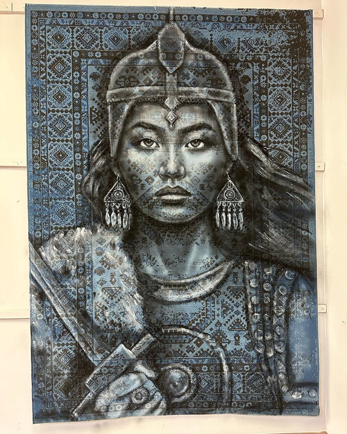 Kazakistanlı sanatçı Assel Sabyrzhankyzy, desenli halıların üzerine sprey boya ve fırça yardımıyla çeşitli portreler çiziyor. Eserlerinde zemin olarak farklı desenlerde halı kullanan @assolyaa, desenlerinin bütünlüğünü bozmadan, kullandığı boyama teknikleriyle halı üzerine çizdiği portreler ve zemindeki desenleri bir bütün olarak yansıtıyor. Renklerinin canlılığıyla, ilk bakışta bir fotoğraf karesi gibi profesyonel ve gerçekçi görünen ve halıdaki kompozisyona mükemmel uyum sağlayan halı tabanlı portre çizimi eserler, aslında büyük bir emek ve ince bir işçilik sonucu meydana geliyor.