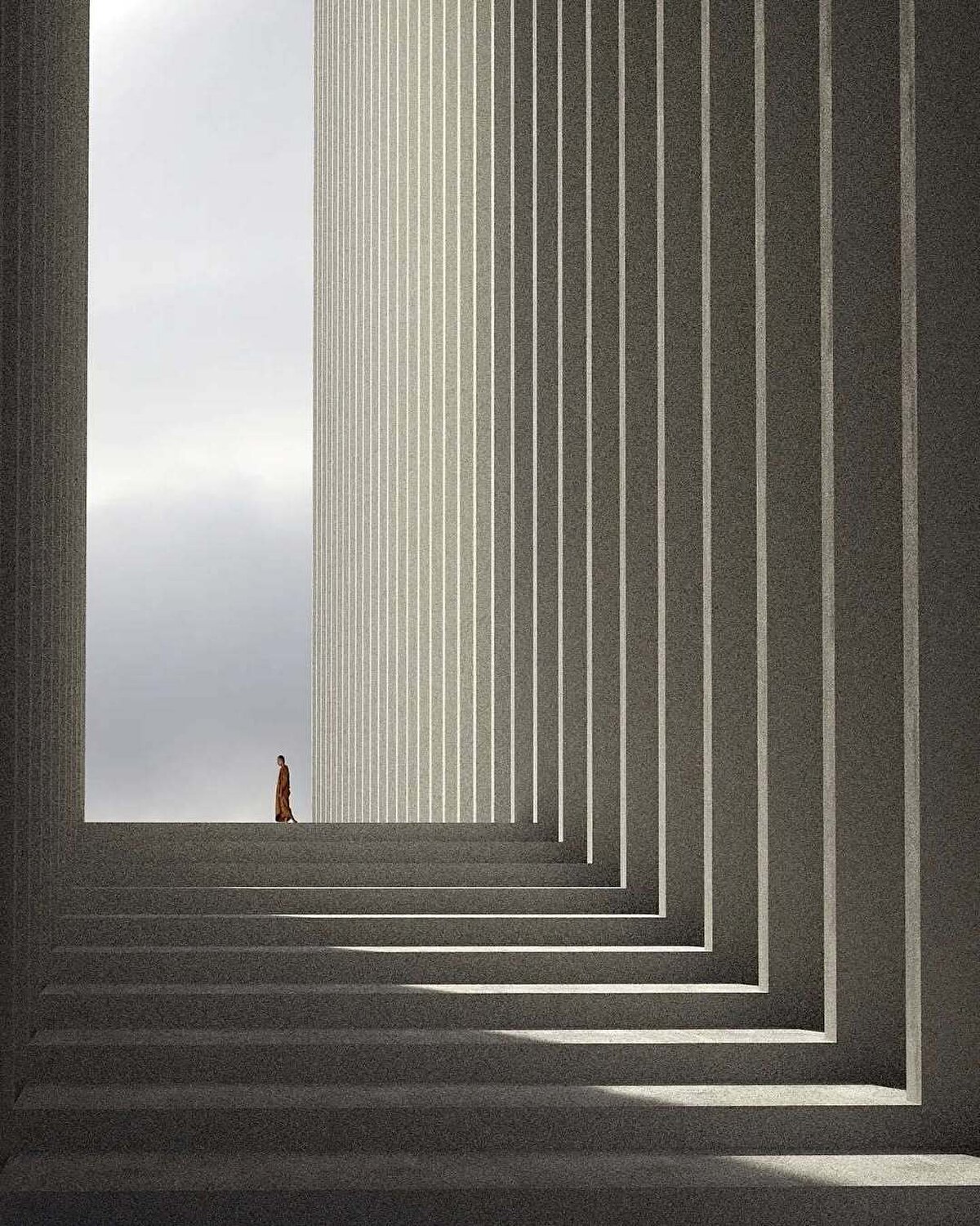 Bir yandan dev yapılar arasında kaybolmuş bir insanın çaresizliğini yansıtırken, diğer yandan içeriye süzülen gün ışığıyla umudun ve varoluşun hala mümkün olduğunu hatırlatıyor.