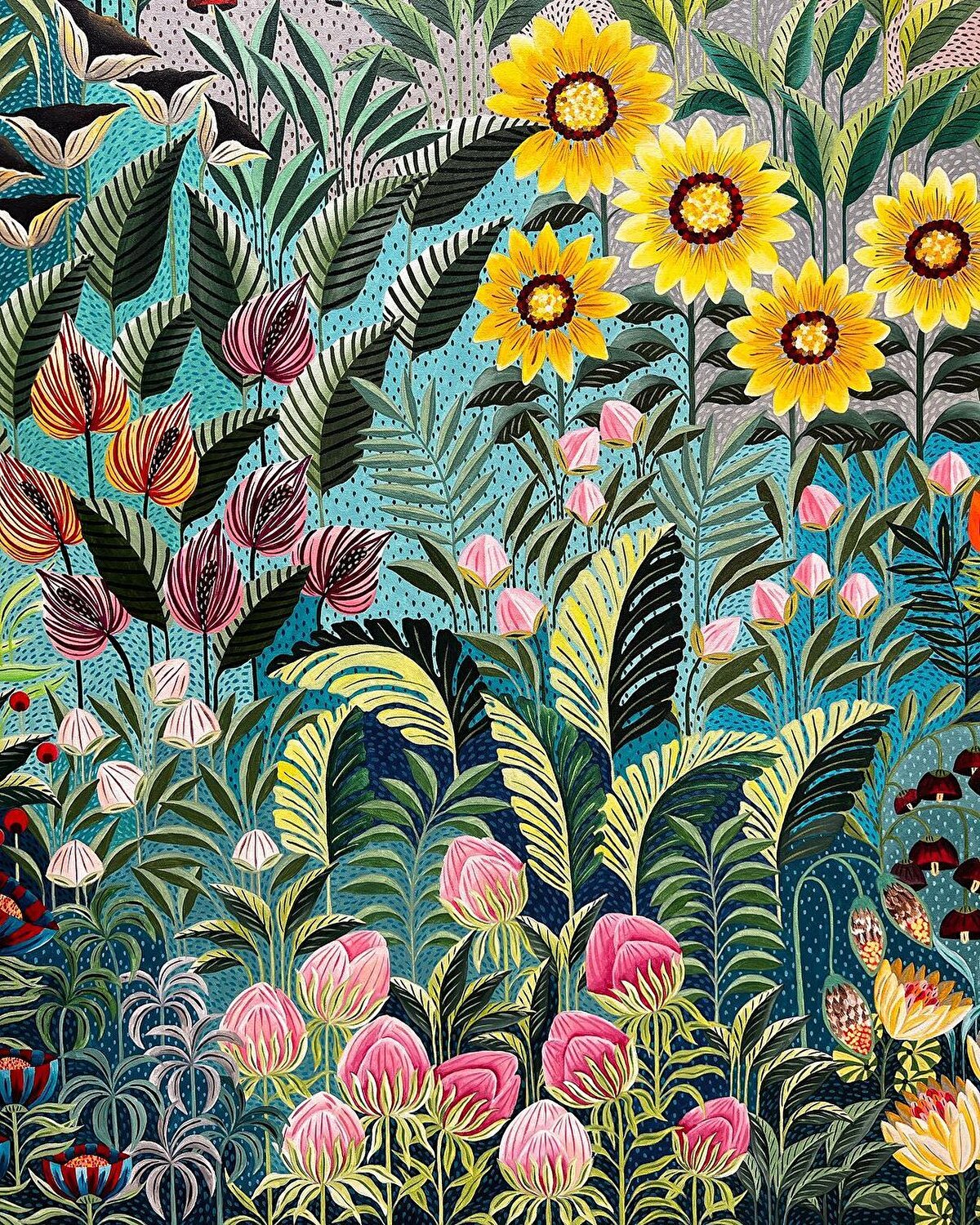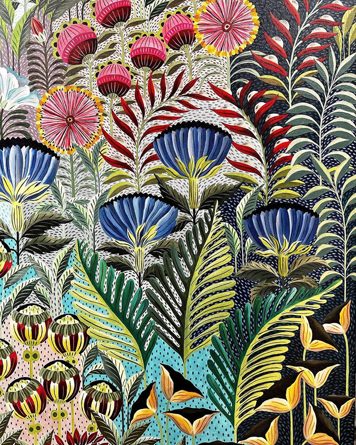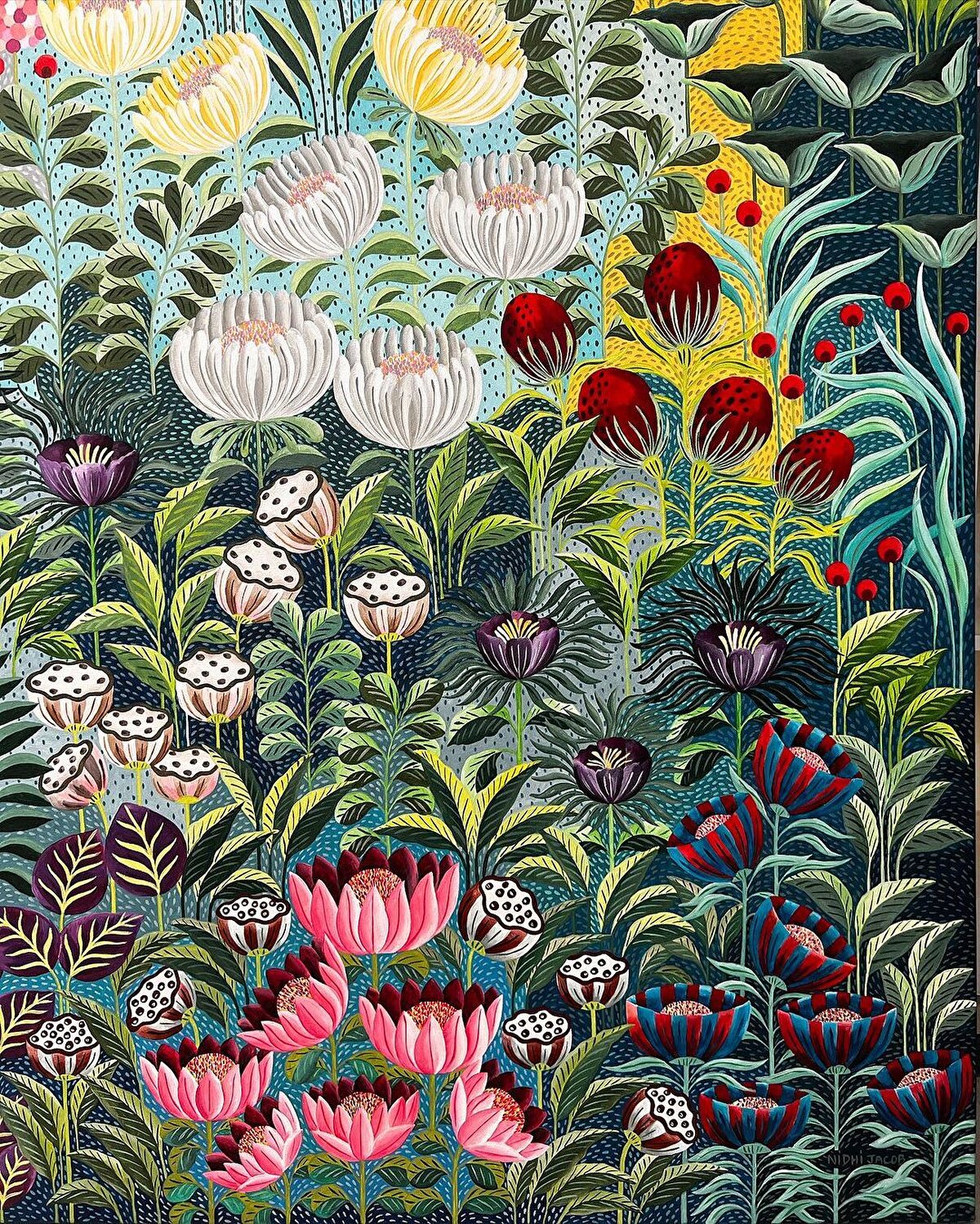 Hindistan'da yaşayan @nidhijacob_art, sayısız çiçek ve yaprağın canlı bir ritim içinde çiçek açtığı benzersiz dünyalarını resmediyor. Doğaya ve bitkilere olan tutkusu sanatçının eserlerindeki canlılıkla birlikte gerçeği anımsatan tablolarına dönüşüyor. Jacob, tuval, kâğıt, ahşap, metal veya kumaş üzerine akrilik boya kullanarak kalabalık çiçek bahçelerini adeta birer sanat eserine dönüştürüyor.