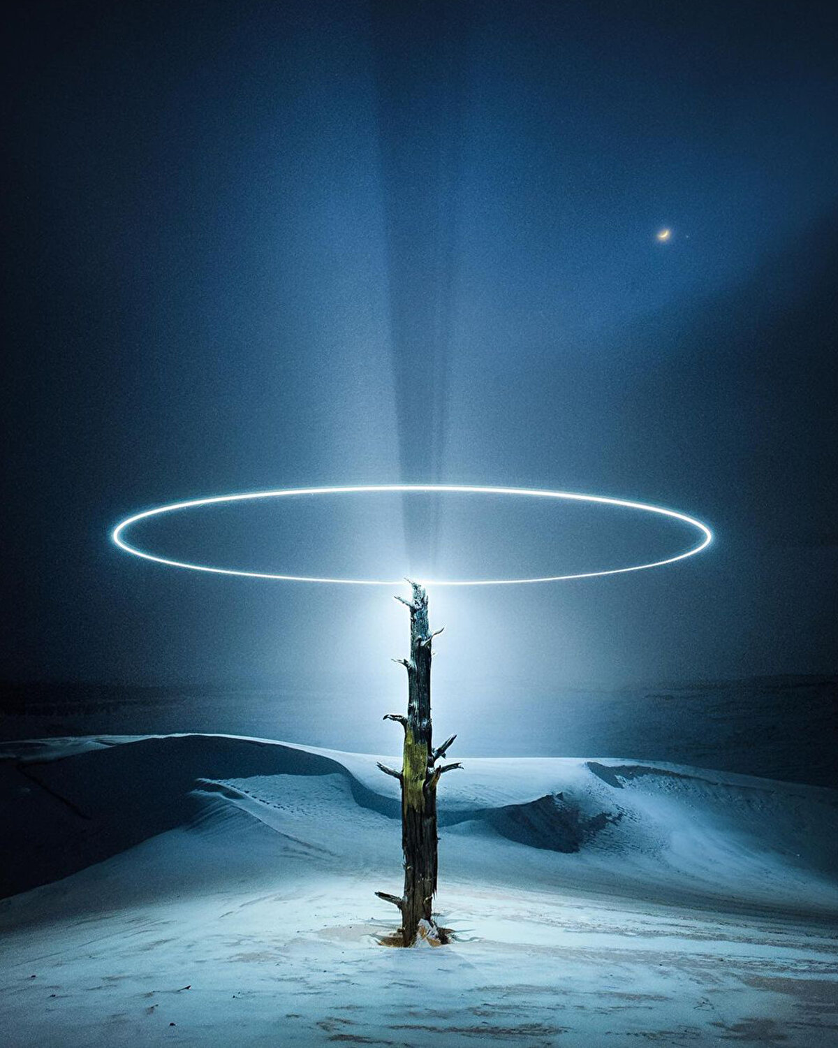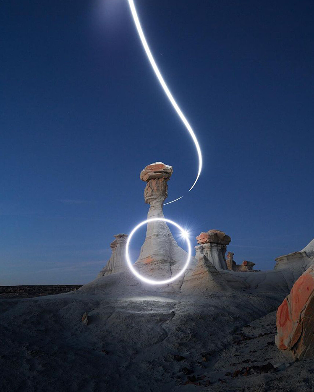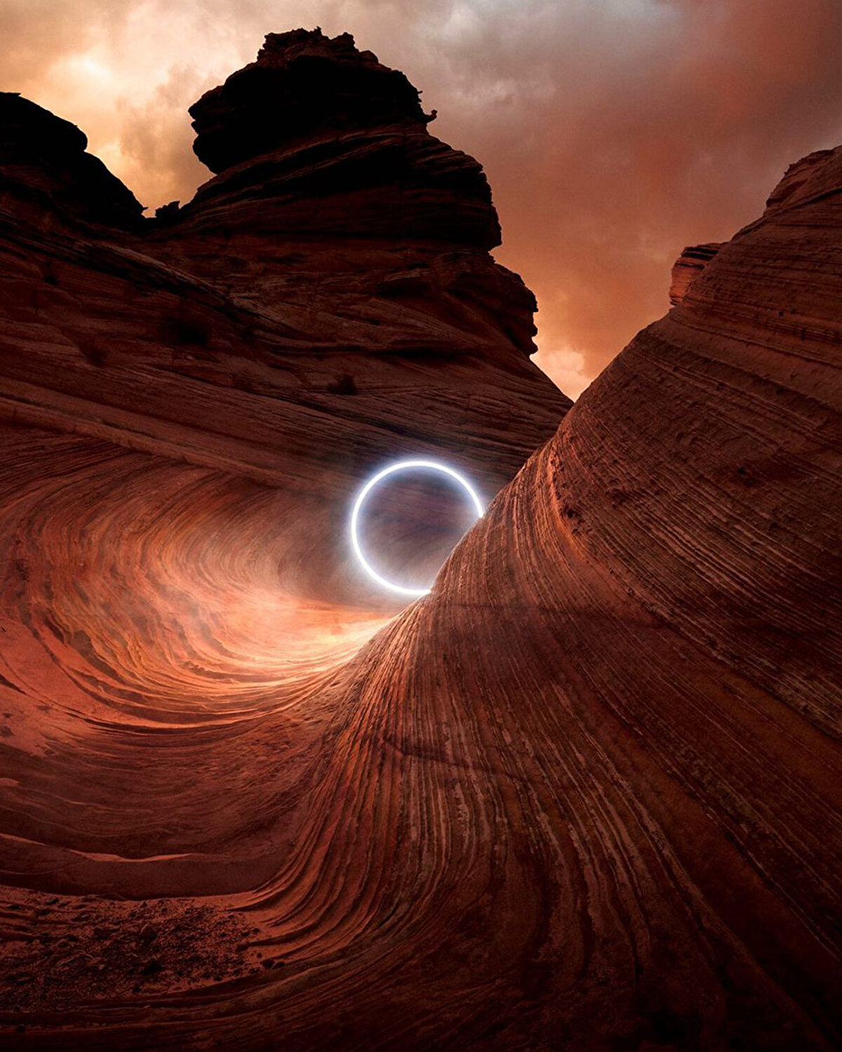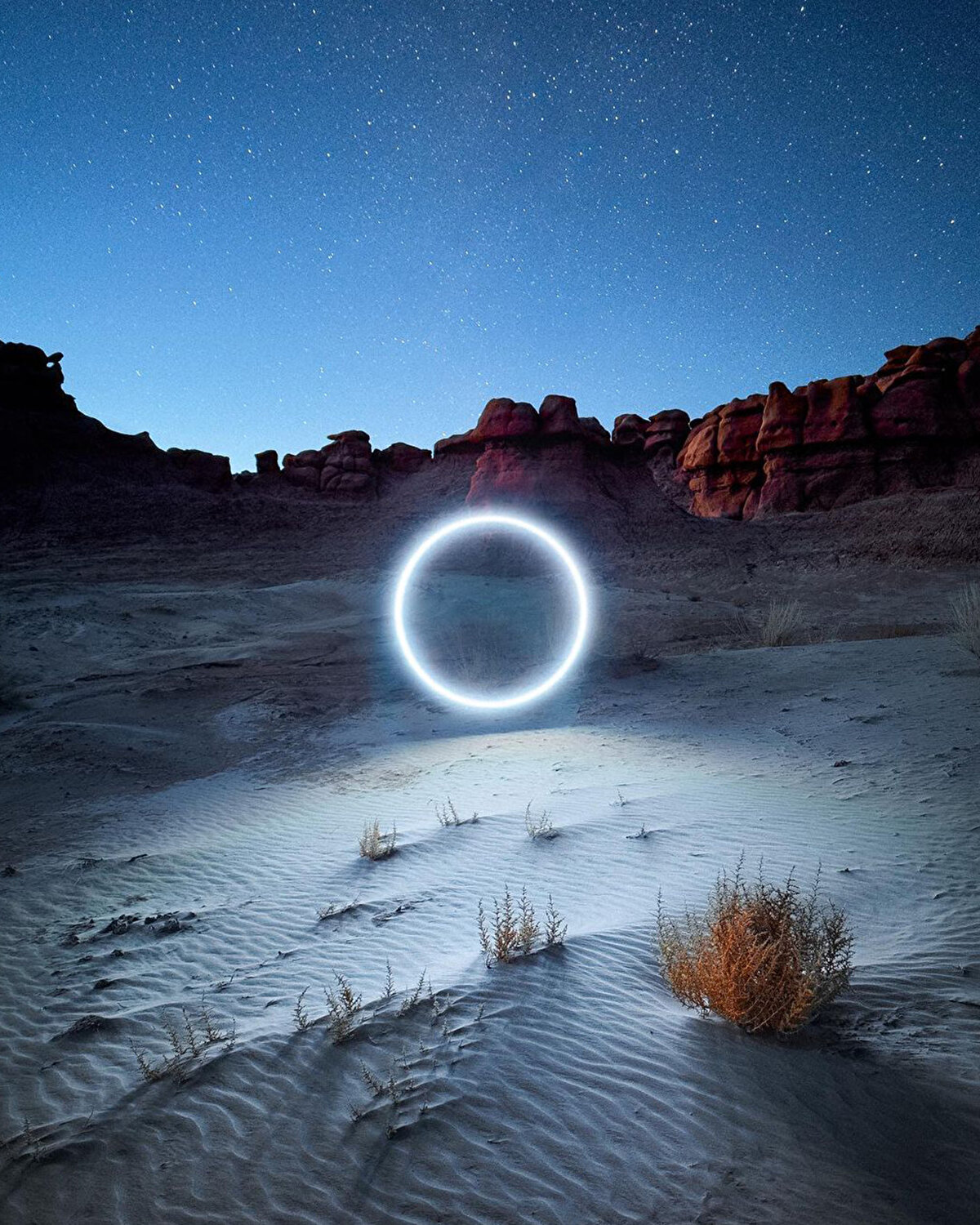 Chicago'da yaşayan İngiliz fotoğraf sanatçısı Reuben Wu (@reuben), çektiği fotoğrafları ışık hareketleriyle zenginleştiriyor. Sanatçı, yaklaşık on yıldır sarp kayalıklardan, gökyüzünden, ince bir çatlaktan akar gibi görünen ışıklarla fotoğraflarını sanki başka bir dünyaya aitmiş gibi görünen manzaralara dönüştürüyor. Karanlığın ve ışığın yan yana gelmesinin bu gerçek dışı havayı yoğunlaştırdığını söyleyen sanatçı, mekanların sessizliğiyle kendi kompozisyonlarını birleştiriyor. Çekimlerini genellikle loş akşam ışığında ya da gecenin karanlığında gerçekleştiren Wu, ardından sahnenin bazı bölümlerini özel yapım dronelar sayesinde aydınlatıyor. Her zaman yalnız kalabileceği uzak ve vahşi yerlere ilgi duyduğunu söyleyen sanatçı, yapay olarak aydınlatılması zor kayalıklara da ulaşıp onların parıldamasını sağlıyor.