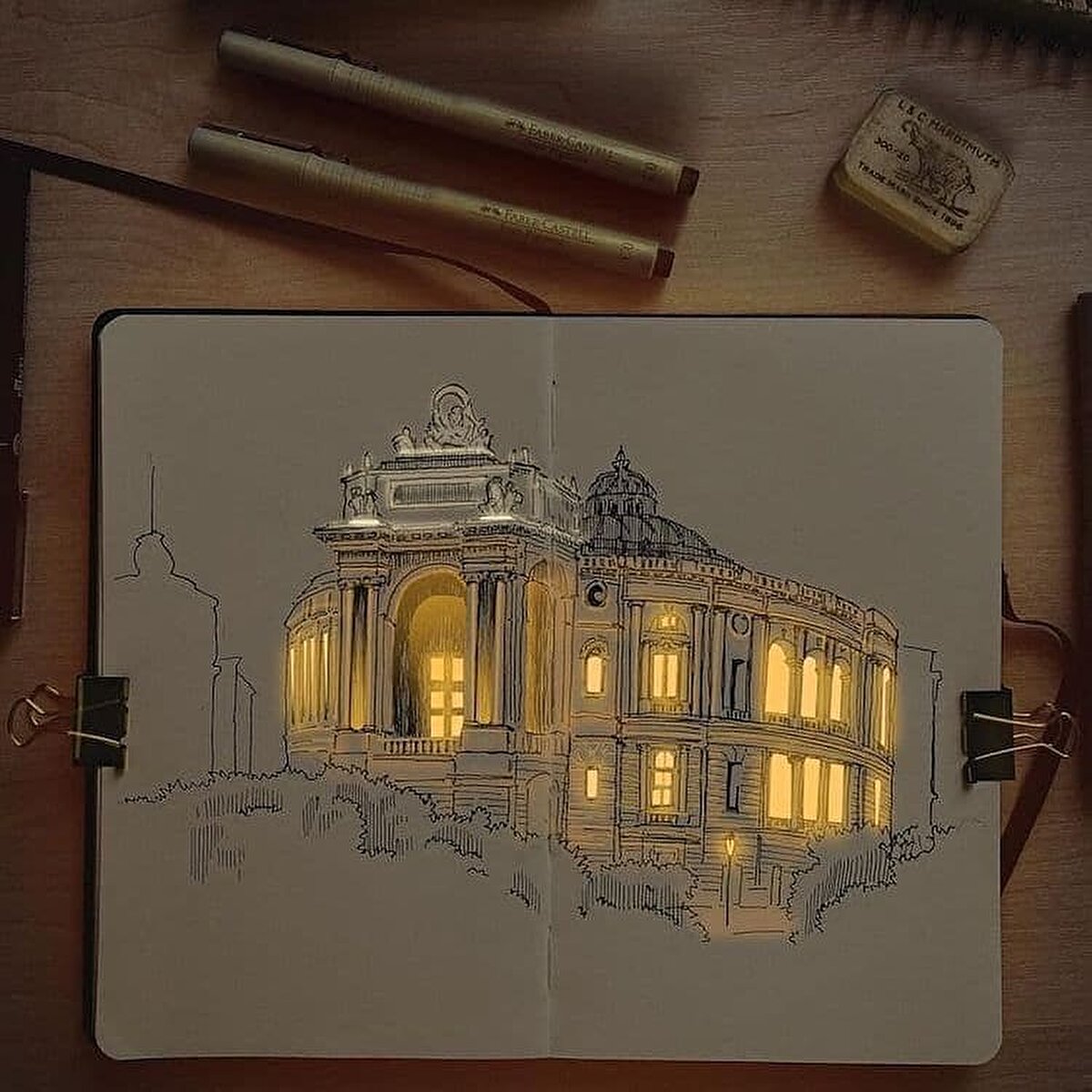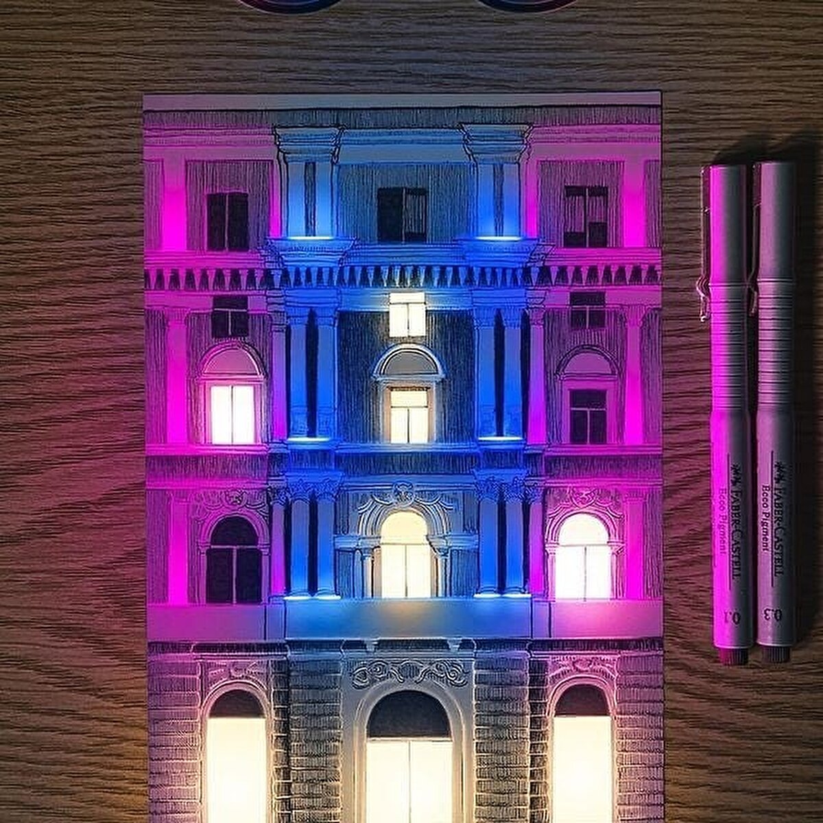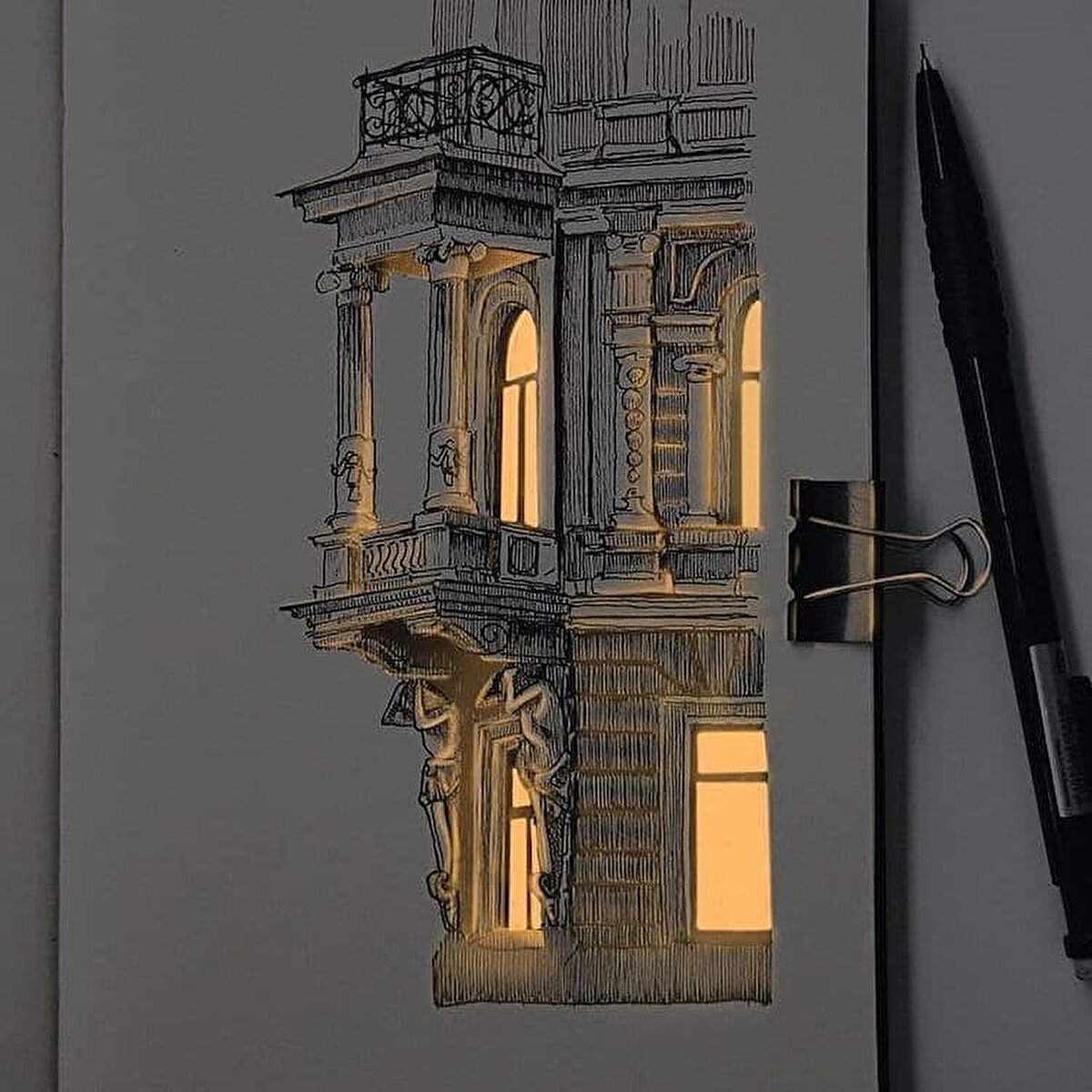 Ukraynalı sanatçı Nikita Busyak da bu “parlayan" eskiz serisinde gece mimarlığının büyüsünü yansıtıyor. Hassas çizgi çalışmaları ve gölgeleme teknikleri kullanarak çeşitli karmaşık binaları ve caddeleri kalemiyle bize aktarıyor. Busyak, daha sonra her parçayı loş ışıkta fotoğraflayarak ve pencereleri, tabelaları ve diğer ışık kaynaklarını yumuşak bir aydınlatmayla dijital olarak değiştirerek sanatını samimi bir ambiyansla dolduruyor.