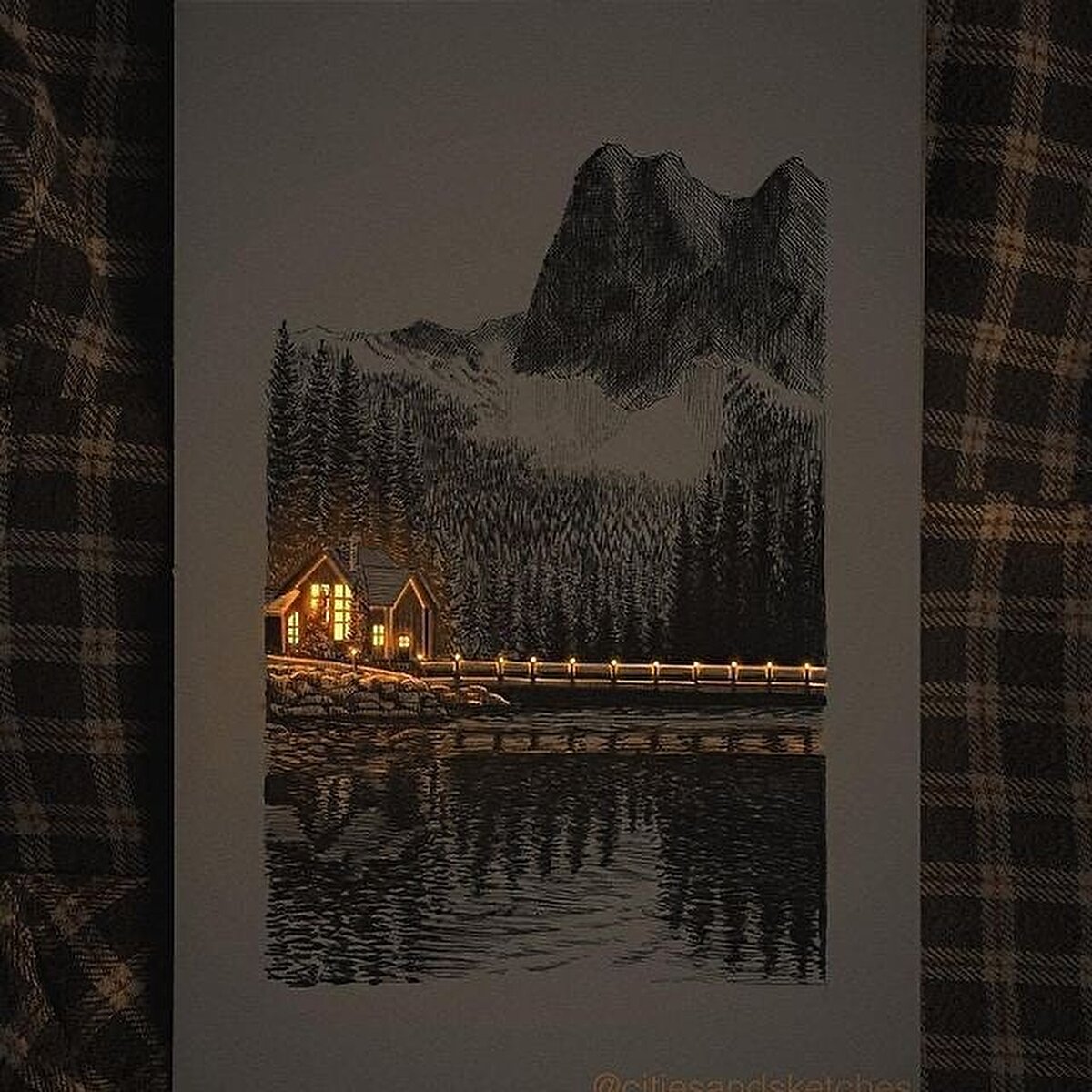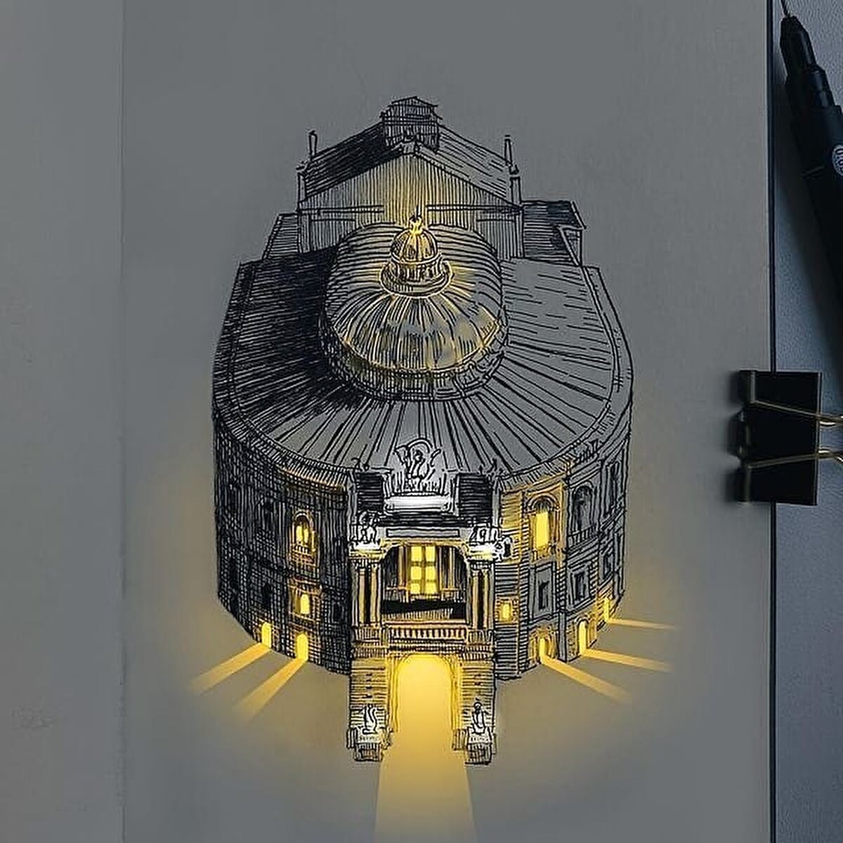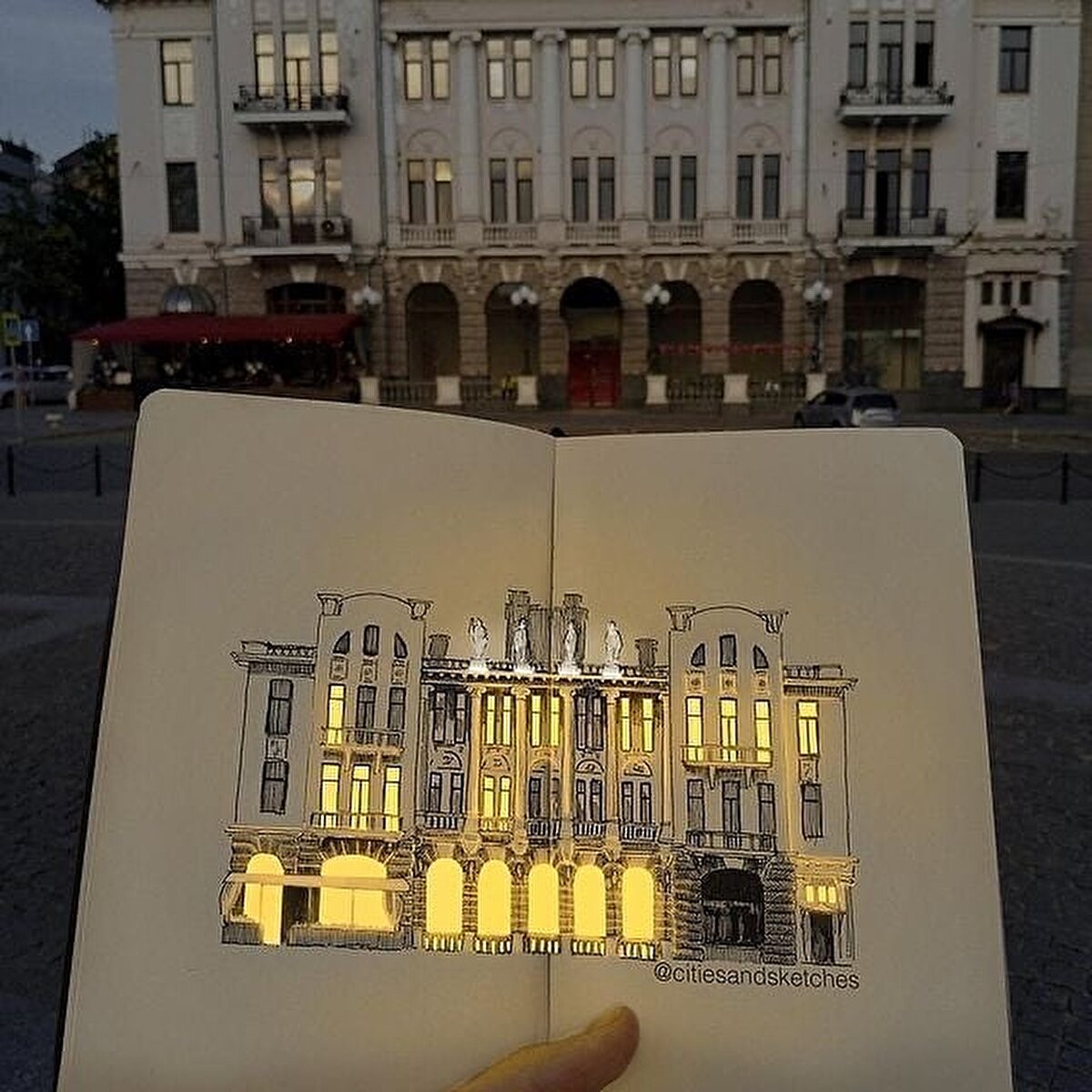 Ukraynalı sanatçı Nikita Busyak da bu “parlayan" eskiz serisinde gece mimarlığının büyüsünü yansıtıyor. Hassas çizgi çalışmaları ve gölgeleme teknikleri kullanarak çeşitli karmaşık binaları ve caddeleri kalemiyle bize aktarıyor. Busyak, daha sonra her parçayı loş ışıkta fotoğraflayarak ve pencereleri, tabelaları ve diğer ışık kaynaklarını yumuşak bir aydınlatmayla dijital olarak değiştirerek sanatını samimi bir ambiyansla dolduruyor.