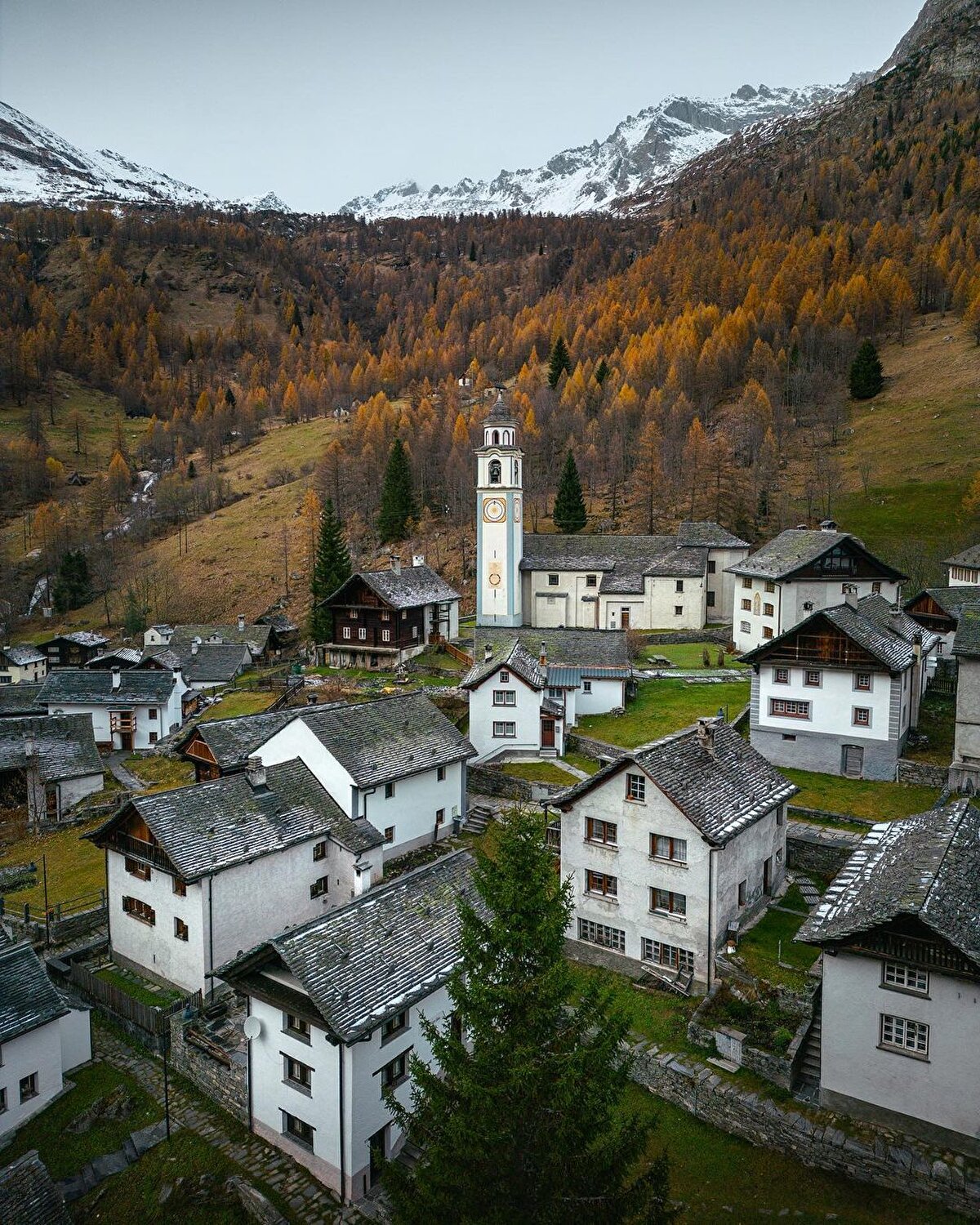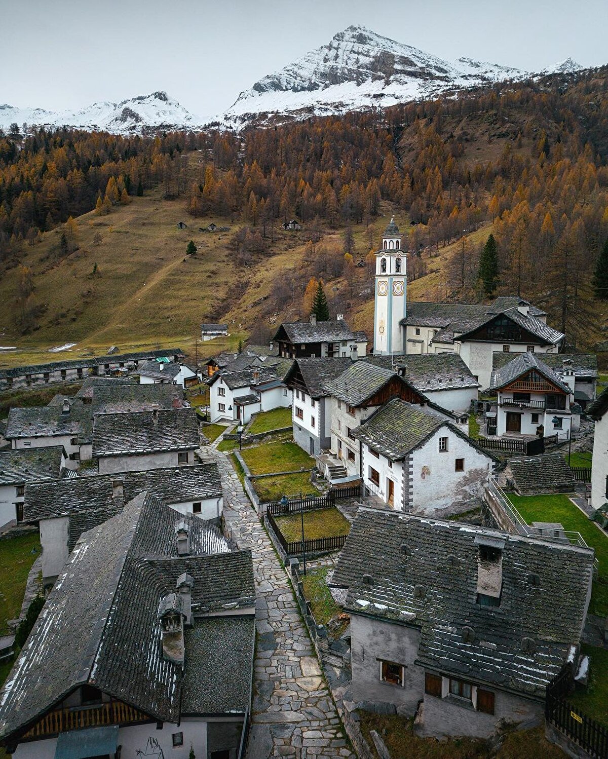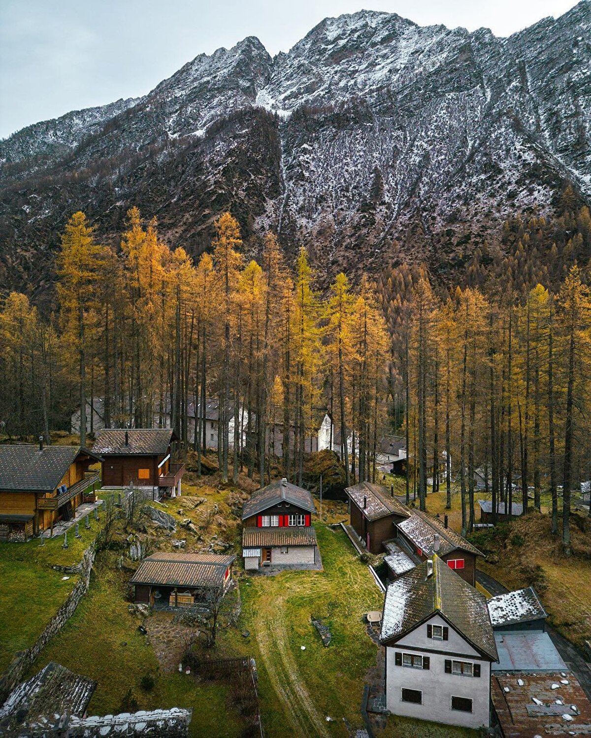 İlk bakışta tablo zannedeceğiniz bu harika manzaraya sahip yer, İsviçre'de bulunan Ticino kantonunun en yüksek dağ köyü olan Bosco Gurin.