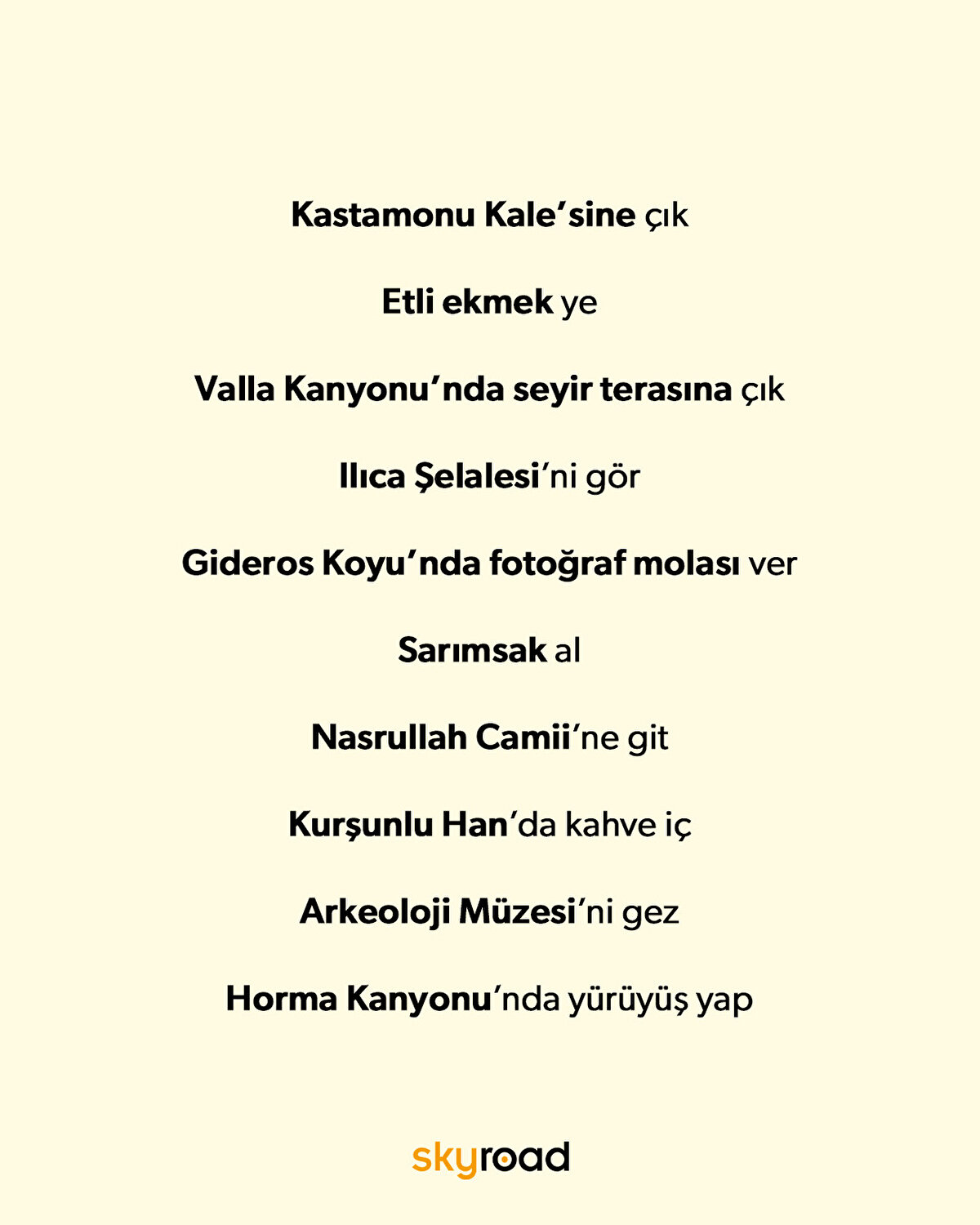 Deniz ve ormanın en görkemli şekilde buluştuğu yerlerden biri olan Kastamonu, Valla Kanyonu, Ilıca Şelalesi ve Arkeoloji Müzesi gibi hem tarihi ile hem de doğal güzellikleriyle keşfedilmeyi bekliyor. Kastamonu'da gezerken Kastamonu mutfağına ait lezzetlerin tadına bakmayı ve Taşköprü'nün meşhur sarımsağından almadan dönmeyin.