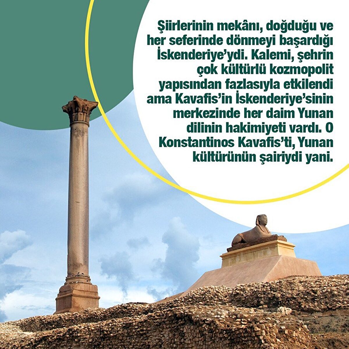 📌 Çağdaş Yunan edebiyatının zor şairi Kavafis, 1863'ün baharında bu şehirde, namlı ve yaslı İskenderiye'de doğdu. 70 yıllık hayat savaşının ana karargâhı da hep bu şehir oldu. Barbarlarını burada bekledi, şiirini burada söyledi, o kusursuz zırhını tam burada giydi. Memur oldu, sürgün oldu, şair oldu, kanser oldu. Ne olduysa burada oldu, İskenderiye'de. İki kez ayrıldı karargâhından. İlki babasının ölümü nedeniyle 9 yaşındayken 6 yıl süren İngiltere sürgünüydü, ikincisi İngiliz işgali nedeniyle 19 yaşındayken 3 yıl süren İstanbul macerası.
