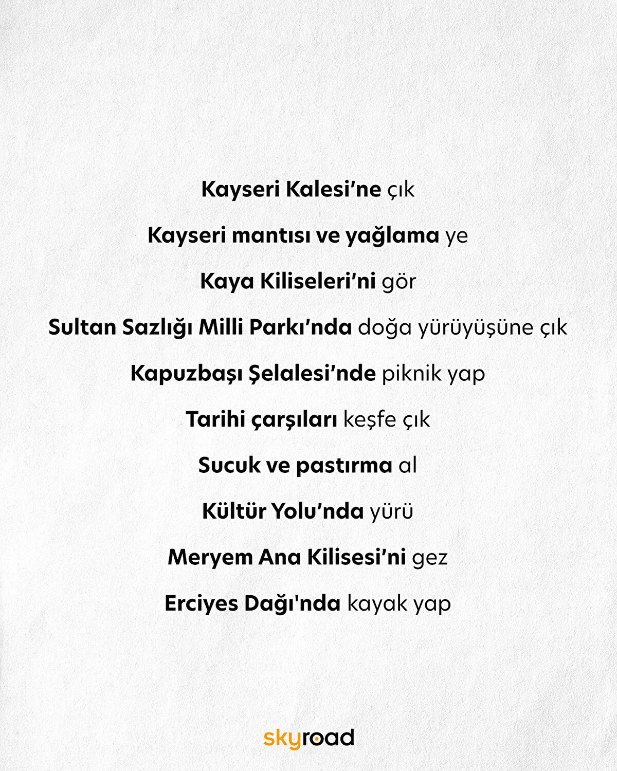İç Anadolu'nun üçüncü büyük kenti, aynı zamanda önemli bir sanayi ve ticaret merkezi olan Kayseri, yalnızca ülkemiz için değil, dünya için de önemli doğal güzelliklerin bazılarına ev sahipliği yapıyor. Köklü geçmişiyle ve her köşesinde barındırdığı tarihi eserler ile bir açık hava müzesini andırıyor. Dilerseniz kışın Erciyes Dağı'nda kayak yapabilir dilerseniz Sultan Sazlığı Milli Parkı'nda kendinizi doğaya bırakabilirsiniz.