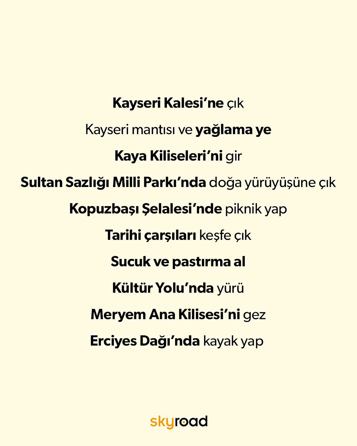 İç Anadolu'nun üçüncü büyük kenti, aynı zamanda önemli bir sanayi ve ticaret merkezi olan Kayseri, yalnızca ülkemiz için değil, dünya için de önemli doğal güzelliklerin bazılarına ev sahipliği yapıyor. Köklü geçmişiyle ve her köşesinde barındırdığı tarihi eserler ile bir açık hava müzesini andırıyor. Dilerseniz kışın Erciyes Dağı'nda kayak yapabilir dilerseniz Sultan Sazlığı Milli Parkı'nda kendinizi doğaya bırakabilirsiniz.