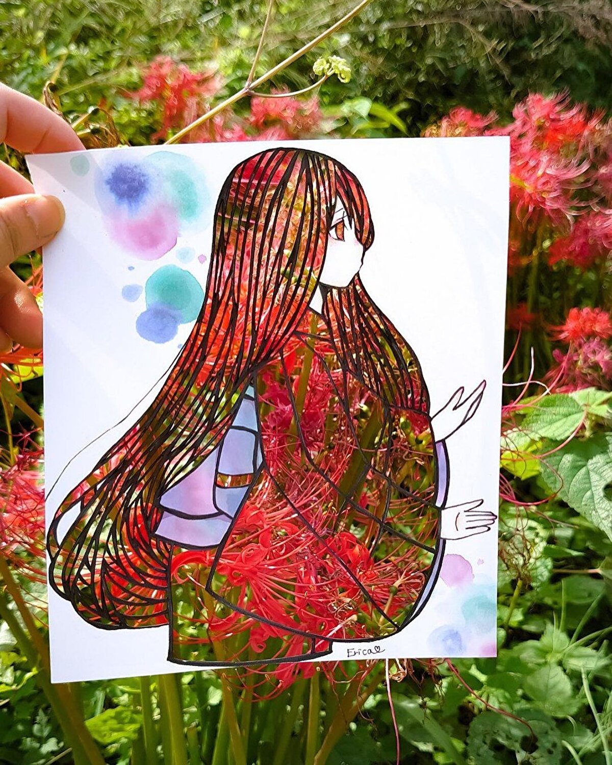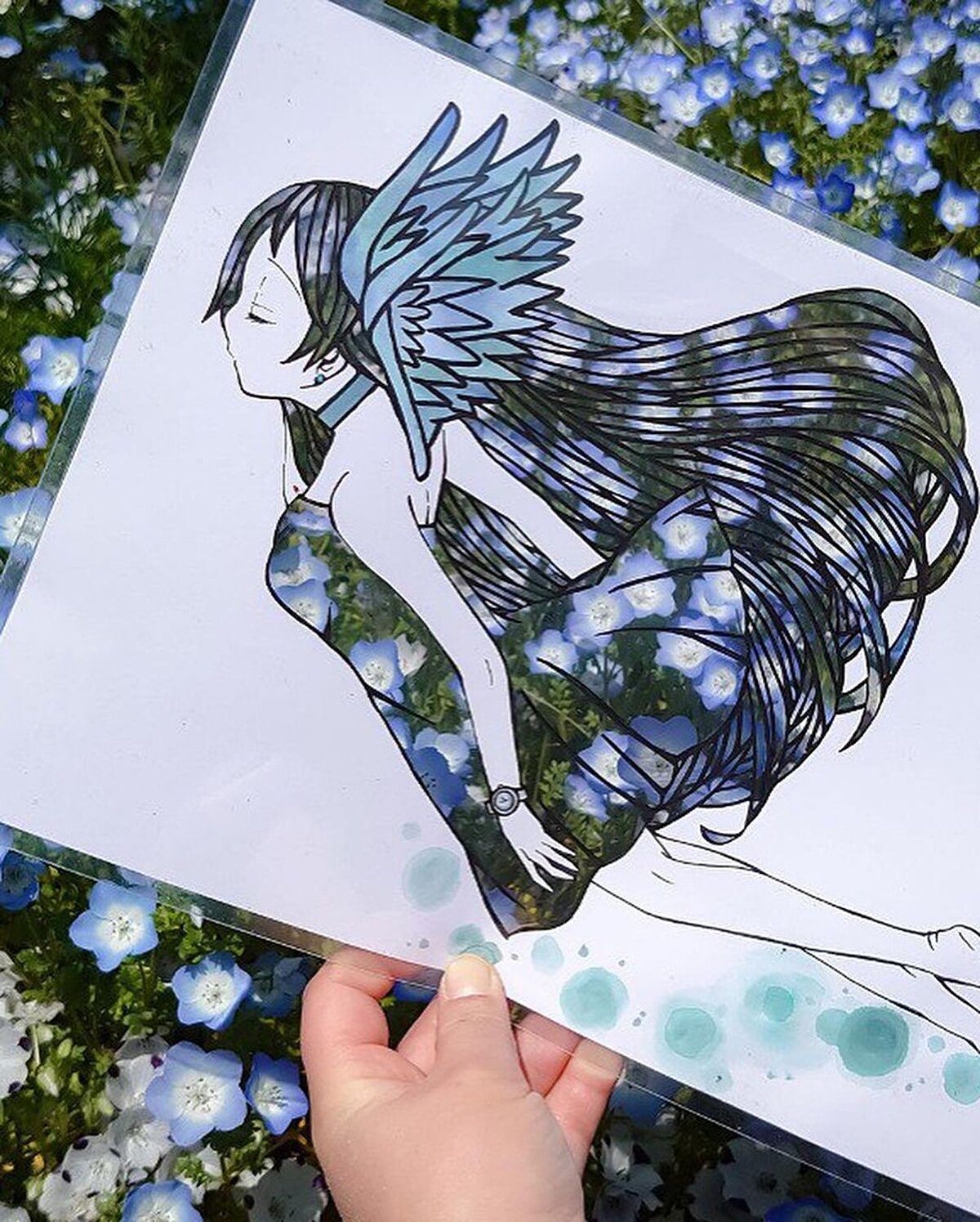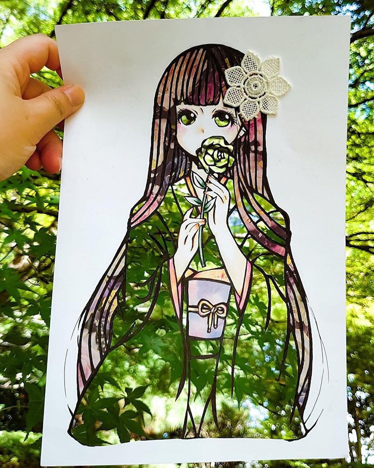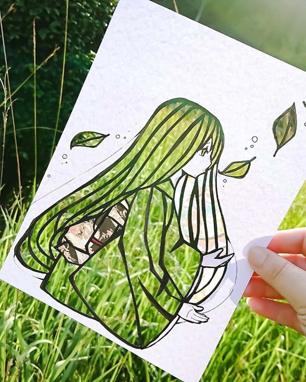 Sonuç olarak canlı yaprak desenli saçlara ve giysilere sahip ruhani, peri benzeri karakterler ortaya çıkarıyor. Her bir peri karakteri kağıt üzerinde yaşasa da doğanın bir parçası gibi görünüyor. 🧚🏼♀