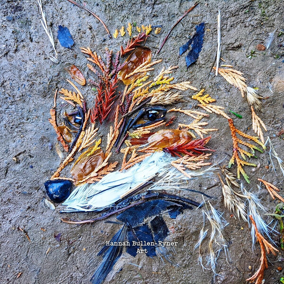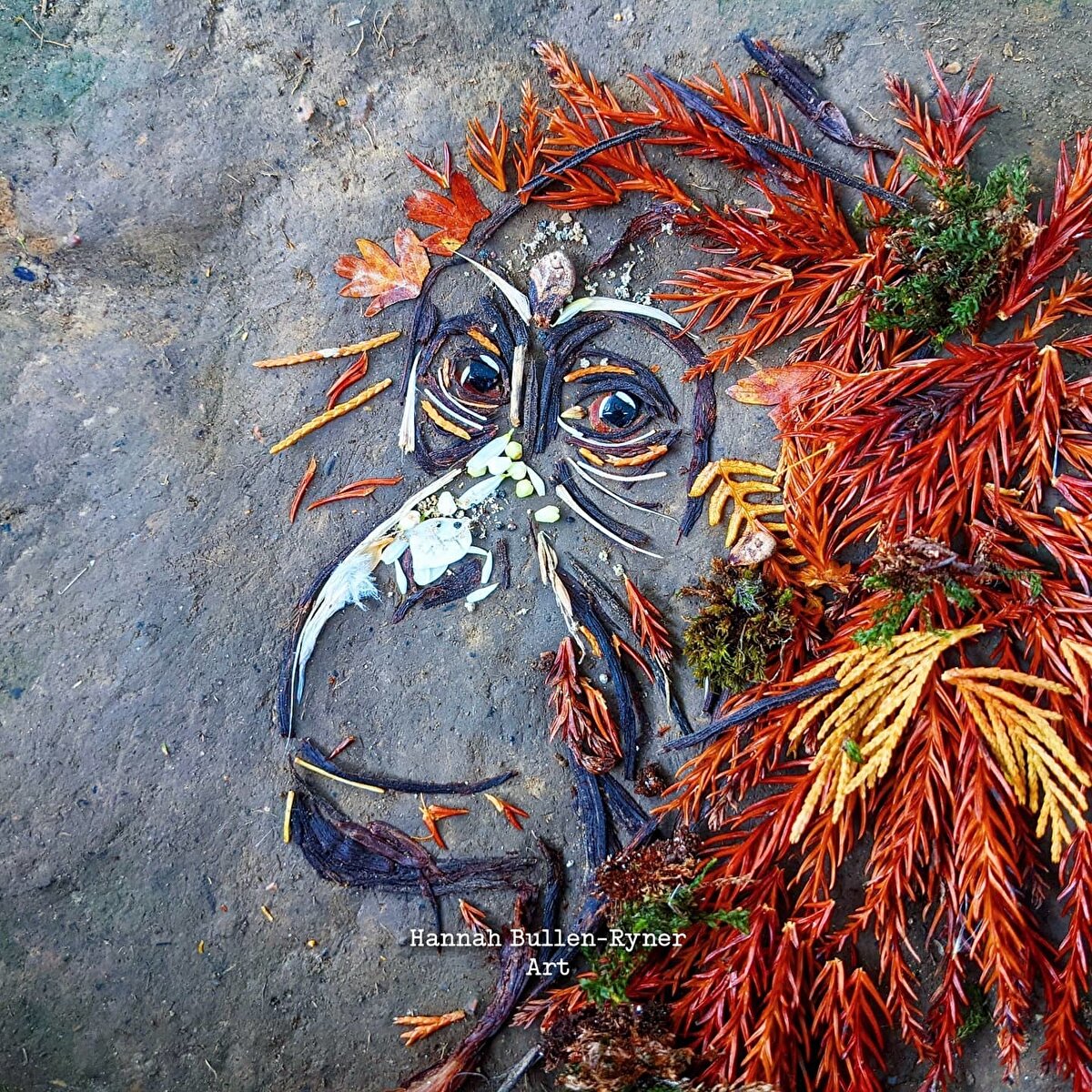 🦊 Land art, arazi sanatı, yeryüzü sanatı ya da toprak sanatı; birkaç farklı şekilde çevrilen bu sanatın mantığı doğa bulunan malzemelerle bir tasarım ortaya çıkarmak. Hannah Bullen-Ryner da bunu yapıyor. Doğada bulunan dalları, yaprakları, meyveleri, çiçekleri ve daha birçok materyali kullanarak ya toprak zeminde ya da meşe üzerinde genellikle hayvan portreleri çalışıyor.