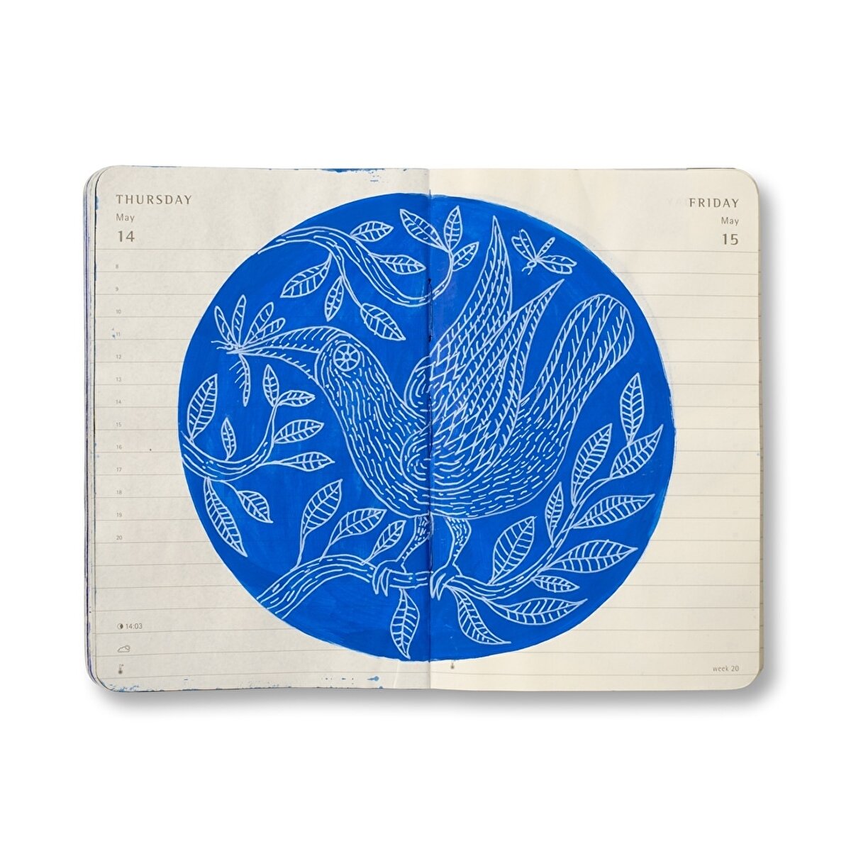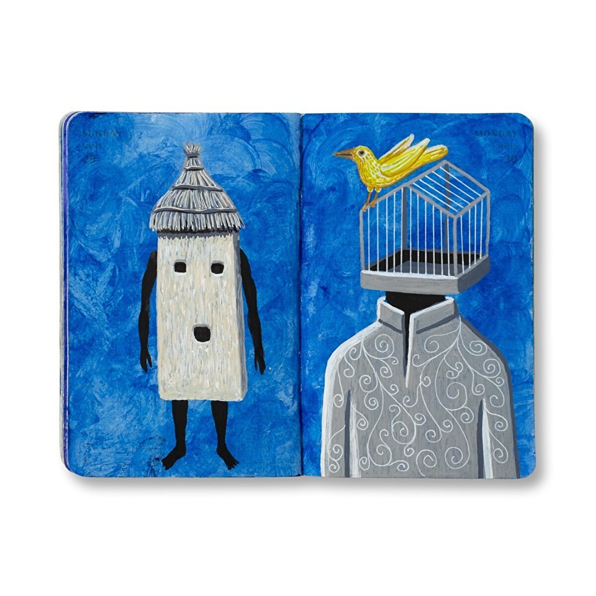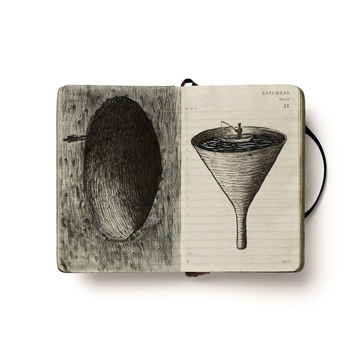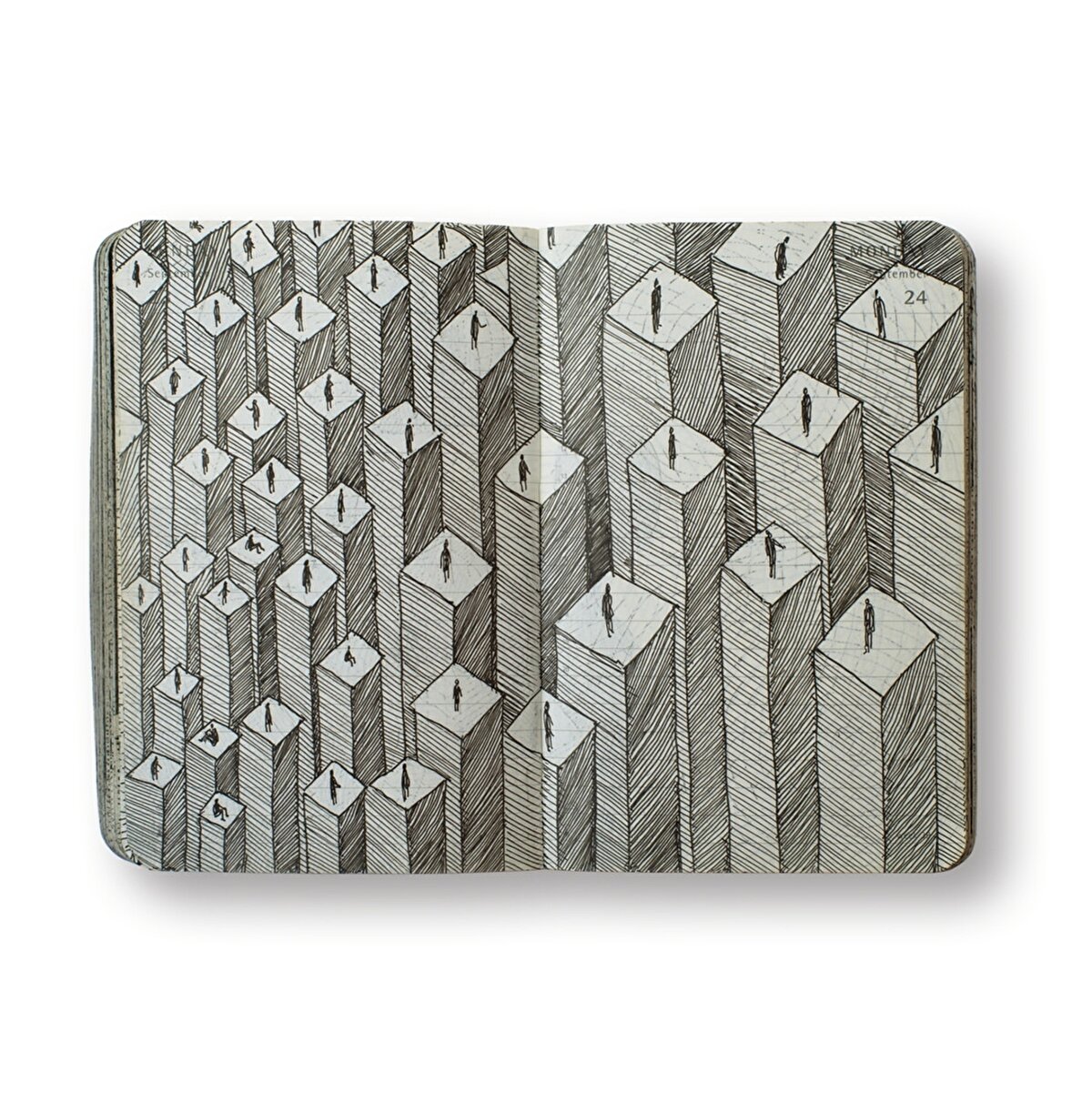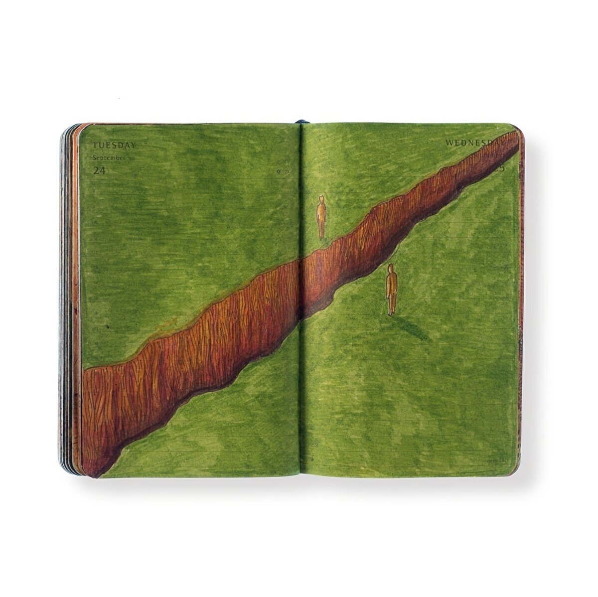 İllüstratör ve grafik tasarımcı @diariovisual_pepcarrio, not defterlerinin iki ayrı sayfasına çizdiği tek görseli ortada bir ayrım yokmuşcasına bir profesyonellikle eserler üretiyor.