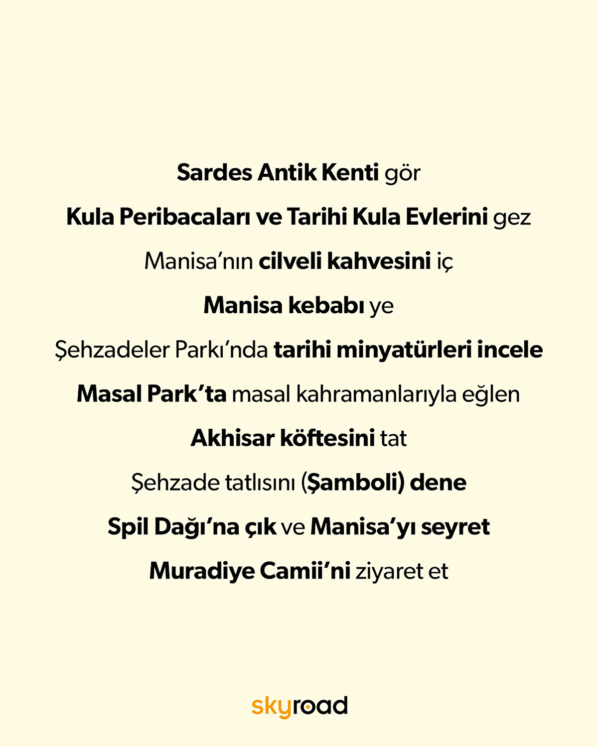 Ege Bölgesi'nin incisi Manisa, doğal güzellikleri, tarihi zenginlikleri ve kültürel mirasıyla misafirlerine unutulmaz bir deneyim sunuyor. Spil Dağı Milli Parkı'nda doğa yürüyüşleri yapabilir, ünlü Manisa lalesinin açtığı mevsimde rengarenk manzaraların tadını çıkarabilirsiniz. Antik çağların izlerini taşıyan Sardes Antik Kenti, Lidya uygarlığının görkemli geçmişine kapı aralarken, Kula Peribacaları'nda benzersiz doğal oluşumları keşfedebilirsiniz. Manisa'nın tarihi çarşıları ve bedestenlerinde dolaşarak yerel el sanatlarına göz atabilir, meşhur Mesir Macunu'nun tadına bakabilirsiniz. Aynı zamanda Muradiye Camii ve Sultan Camii gibi Osmanlı mimarisinin zarif örneklerini görmek de şehrin kültürel yönünü daha iyi anlamanızı sağlar. Şehrin sakin atmosferinde Ege'nin sıcak misafirperverliğini hissedebilirsiniz.