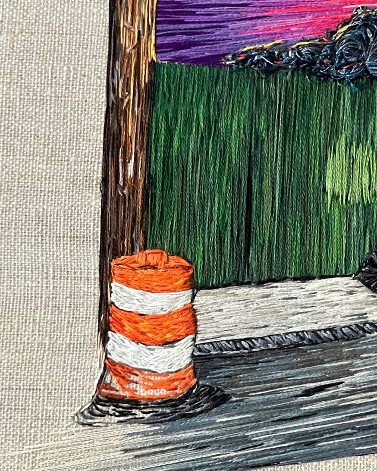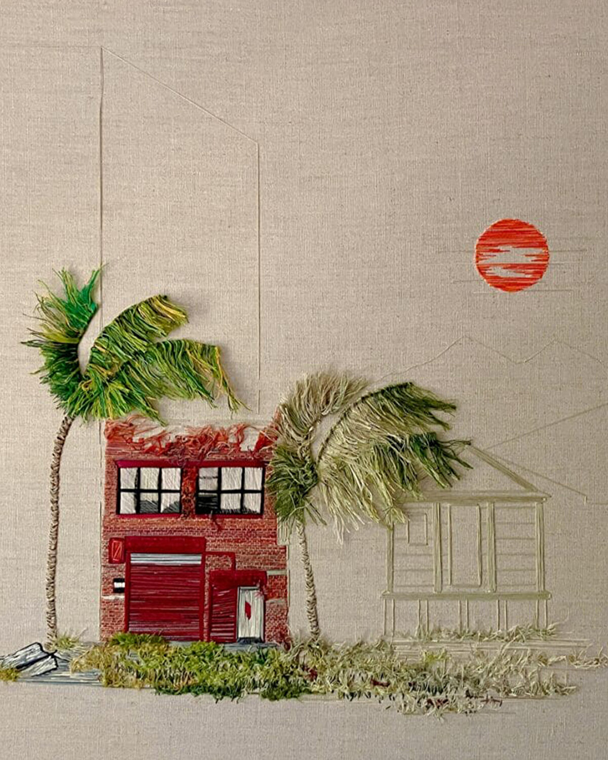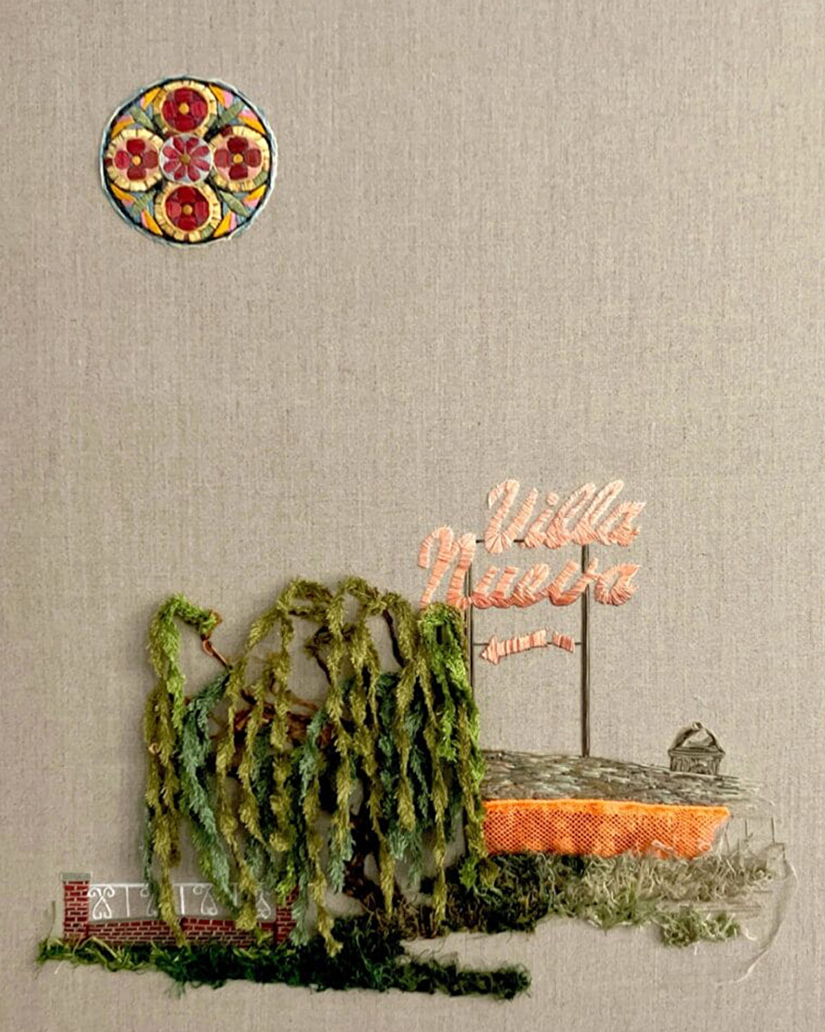 New York Bronx'taki çocukluk anılarından kesitleri ailesinin memleketi Porto Riko ile birleştiren sanatçı, keten kumaş üzerine pamuk ve metalik iplikle bilindik şehir manzaralarını işleyerek hayal gücü ve rengarenk ipliklerle saklamak istediği anıları canlı nakışlara dönüştürüyor. Çocukluğundan kalan hatıra anları, manzaraları ve gündelik mahalle yaşamından kesitleri aklının bir köşesinden çıkarıp nakış işleme tekniğiyle kumaş üzerine aktaran sanatçı @msmelissacalderon, bazen bir gün batımı manzarası, bazen renkli kapıların olduğu bir mahalleden kesitler bazen de gündelik eşyaları renkli iplikler aracılığıyla kusursuz şekilde keten kumaş üzerine işliyor.