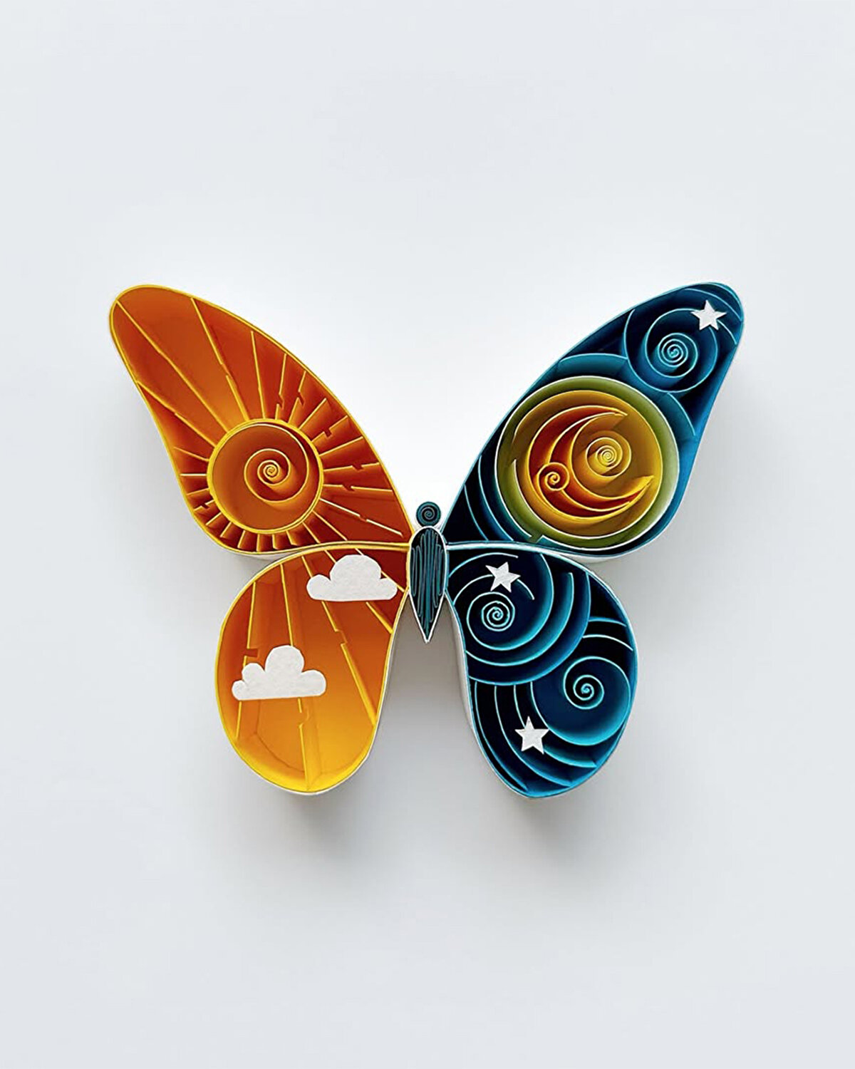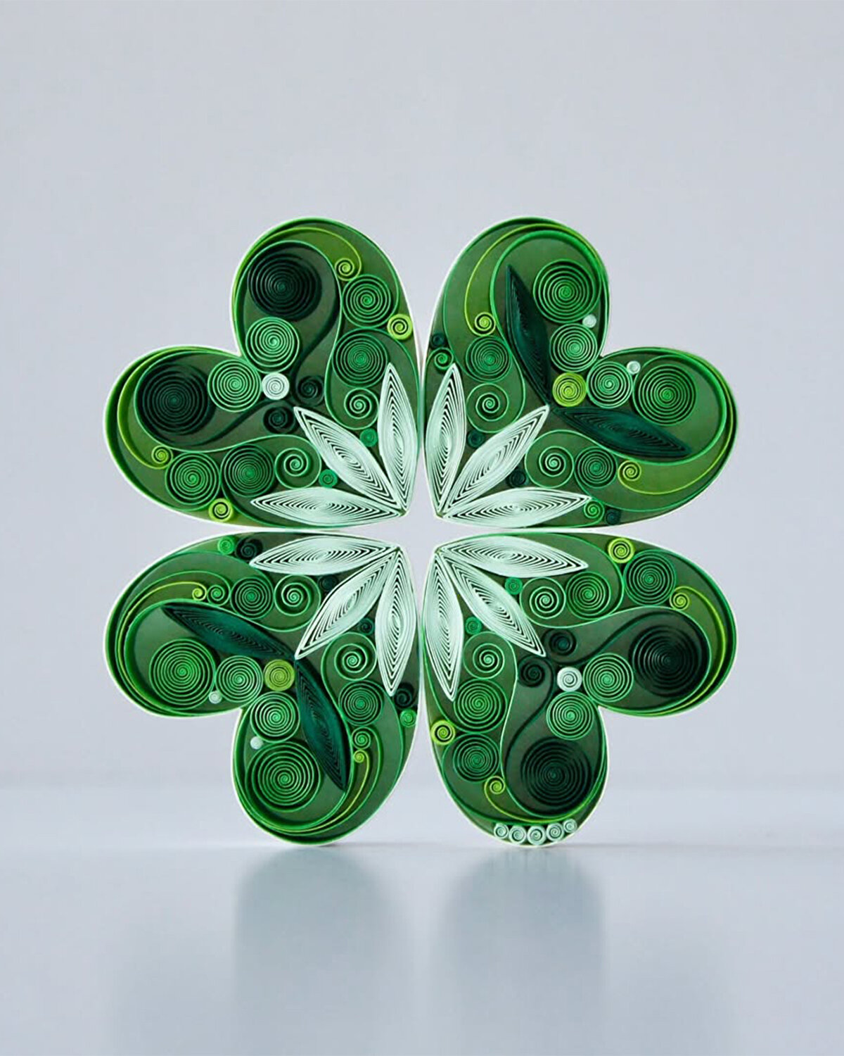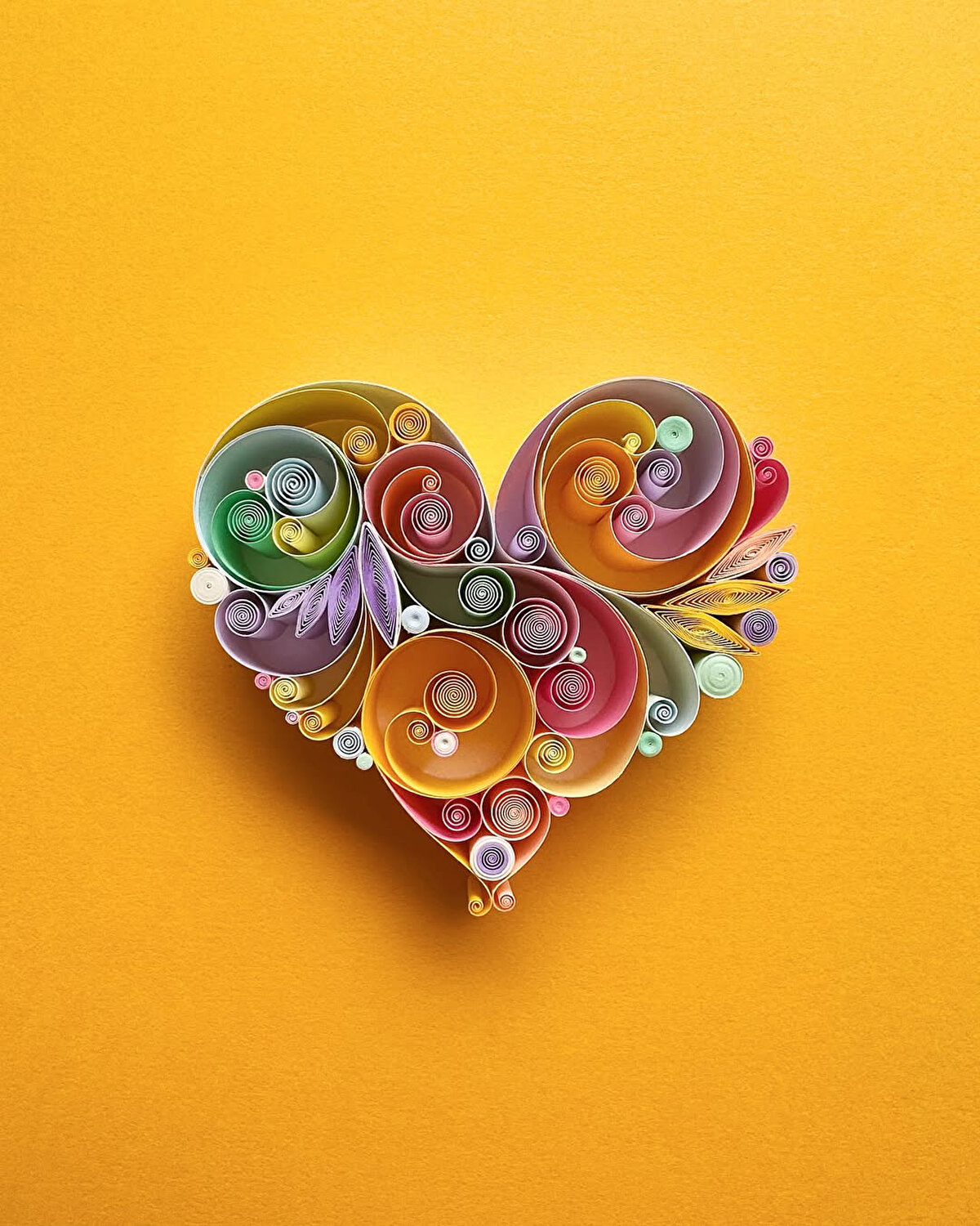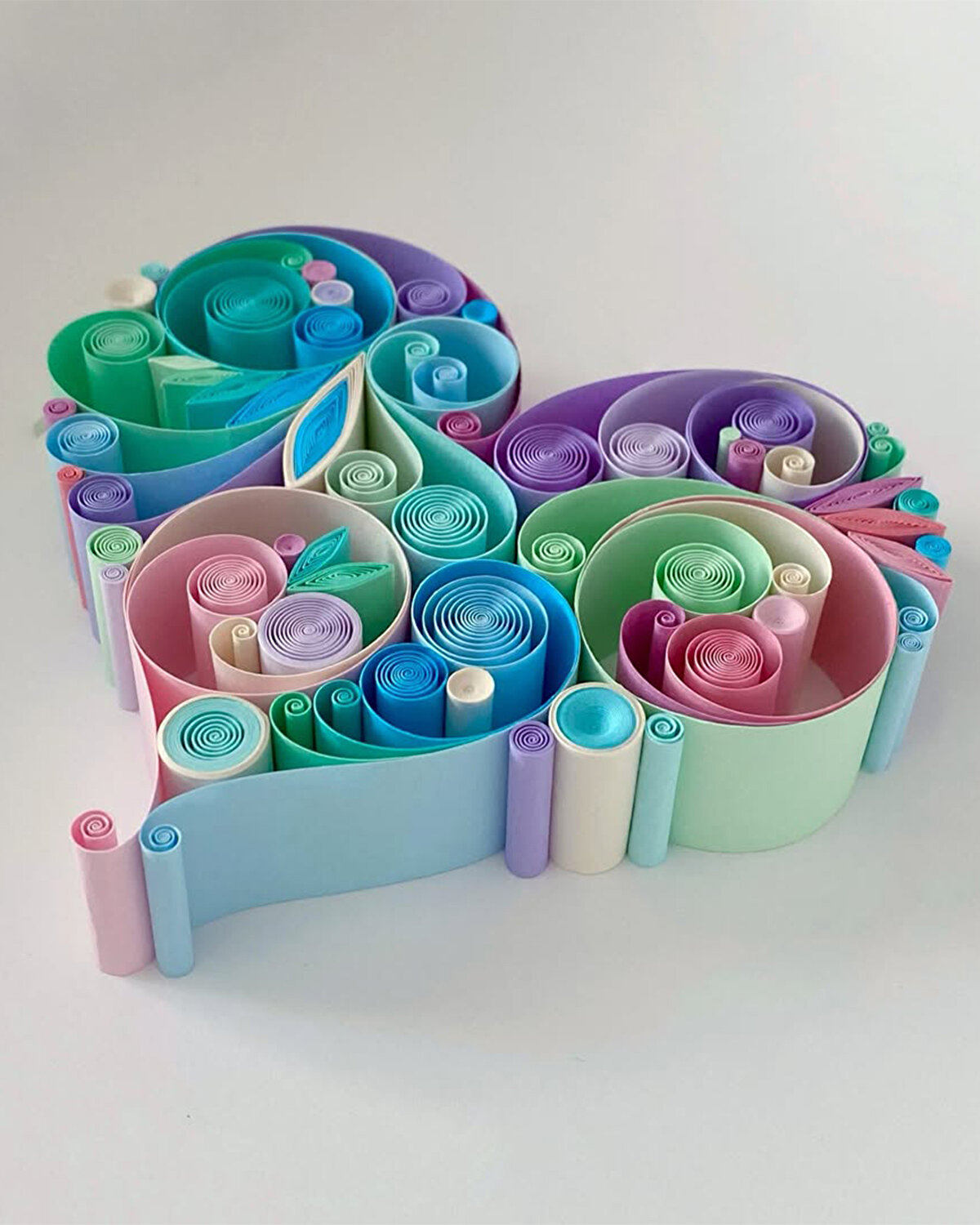 Eserlerini yine kağıttan çevrelediği çerçeveler içerisine alan sanatçı, çerçeveyi de tıpı eserler bir bütün gibi ortaya koyuyor. Çalışmalarının bu kadar kusursuz ve nizami görünmesini sağlayan şeylerden biri bizce renkler! Sabır gerektiren ve bir okadar da zihin dinlendiren quilling sanatı, hobi olarak edinilse bile büyük bir özveriye ihtiyaç duyuyor.