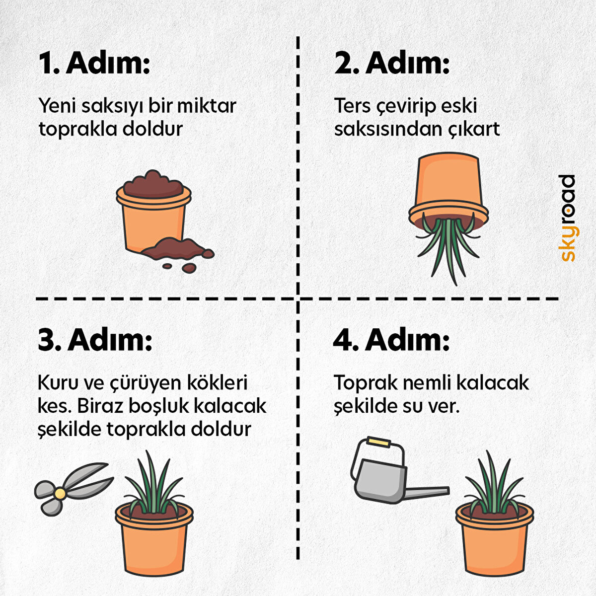 📌 Saksısını değiştireceğiniz bitkinizi 1 veya 2 gün öncesinden sulayın 📌 Toprak karışımını yeni saksının belirli bir kısmına kadar ekleyin 📌 Bitkiyi bir elinizle tutarak, sapı parmaklarınızın arasında olacak şekilde ters çevirin 📌 Nazikçe bitkinize ve köklerine zarar vermeden bitkiyi dışarı çekin 📌 Kökleri saran fazla toprağı temizleyin ve köklerin bakıma ihtiyacı var mı kontrol edin 📌 Kuru veya çürümüş kökler varsa bir makas yardımı ile kesin 📌 Bitkiyi yeni saksıya yerleştirin ve kalan toprağı yüzeyinde birkaç santim boşluk bırakarak etrafına ekleyin 📌 Bitkinizi yeteri kalan sulayın