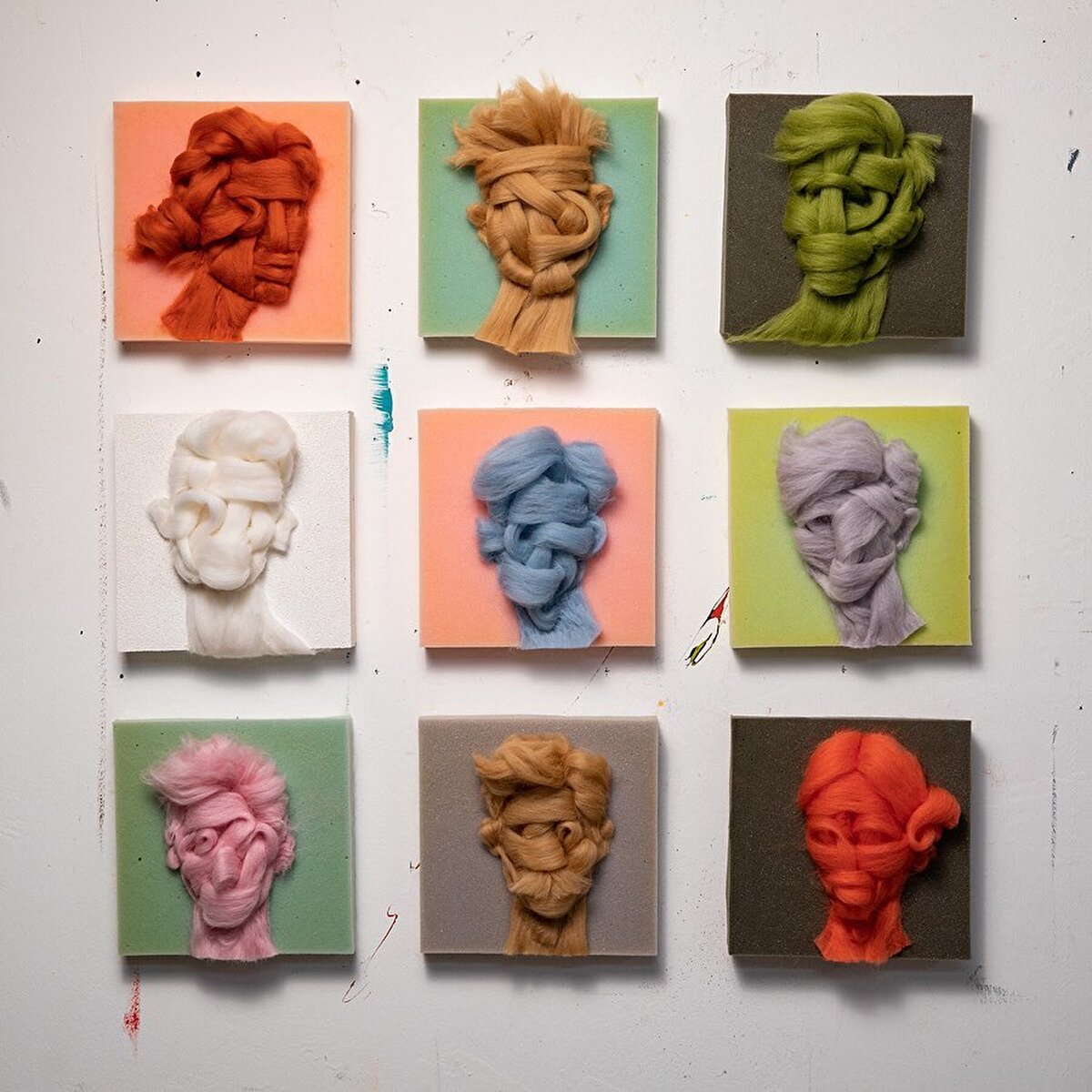 💭Bu seride yün fitiller hafif burunlara, büzüşmüş ağızlara ve akan saçlara dönüşüyor. İçinden geçtiğimiz kırılgan zamanlarda yeni malzemeler bulma ihtiyacından bahseden Khoshroo, yün malzemenin portrelerine sıcaklık ve samimiyet getirdiğini söylüyor. ⠀