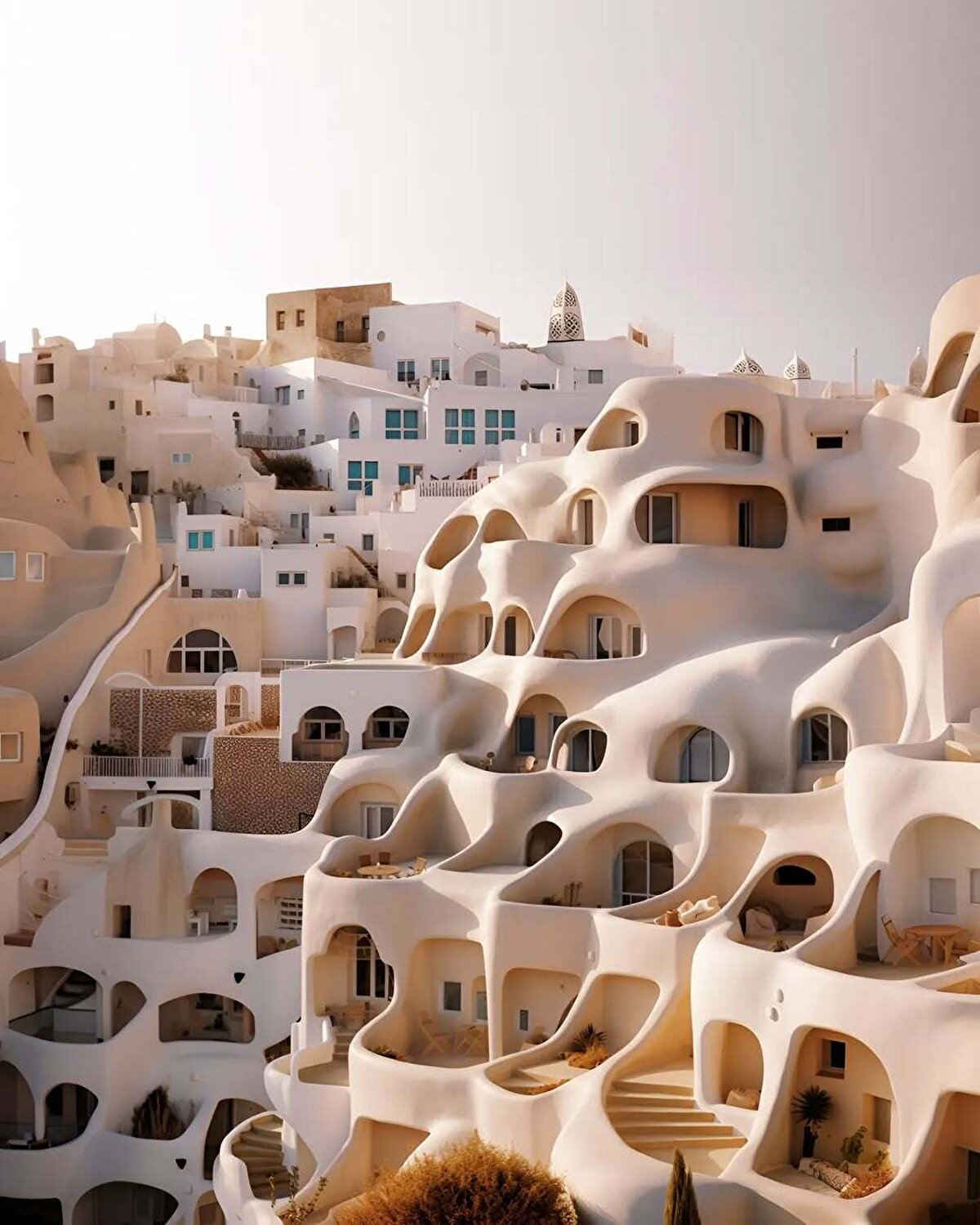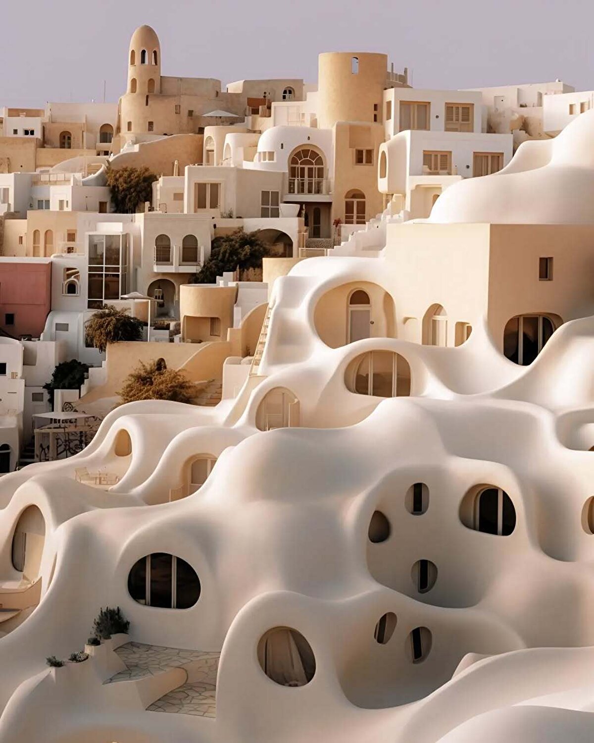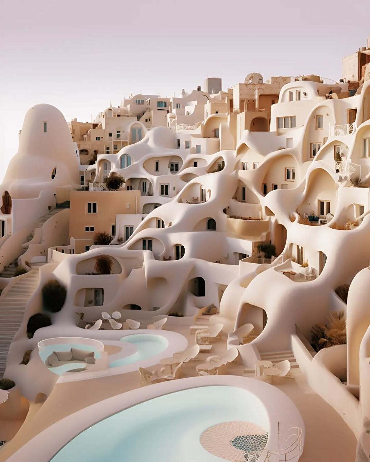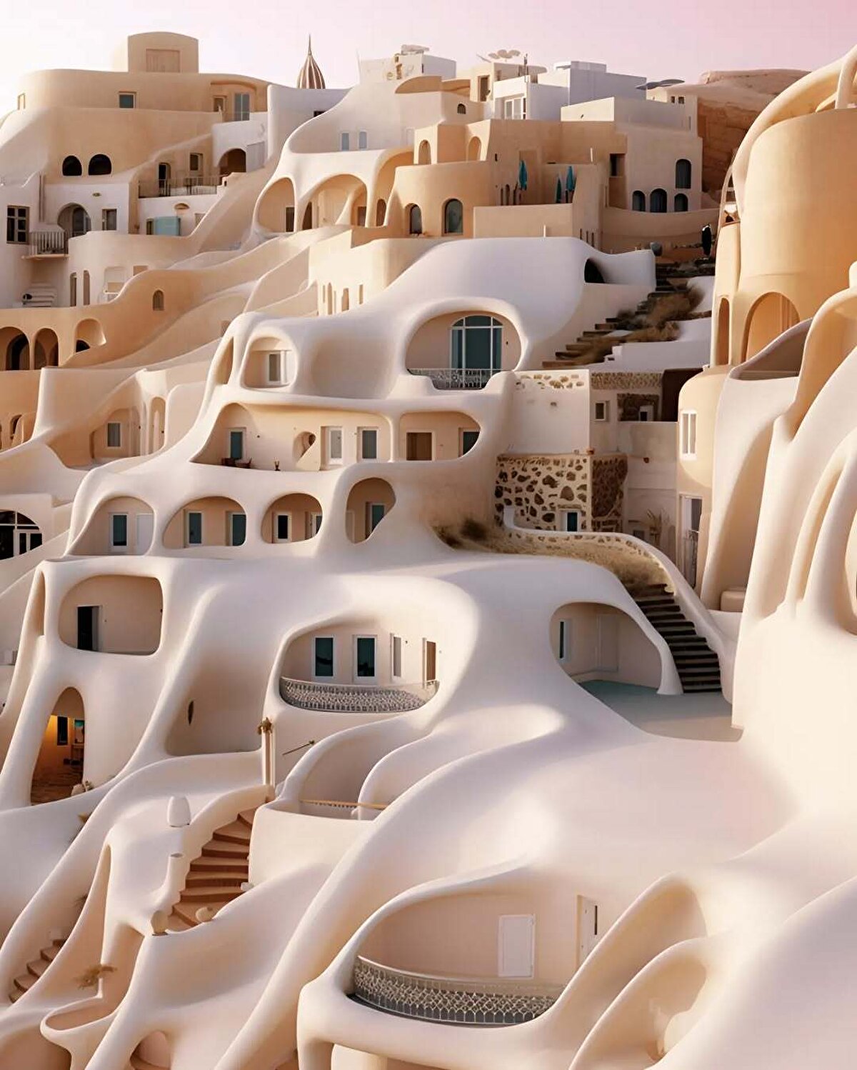 @spathumpa'nın doğal yaşam ile insan yaşamı arasındaki ilişkiye dikkat çekerken fiziki eğriliğin doğallığına da vurgu yaparak tasarladığı bu eser kendine özgü bir formda hayal edilmiş. Santorini'deki beyaz evlerin modern bir dokunuşla dönüştüğü görünümünde olan bu yapılar yapay zekanın hayal gücünü net bir biçimde ortaya koyuyor. Tıpkı deniz dalgalarını andıran bina cephesi geleneksel mimariden çok uzak, farklı ve göz alıcı bir şekilde tasarlanmış. Pastel renklerin dingin atmosferi de bu hayali tasarımın bir bütün haline gelmesini sağlamış. Dijital dokunuşun geleneksel mimari üzerindeki etkisi yapıyı akışkan hale getirerek düz duvarlara, dik kirişlere bağlı kalmadan inşa edilebilecek yapıların geleceği ile ilgili bir ipucu veriliyor.