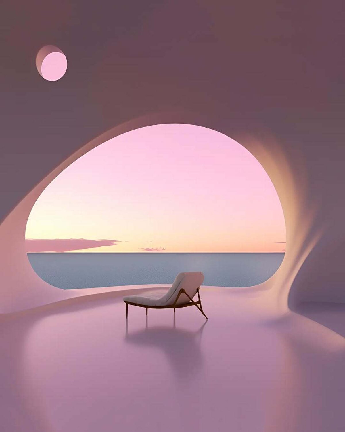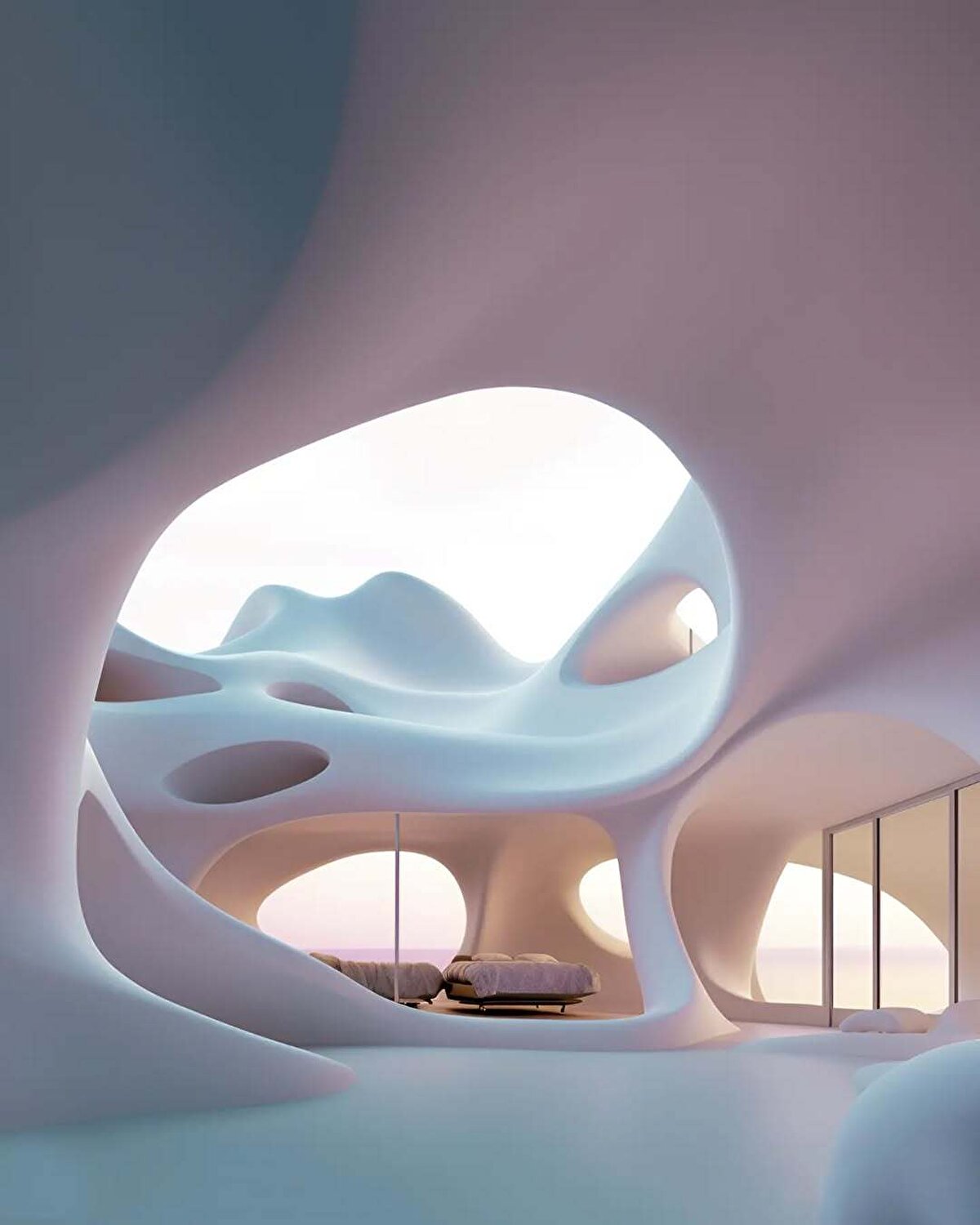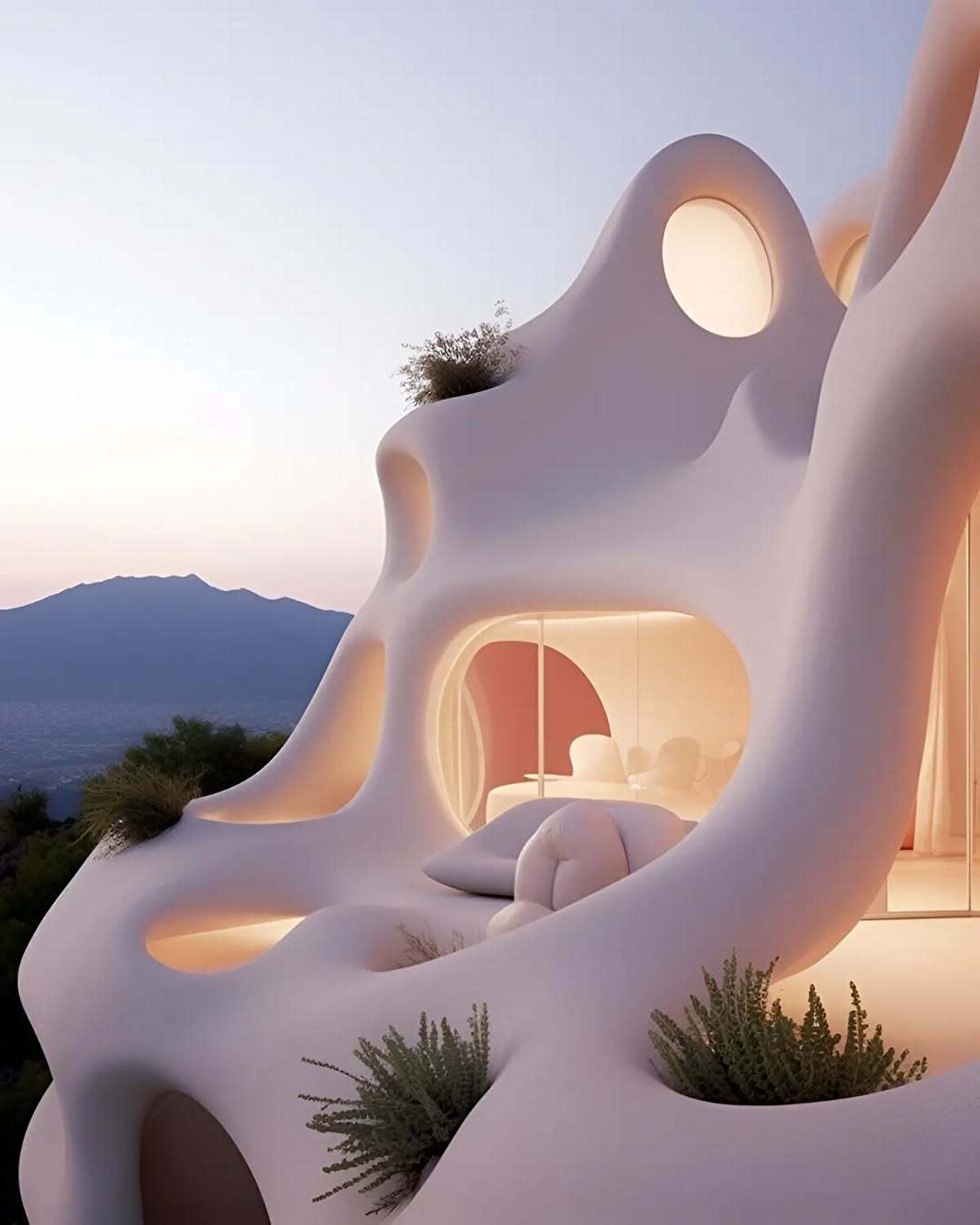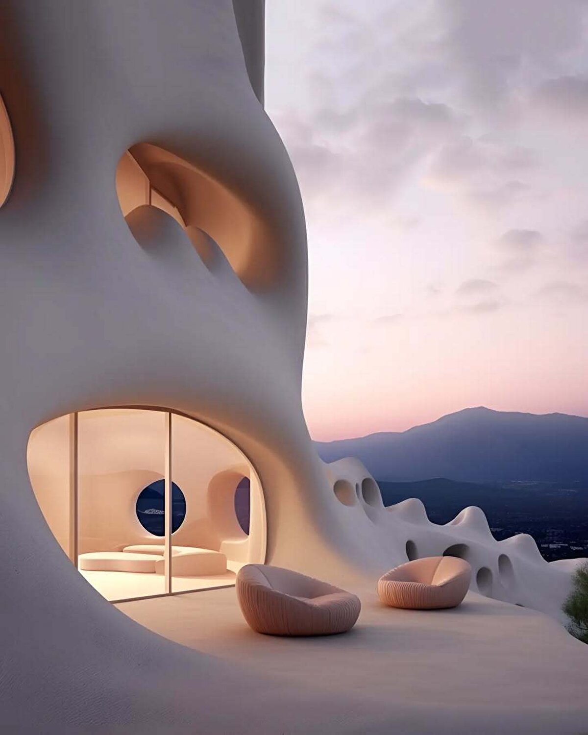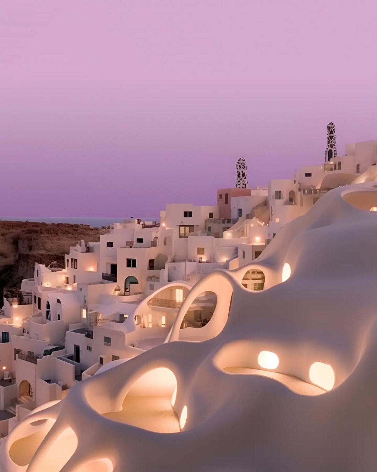 @spathumpa'nın doğal yaşam ile insan yaşamı arasındaki ilişkiye dikkat çekerken fiziki eğriliğin doğallığına da vurgu yaparak tasarladığı bu eser kendine özgü bir formda hayal edilmiş. Santorini'deki beyaz evlerin modern bir dokunuşla dönüştüğü görünümünde olan bu yapılar yapay zekanın hayal gücünü net bir biçimde ortaya koyuyor. Tıpkı deniz dalgalarını andıran bina cephesi geleneksel mimariden çok uzak, farklı ve göz alıcı bir şekilde tasarlanmış. Pastel renklerin dingin atmosferi de bu hayali tasarımın bir bütün haline gelmesini sağlamış. Dijital dokunuşun geleneksel mimari üzerindeki etkisi yapıyı akışkan hale getirerek düz duvarlara, dik kirişlere bağlı kalmadan inşa edilebilecek yapıların geleceği ile ilgili bir ipucu veriliyor.