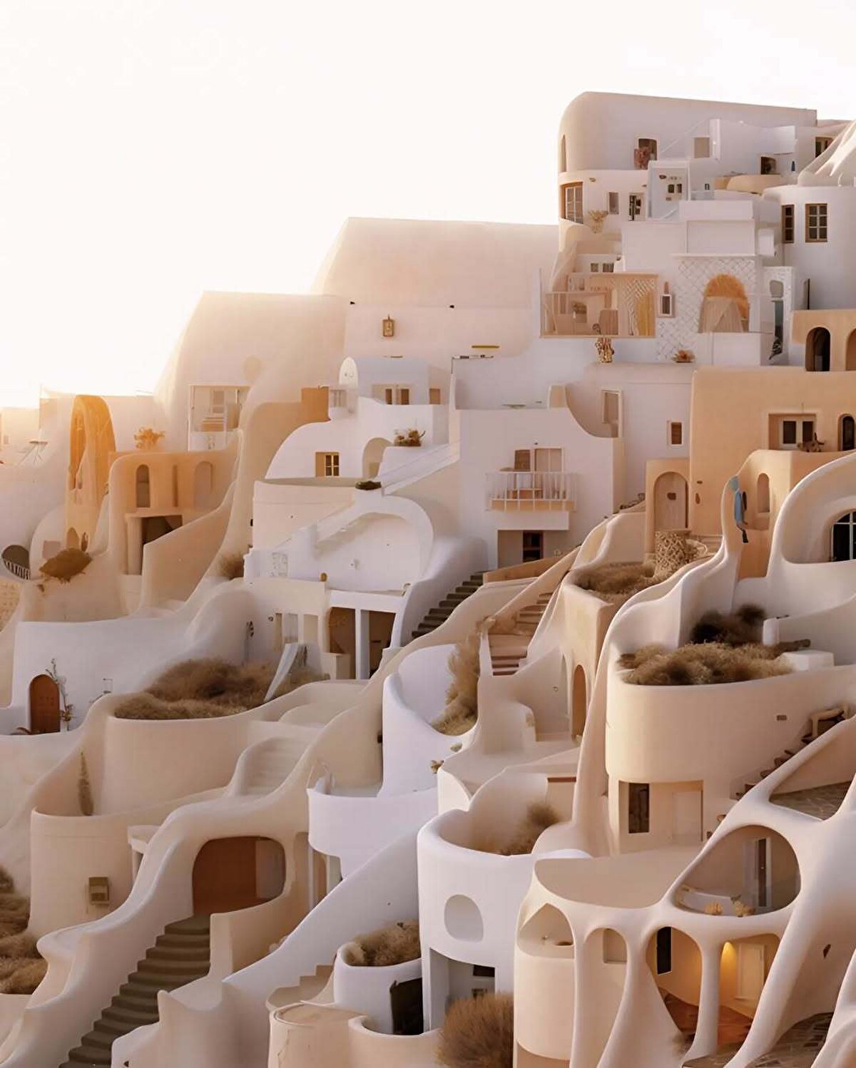 Bu göz alıcı mimari ilk bakışta bir Ege kasabasını andırsa da Yunanistan'da yaşayan mimar ve fotoğrafçı Costas Spathis tarafından yapay zekayla tasarlanmış mimari bir ütopya.