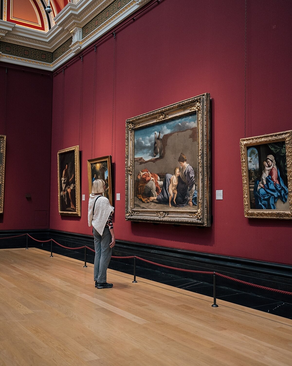 Koleksiyonunda Da Vinci, Van Gogh, Titian, Michelangelo, Borricelli, Raphael, Rembrandt, Monet, Seurat, Caravaggio, Nicolas Oussin, Hans Holbein, Anthony Van Dyck, Johannes Vermeer, George Stubbs ve birçok büyük sanatçının eserlerini barındıran müzede sanat dolu bir kaç saat geçirebilir özellikle de müzenin en önemli eserleri arasında yer alan 'Baptism of Christ', 'The Virgin of the Rocks', 'The Madonna of the Pinks', 'Van Gogh's Chair' ve 'The Rokeby Venus' gibi çok meşhur tabloları yakından görebilirsiniz.
