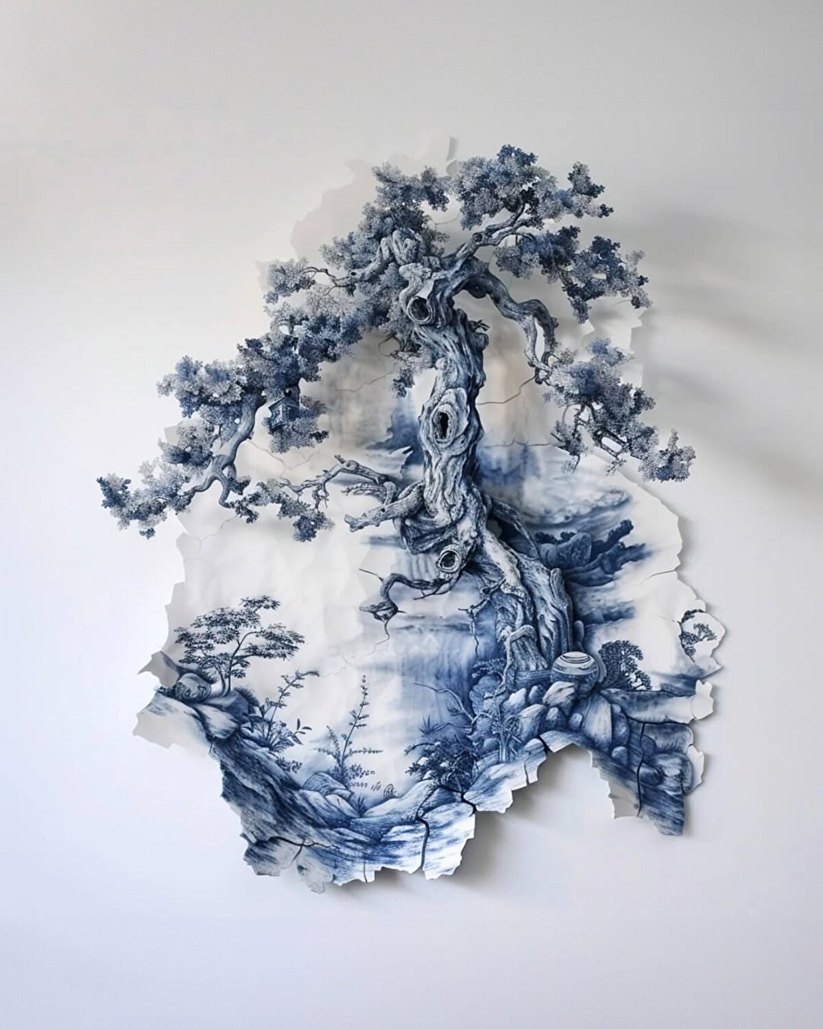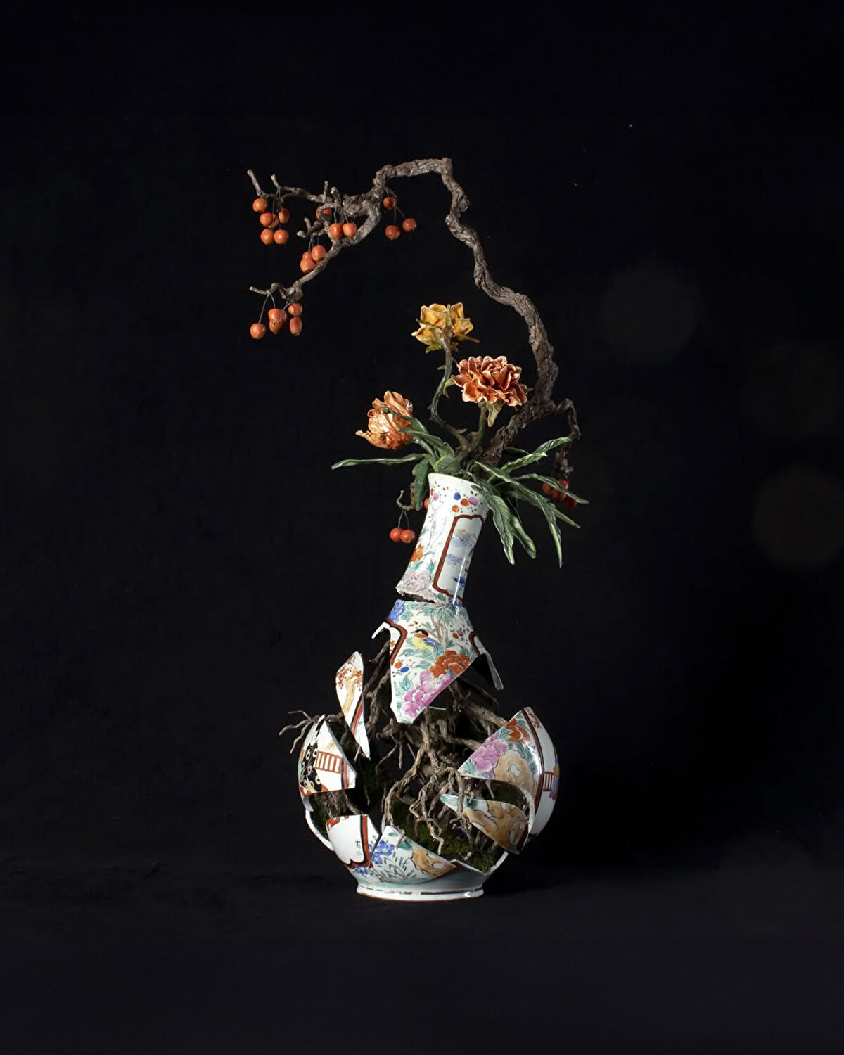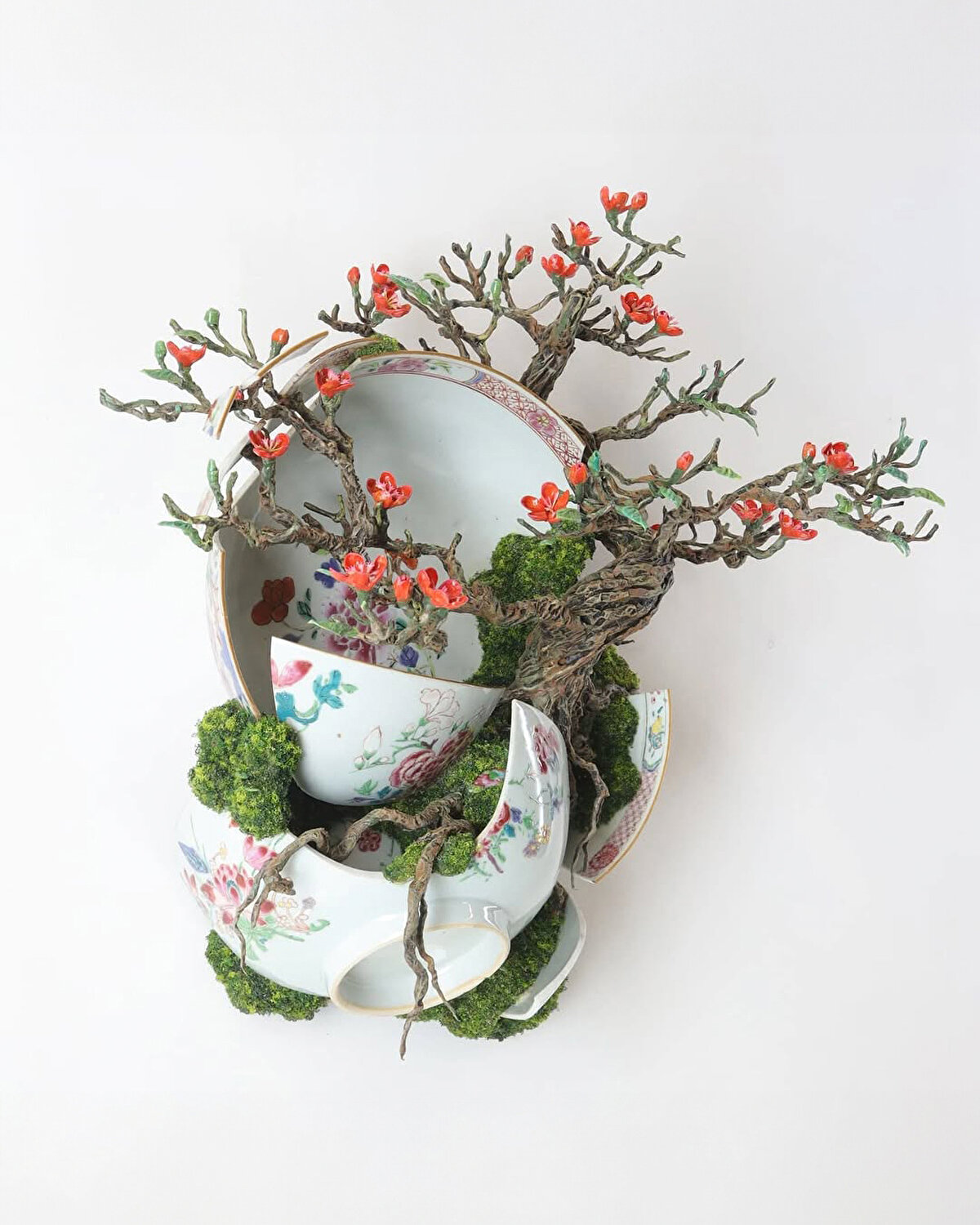 Doğanın köklü gücünü simgeleyen bu vazo eserler aynı zamanda iki farklı materyalin kullanım amaçları dışında farklı bir forma evrilmesini de gözler önüne seriyor. Antika satıcısı bir ailede büyüyen sanatçı dayanıklı ağaç kökleri, yemyeşil yosunlar ve çanak çömlek benzeri eşyaları birlikte kullanarak sanat ve tarihi gözlemi aynı anda izleyicisine sunuyor. Eserleriyle aynı zamanda Japon Kintsugi sanatına da gönderme yapan @patrickbergsma.nl, kırık eşyaları bir kusur olarak görmek yerine akla gelmeyen bir amaçla kullanımına yön veriyor. Sonradan birleştirilen kırık vazoların içinden çıkan çiçek ve bitkiler belki de umudun bir göstergesi. Farklı desenlerdeki renkli seramikler, ağaç köklerini öylesine sahiplenici çevreliyor ki bu birleşimden ortaya çıkan rengarenk tomurcuk ve çiçekler de bunun en iyi örneği haline geliyor.